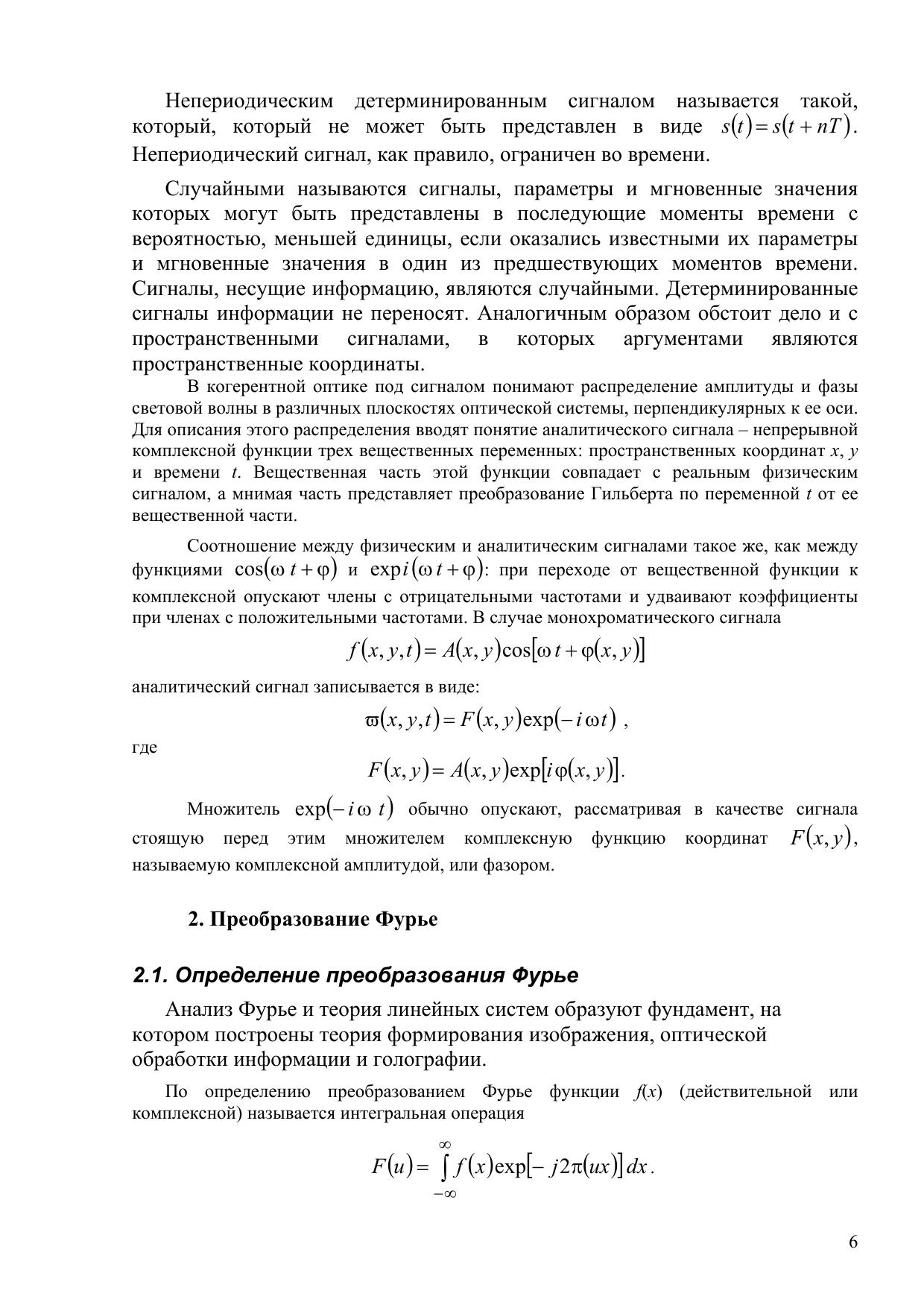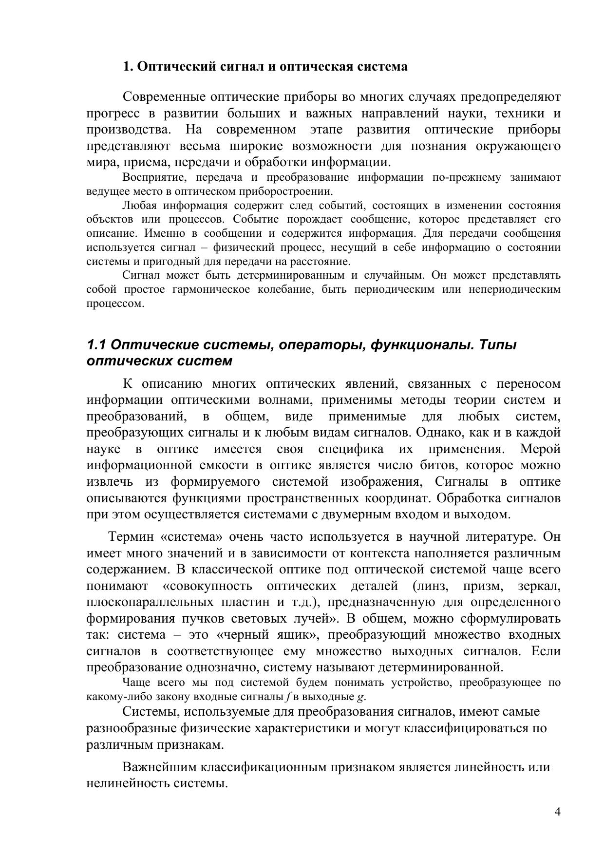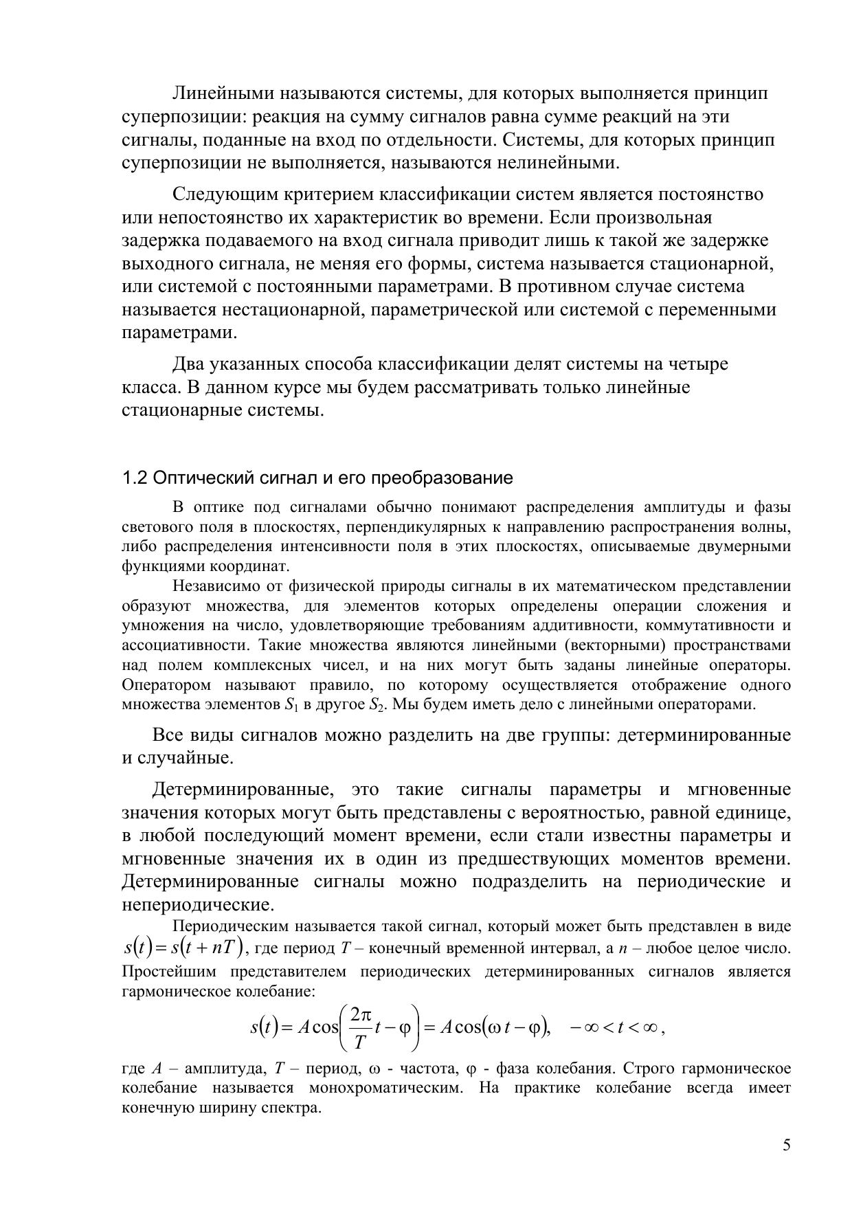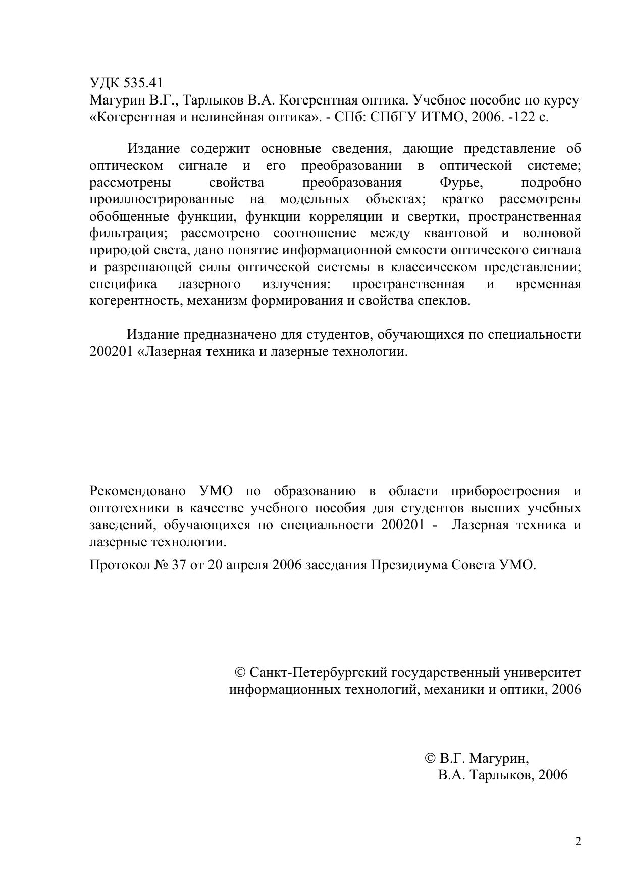 Издание содержит основные сведения, дающие представление об оптическом сигнале и его преобразовании в оптической системе рассмотрены свойства преобразования Фурье, подробно проиллюстрированные на модельных объектах кратко рассмотрены обобщенные функции, функции корреляции и свертки, пространственная фильтрация рассмотрено соотношение между квантовой и волновой природой света, дано понятие информационной емкости оптического сигнала и разрешающей силы оптической системы в классическом представлении специфика лазерного излучения: пространственная и временная когерентность, механизм формирования и свойства спеклов.