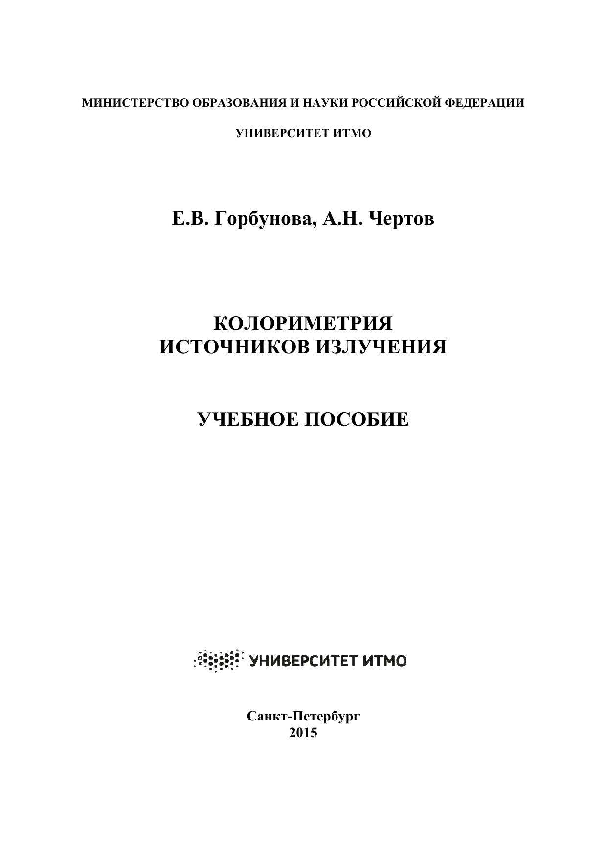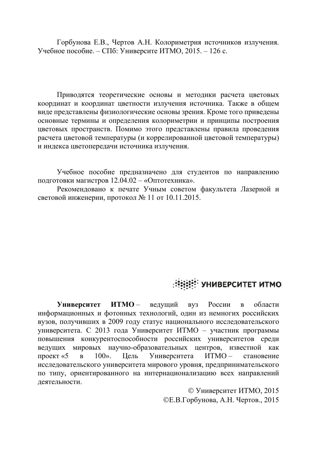 Приводятся теоретические основы и методики расчета цветовых координат и координат цветности излучения источника. Также в общем виде представлены физиологические основы зрения. Кроме того приведены основные термины и определения колориметрии и принципы построения цветовых пространств. Помимо этого представлены правила проведения расчета цветовой температуры (и коррелированной цветовой температуры) и индекса цветопередачи источника излучения. Учебное пособие предназначено для студентов по направлению подготовки магистров 12.04.02 – «Оптотехника». Рекомендовано к печате Учным советом факультета Лазерной и световой инженерии, протокол № 11 от 10.11.2015.
