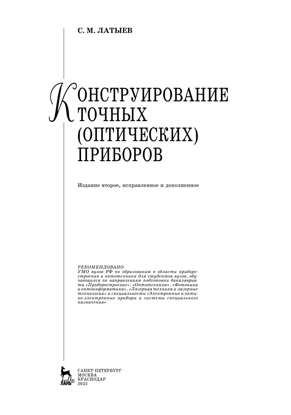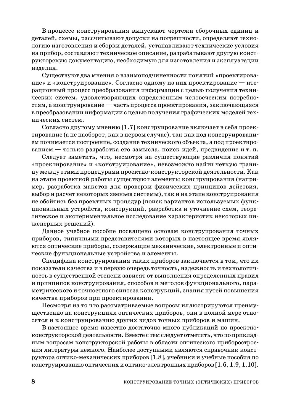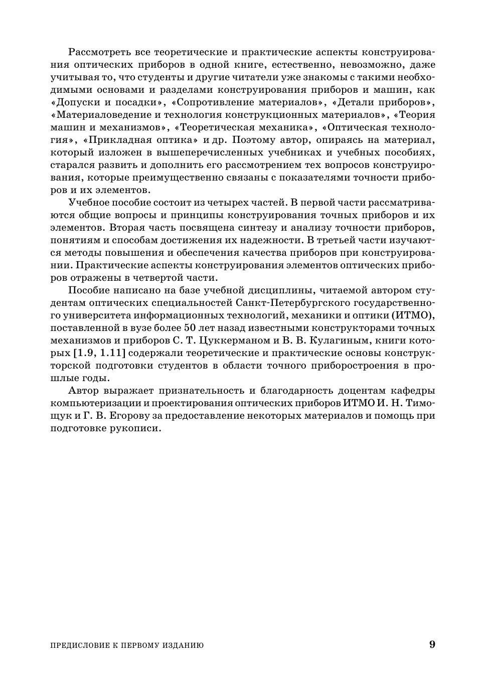 Учебное пособие посвящено основам конструирования современных точных приборов, типичными представителями которых являются оптические приборы, содержащие в своем составе механические, электронные и оптические функциональные устройства и элементы. Специфика конструирования таких приборов заключается в том, что их показатели качества и в первую очередь показатели точности, технологичности и надежности в существенной степени зависят от выполнения определенных методов, правил и принципов конструирования, способов и методов параметрического и точностного синтеза конструкций, знаний путей и приемов повышения целевых показателей качества при проектировании. Книга состоит из четырех частей. В первой части рассматриваются методы, общие правила и принципы конструирования точных приборов и их элементов. Во второй — излагаются основы теории точности и понятия надежности приборов. Третья часть посвящена современным методам повышения качества приборов при проектировании, включая алгоритмическую (цифровую) коррекцию погрешностей. В четвертой части приводятся типовые конструкции сборочных единиц и элементов точных приборов, рассматриваются способы их юстировки и контроля. Учебное пособие предназначено для студентов, магистрантов, аспирантов и преподавателей высших учебных заведений приборостроительного профиля, а также инженерно-технических работников промышленности.