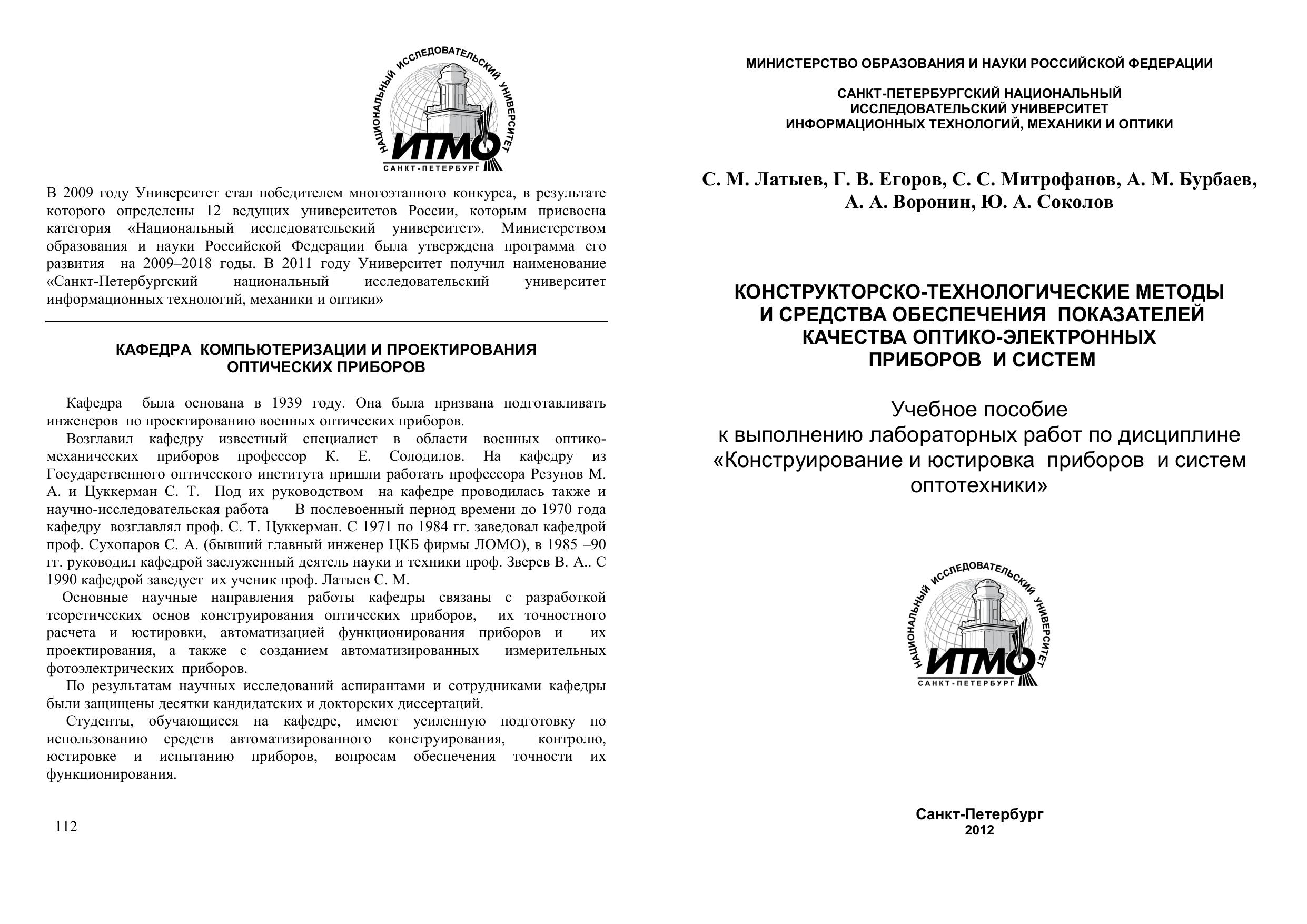 Учебное пособие к выполнению лабораторных работ по дисциплине «Конструирование и юстировка приборов и систем оптотехники».