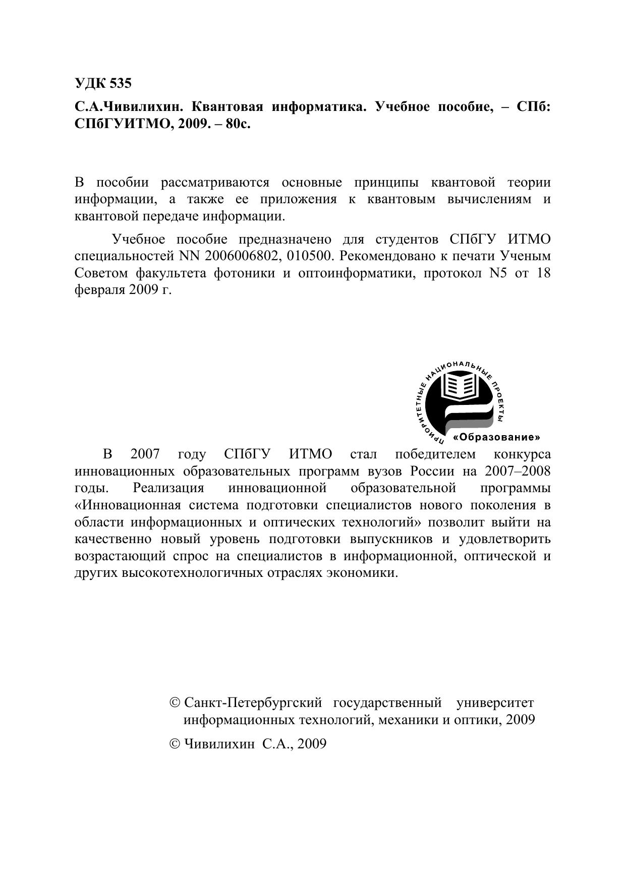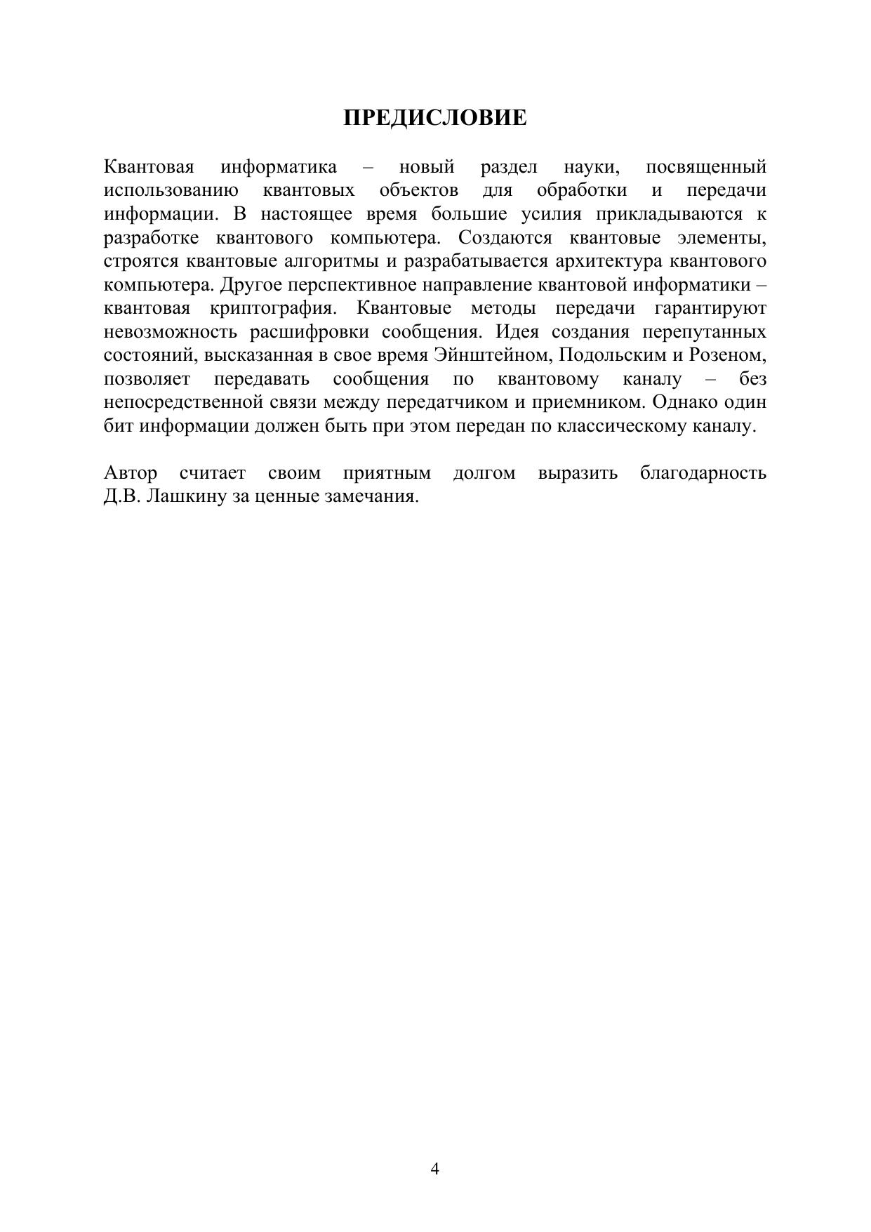 В пособии рассматриваются основные принципы квантовой теории информации, а также ее приложения к квантовым вычислениям и квантовой передаче информации.