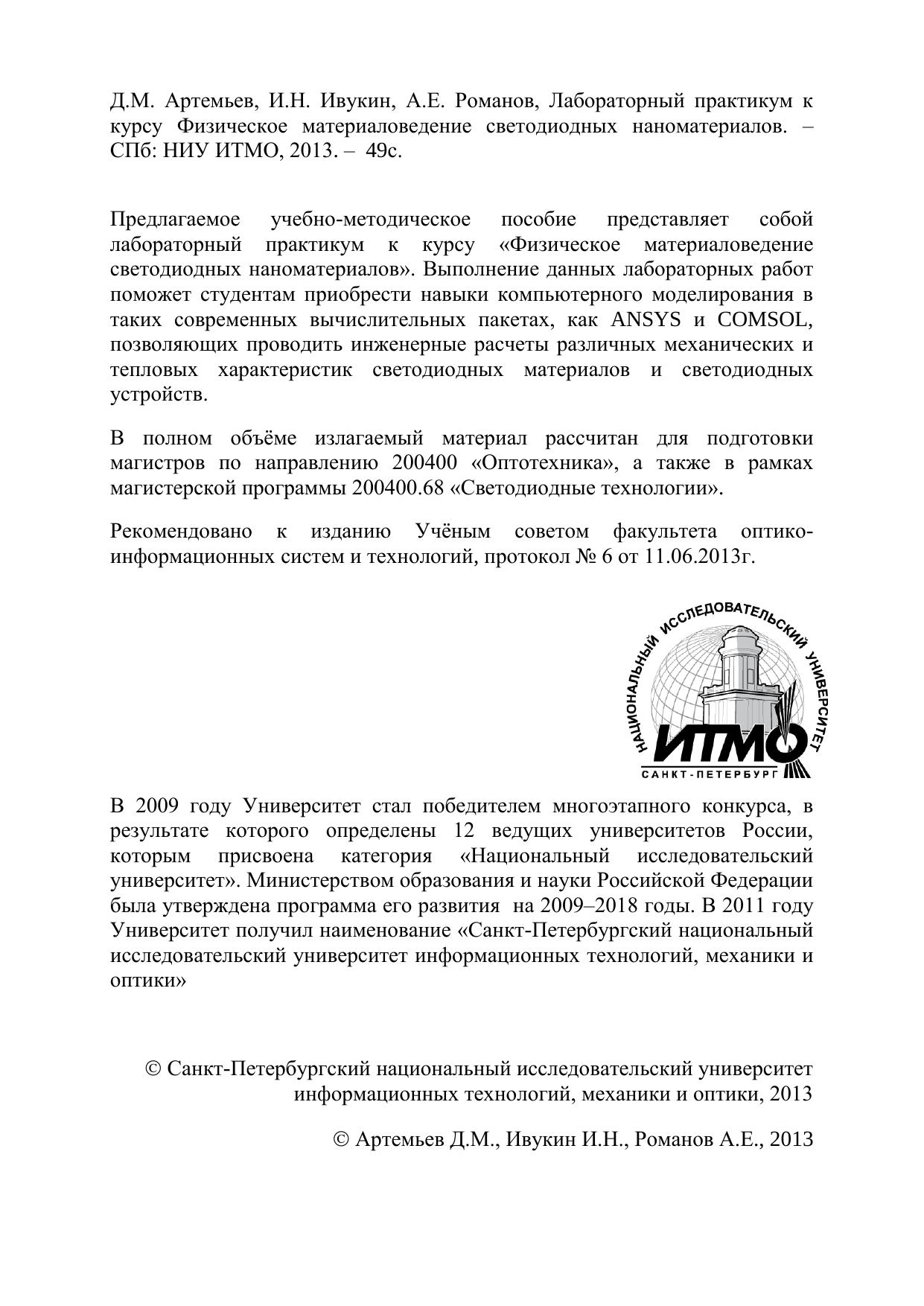 Предлагаемое учебно-методическое пособие представляет собой лабораторный практикум к курсу «Физическое материаловедение светодиодных наноматериалов». Выполнение данных лабораторных работ поможет студентам приобрести навыки компьютерного моделирования в таких современных вычислительных пакетах, как ANSYS и COMSOL, позволяющих проводить инженерные расчеты различных механических и тепловых характеристик светодиодных материалов и светодиодныхустройств. В полном объёме излагаемый материал рассчитан для подготовки магистров по направлению 200400 «Оптотехника», а также в рамках магистерской программы 200400.68 «Светодиодные технологии».