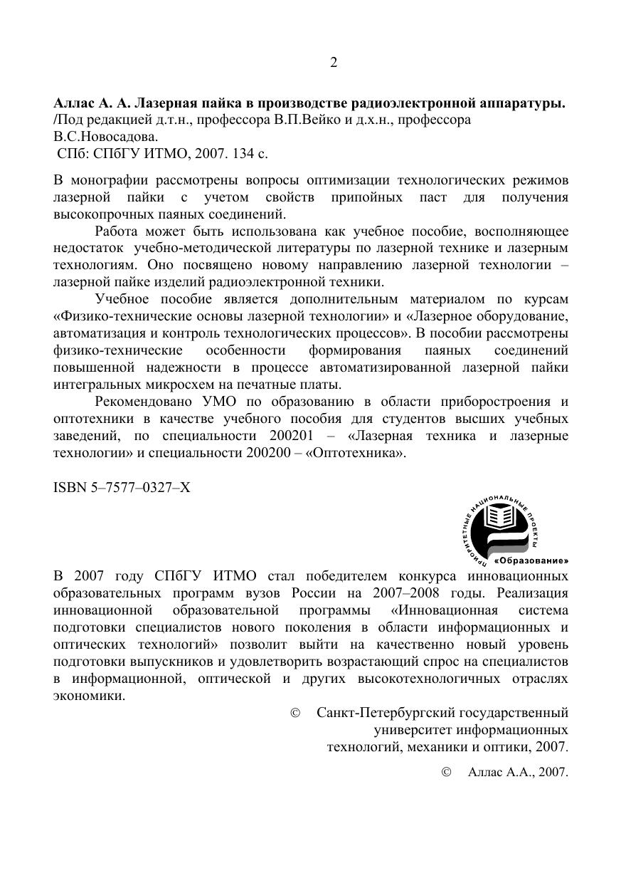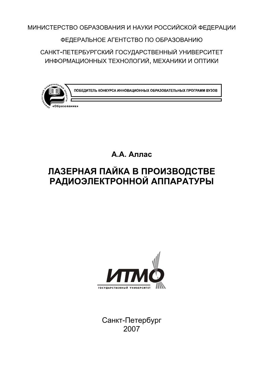 В монографии рассмотрены вопросы оптимизации технологических режимов лазерной пайки с учетом свойств припойных паст для получения высокопрочных паяных соединений. Работа может быть использована как учебное пособие, восполняющее недостаток учебно-методической литературы по лазерной технике и лазерным технологиям. Оно посвящено новому направлению лазерной технологии –лазерной пайке изделий радиоэлектронной техники. Учебное пособие является дополнительным материалом по курсам «Физико-технические основы лазерной технологии» и «Лазерное оборудование, автоматизация и контроль технологических процессов». В пособии рассмотрены физико-технические особенности формирования паяных соединений повышенной надежности в процессе автоматизированной лазерной пайки интегральных микросхем на печатные платы.