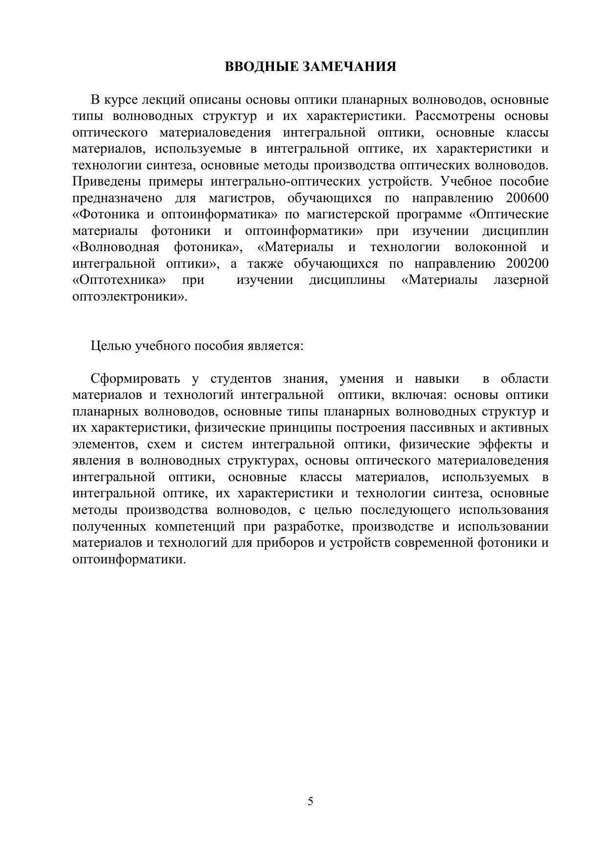 В курсе лекций описаны основы оптики планарных волноводов, основные типы волноводных структур и их характеристики. Рассмотрены основы оптического материаловедения интегральной оптики, основные классы материалов, используемые в интегральной оптике, их характеристики и технологии синтеза, основные методы производства оптических волноводов. Приведены примеры интегрально-оптических устройств. Учебное пособие предназначено для магистров, обучающихся по направлению 200600 «Фотоника и оптоинформатика» по магистерской программе «Оптические материалы фотоники и оптоинформатики» при изучении дисциплин «Волноводная фотоника», «Материалы и технологии волоконной и интегральной оптики», а также обучающихся по направлению 200200 «Оптотехника» при изучении дисциплины «Материалы лазерной оптоэлектроники».