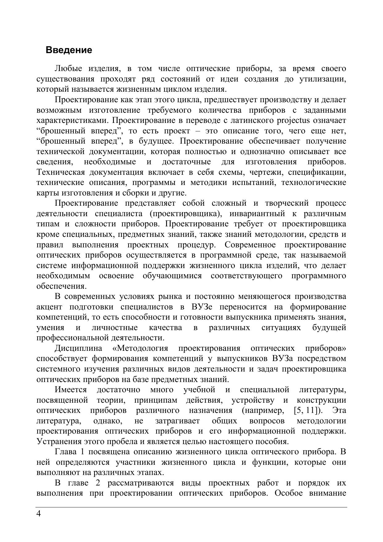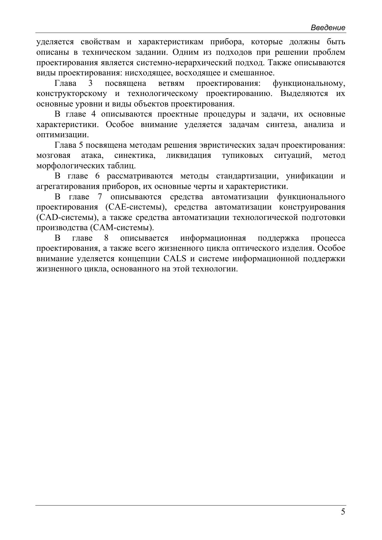 Учебное пособие подготовлено на кафедре прикладной и компьютерной оптики (П и КО) СПбГУ ИТМО и предназначено для подготовки студентов по направлению 200200 «Оптотехника». В пособии излагаются общие принципы проектирования оптических приборов, описываются уровни и ветви проектирования. Описываются проектные процедуры и задачи, а также методы и средства проектирования. Рассматривается современная концепция информационной поддержки жизненного цикла оптического изделия.