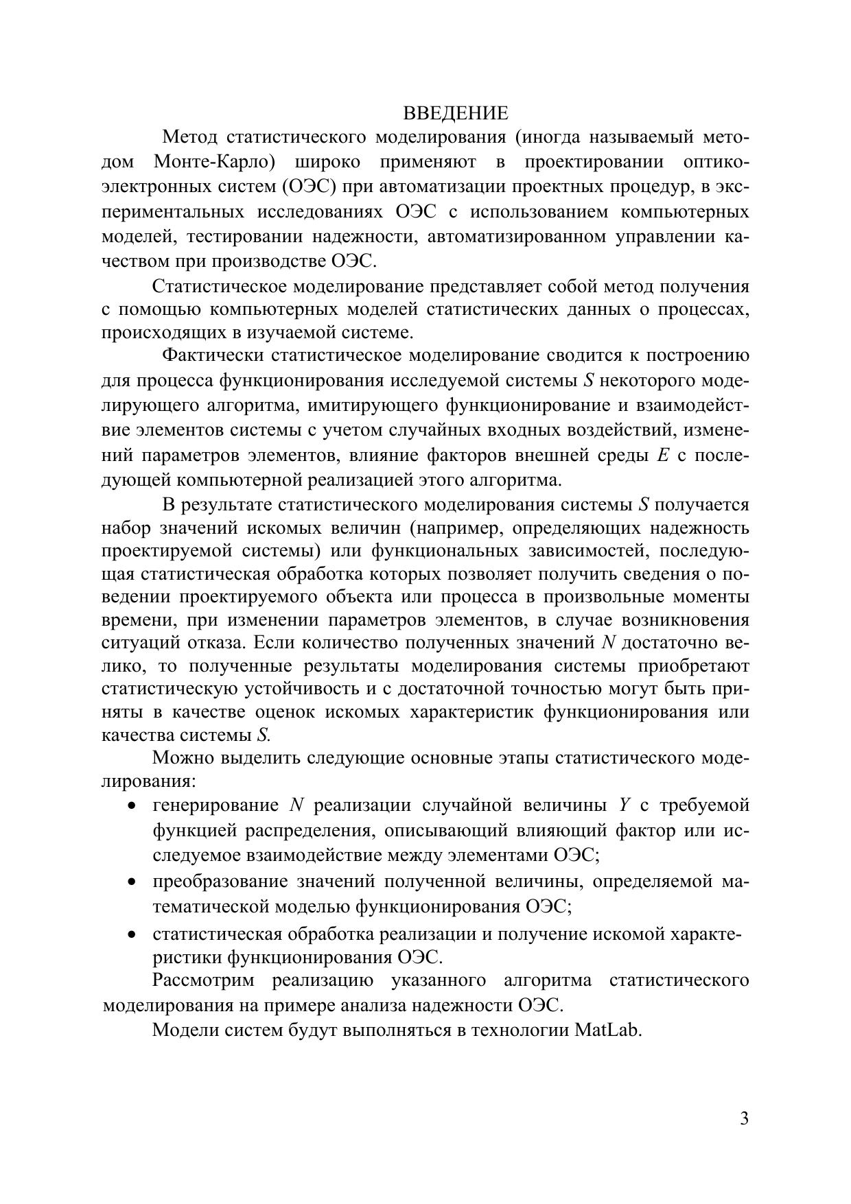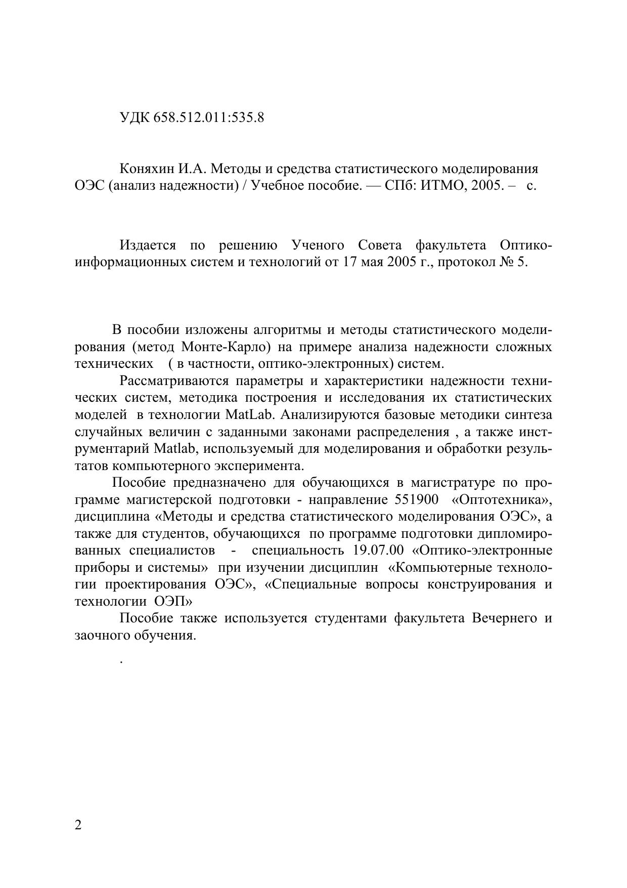 В пособии изложены алгоритмы и методы статистического моделирования (метод Монте-Карло) на примере анализа надежности сложных технических ( в частности, оптико-электронных) систем. Рассматриваются параметры и характеристики надежности технических систем, методика построения и исследования их статистических моделей в технологии MatLab. Анализируются базовые методики синтеза случайных величин с заданными законами распределения , а также инструментарий Matlab, используемый для моделирования и обработки результатов компьютерного эксперимента. Пособие предназначено для обучающихся в магистратуре по программе магистерской подготовки - направление 551900 «Оптотехника», дисциплина «Методы и средства статистического моделирования ОЭС», а также для студентов, обучающихся по программе подготовки дипломированных специалистов - специальность 19.07.00 «Оптико-электронные приборы и системы» при изучении дисциплин «Компьютерные технологии проектирования ОЭС», «Специальные вопросы конструирования и технологии ОЭП».
