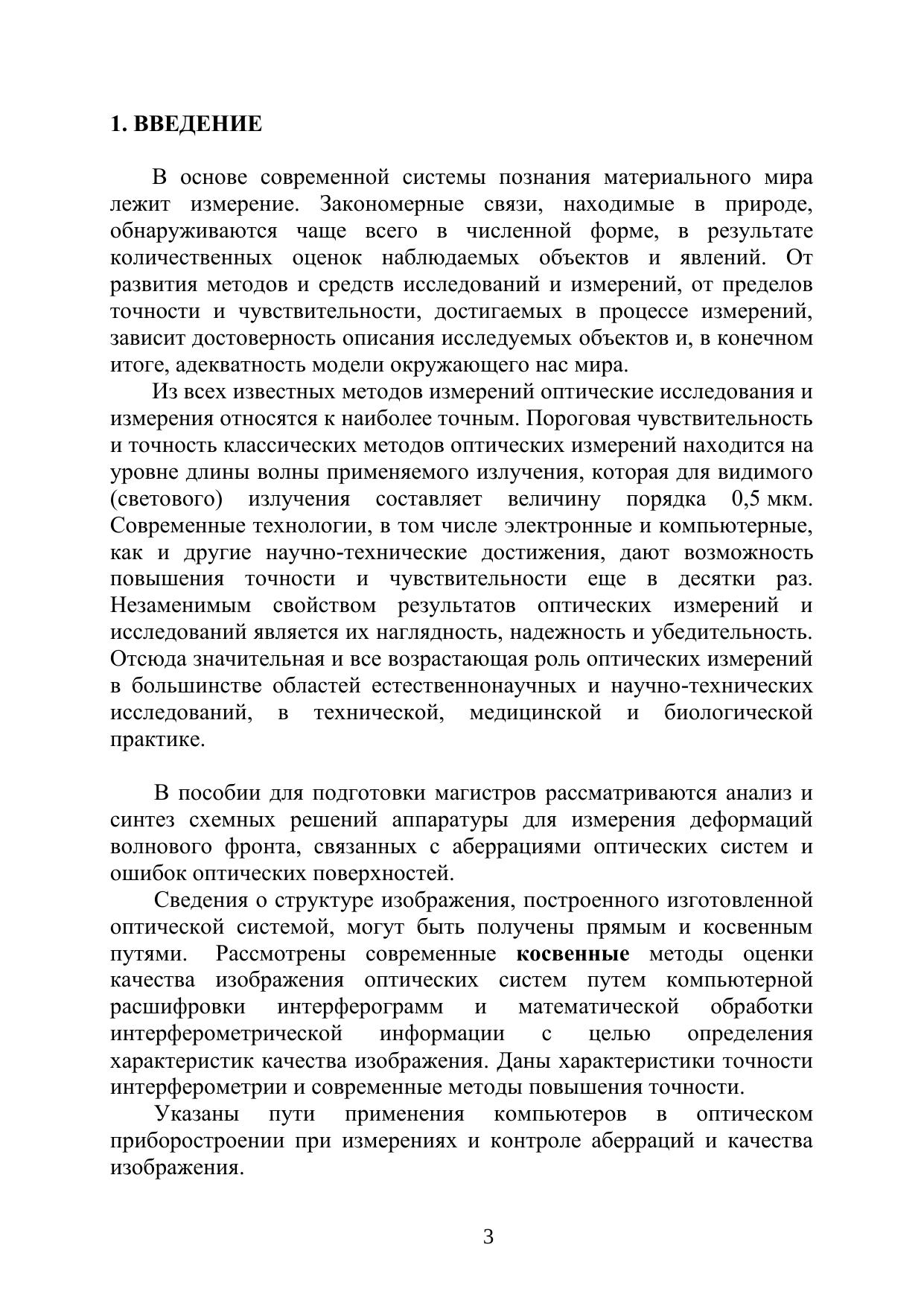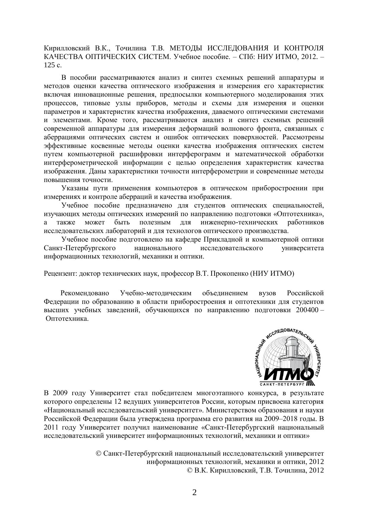 В пособии рассматриваются анализ и синтез схемных решений аппаратуры и методов оценки качества оптического изображения и измерения его характеристик включая инновационные решения, предпосылки компьютерного моделирования этихпроцессов, типовые узлы приборов, методы и схемы для измерения и оценки параметров и характеристик качества изображения, даваемого оптическими системами и элементами. Кроме того, рассматриваются анализ и синтез схемных решенийсовременной аппаратуры для измерения деформаций волнового фронта, связанных с аберрациями оптических систем и ошибок оптических поверхностей. Рассмотрены эффективные косвенные методы оценки качества изображения оптических системпутем компьютерной расшифровки интерферограмм и математической обработки интерферометрической информации с целью определения характеристик качества изображения. Даны характеристики точности интерферометрии и современные методы повышения точности. Указаны пути применения компьютеров в оптическом приборостроении при измерениях и контроле аберраций и качества изображения. Учебное пособие предназначено для студентов оптических специальностей, изучающих методы оптических измерений по направлению подготовки «Оптотехника», а также может быть полезным для инженерно-технических работников исследовательских лабораторий и для технологов оптического производства.
