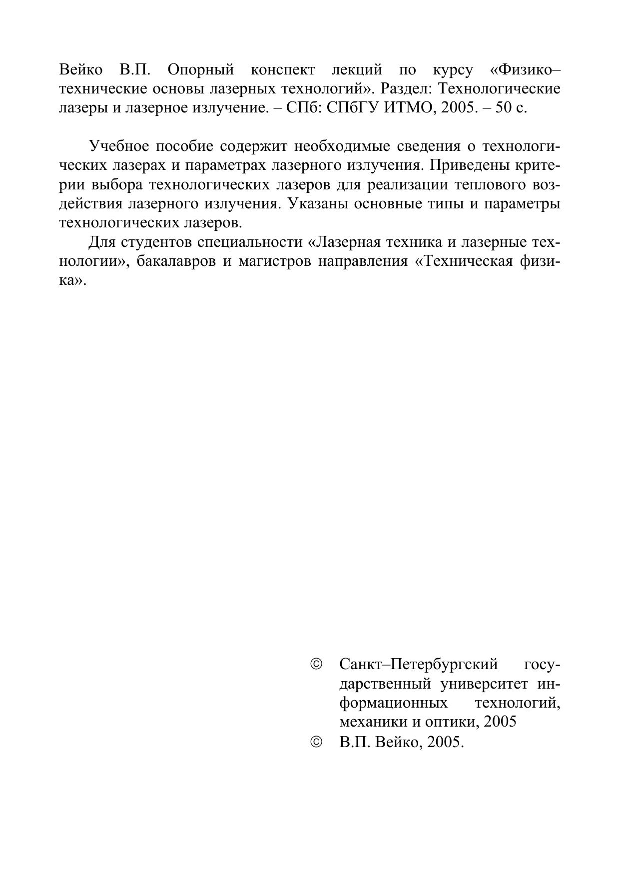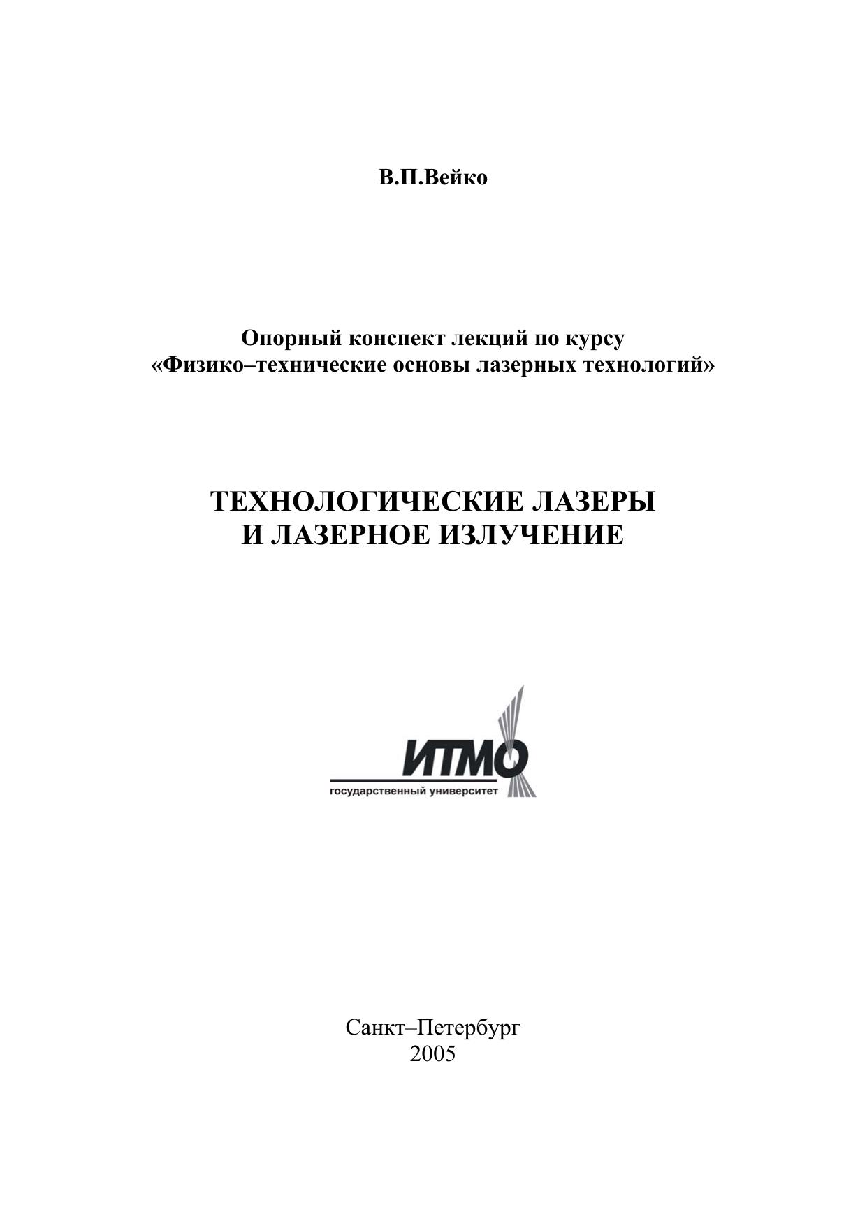 Опорный конспект лекций по курсу «Физико-технические основы лазерных технологий». Раздел: Технологические лазеры и лазерное излечение