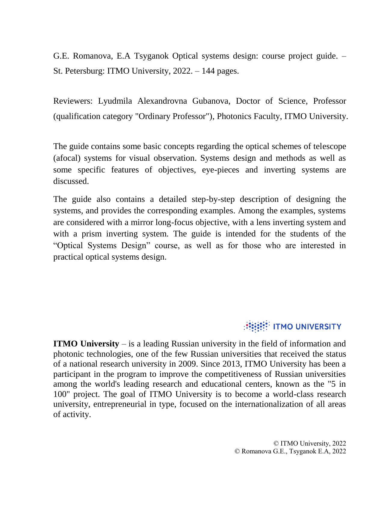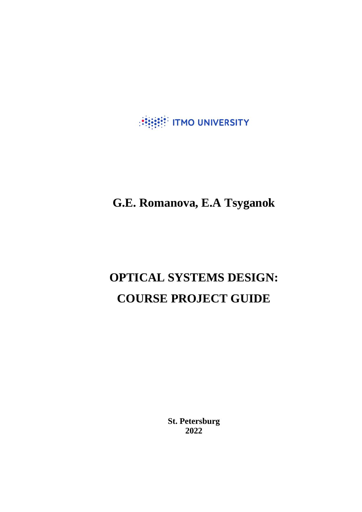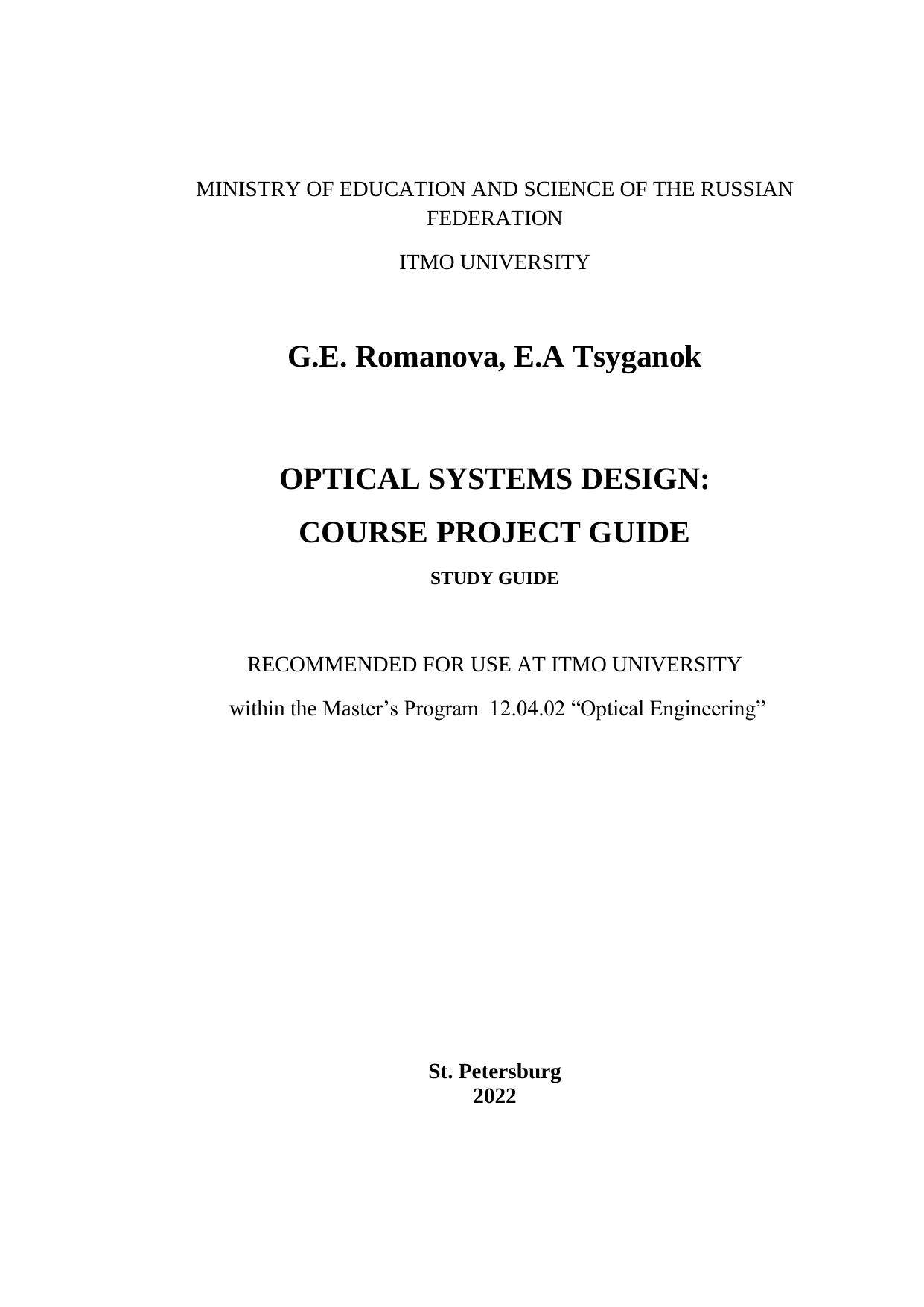 The guide also contains a detailed step-by-step description of designing the systems, and provides the corresponding examples. Among the examples, systems are considered with a mirror long-focus objective, with a lens inverting system and with a prism inverting system. The guide is intended for the students of the “Optical Systems Design” course, as well as for those who are interested in practical optical systems design.