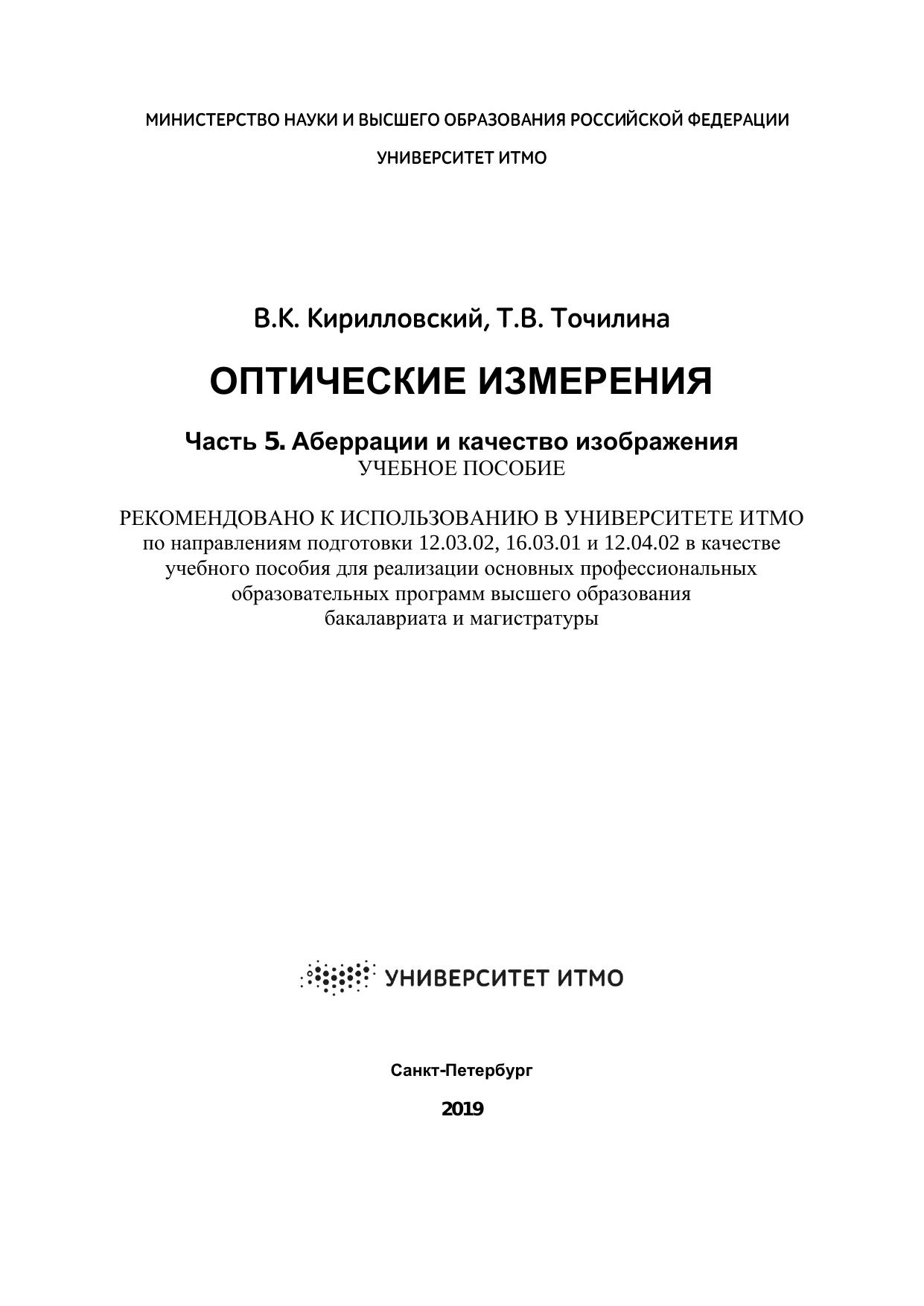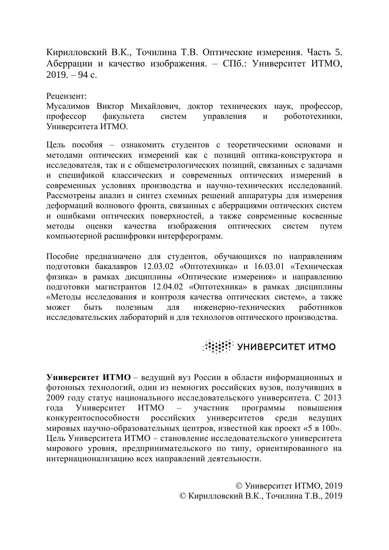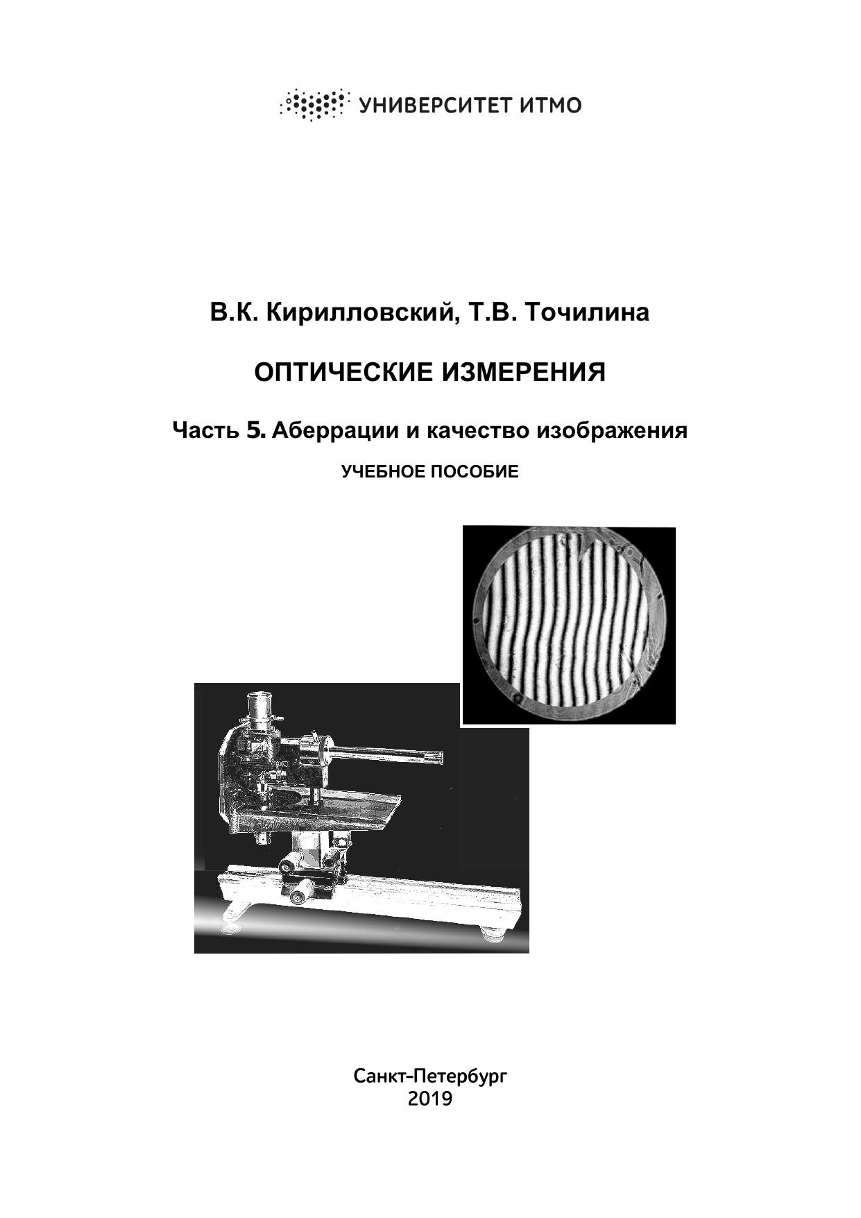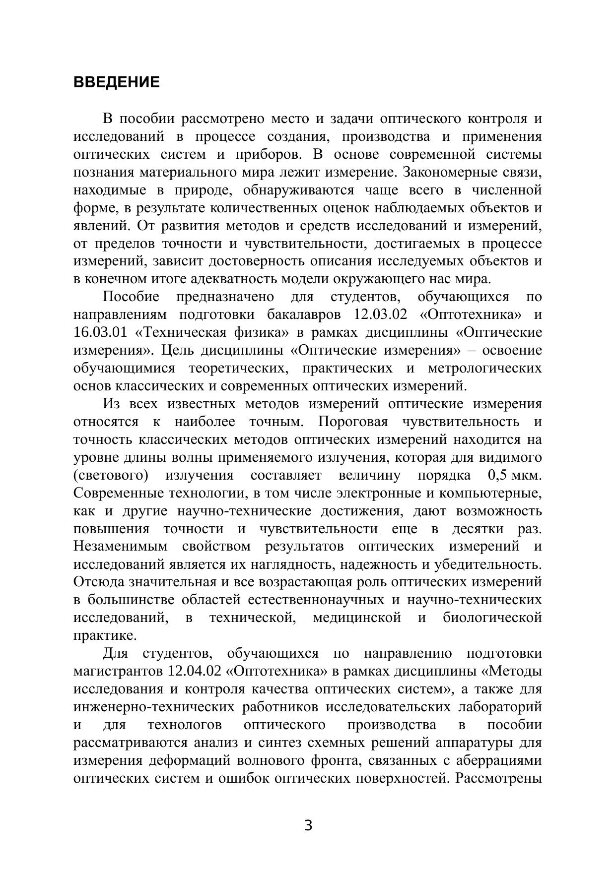 Пособие предназначено для студентов, обучающихся по направлениям подготовки бакалавров 12.03.02 «Оптотехника» и 16.03.01 «Техническая физика» в рамках дисциплины «Оптические измерения» и направлению подготовки магистрантов 12.04.02 «Оптотехника» в рамках дисциплины «Методы исследования и контроля качества оптических систем», а также может быть полезным для инженерно-технических работников исследовательских лабораторий и для технологов оптического производства.