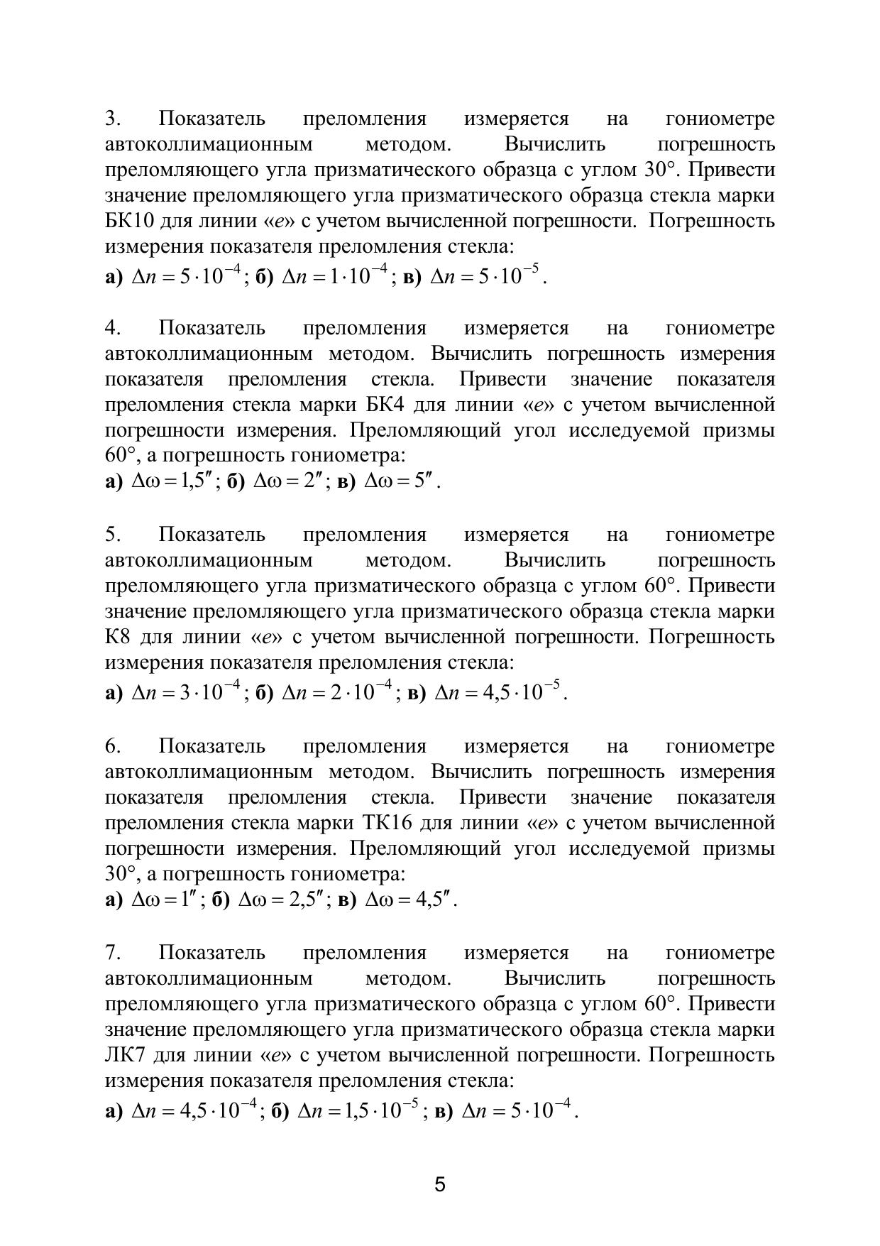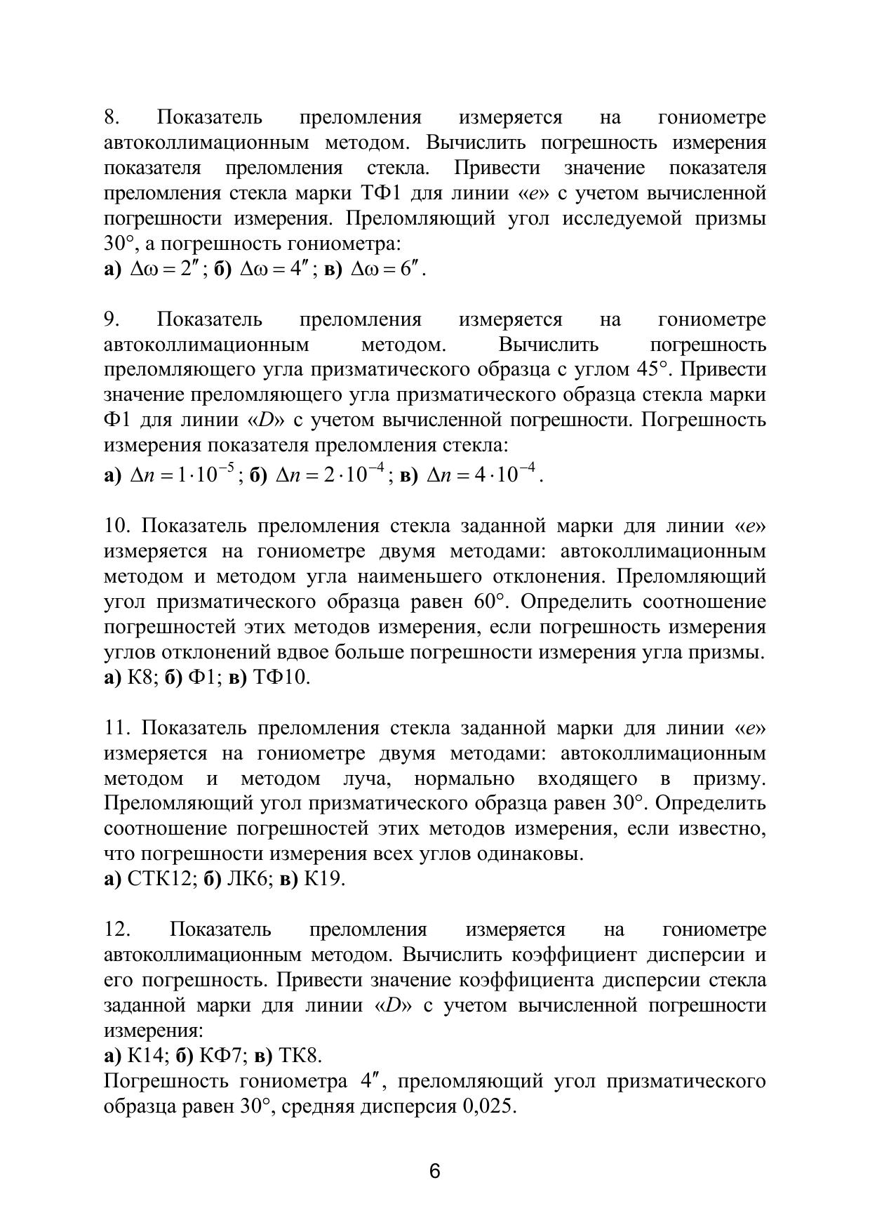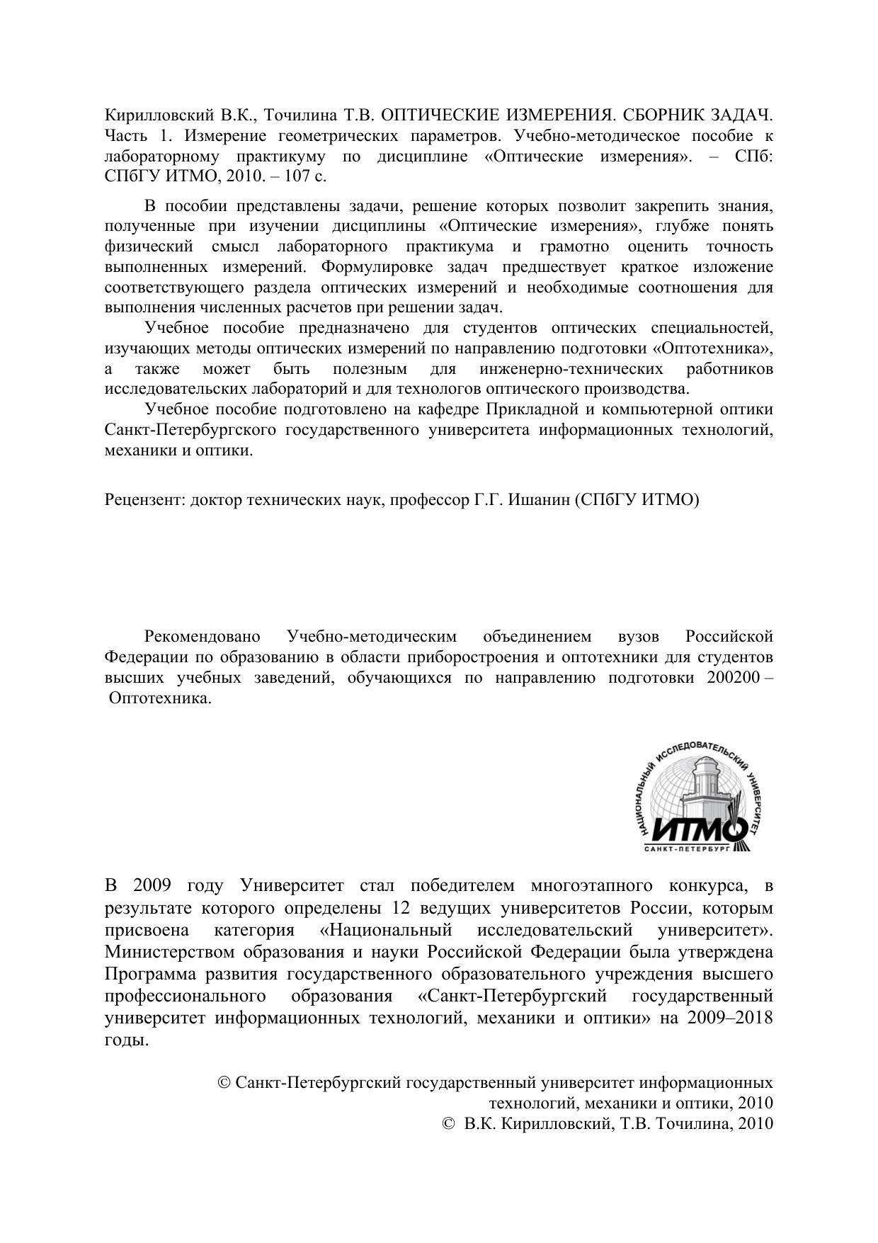 В пособии представлены задачи, решение которых позволит закрепить знания, полученные при изучении дисциплины «Оптические измерения», глубже понять физический смысл лабораторного практикума и грамотно оценить точность выполненных измерений. Формулировке задач предшествует краткое изложение соответствующего раздела оптических измерений и необходимые соотношения для выполнения численных расчетов при решении задач. Учебное пособие предназначено для студентов оптических специальностей, изучающих методы оптических измерений по направлению подготовки «Оптотехника», а также может быть полезным для инженерно-технических работников исследовательских лабораторий и для технологов оптического производства. Учебное пособие подготовлено на кафедре Прикладной и компьютерной оптики Санкт-Петербургского государственного университета информационных технологий, механики и оптики.