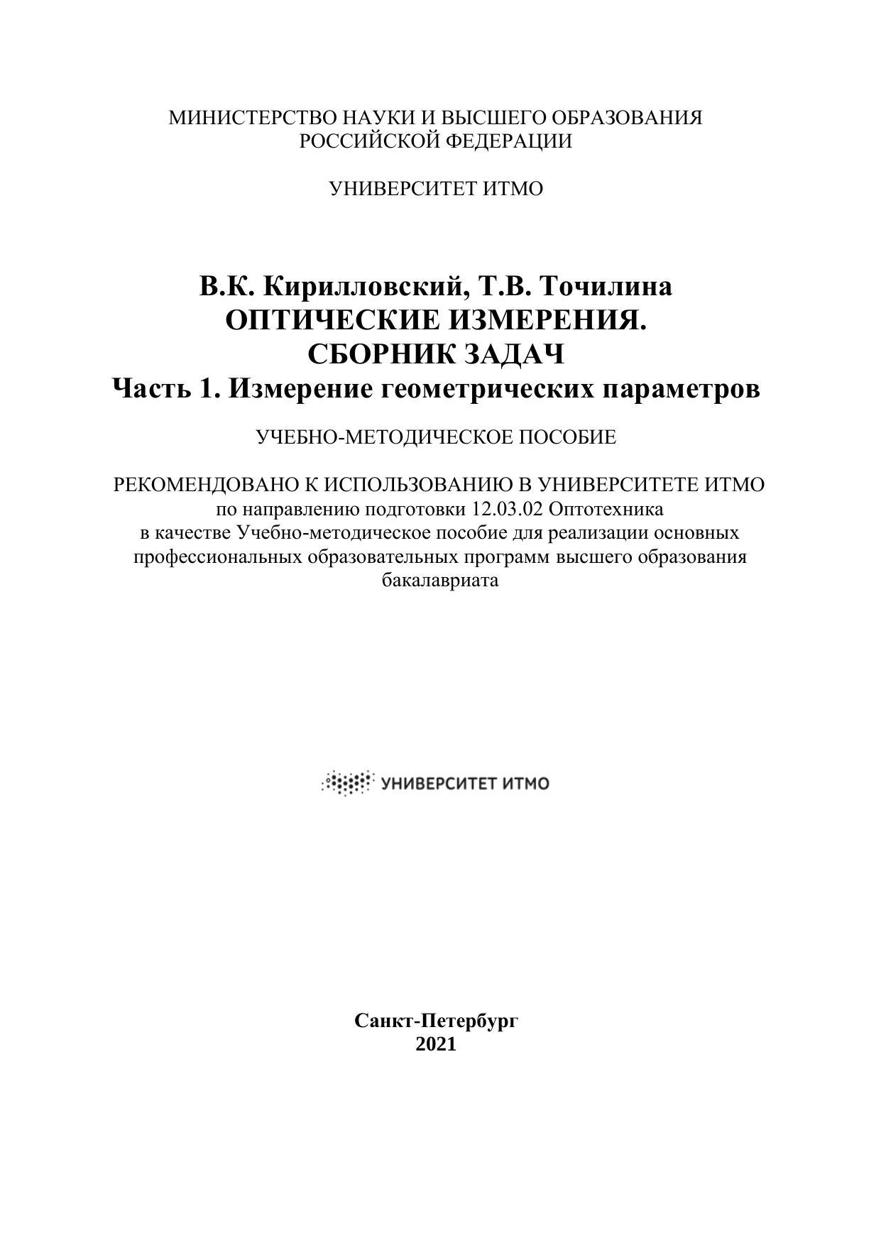 Оптические измерения. Сборник задач. Часть 1. Измерение геометрических параметров