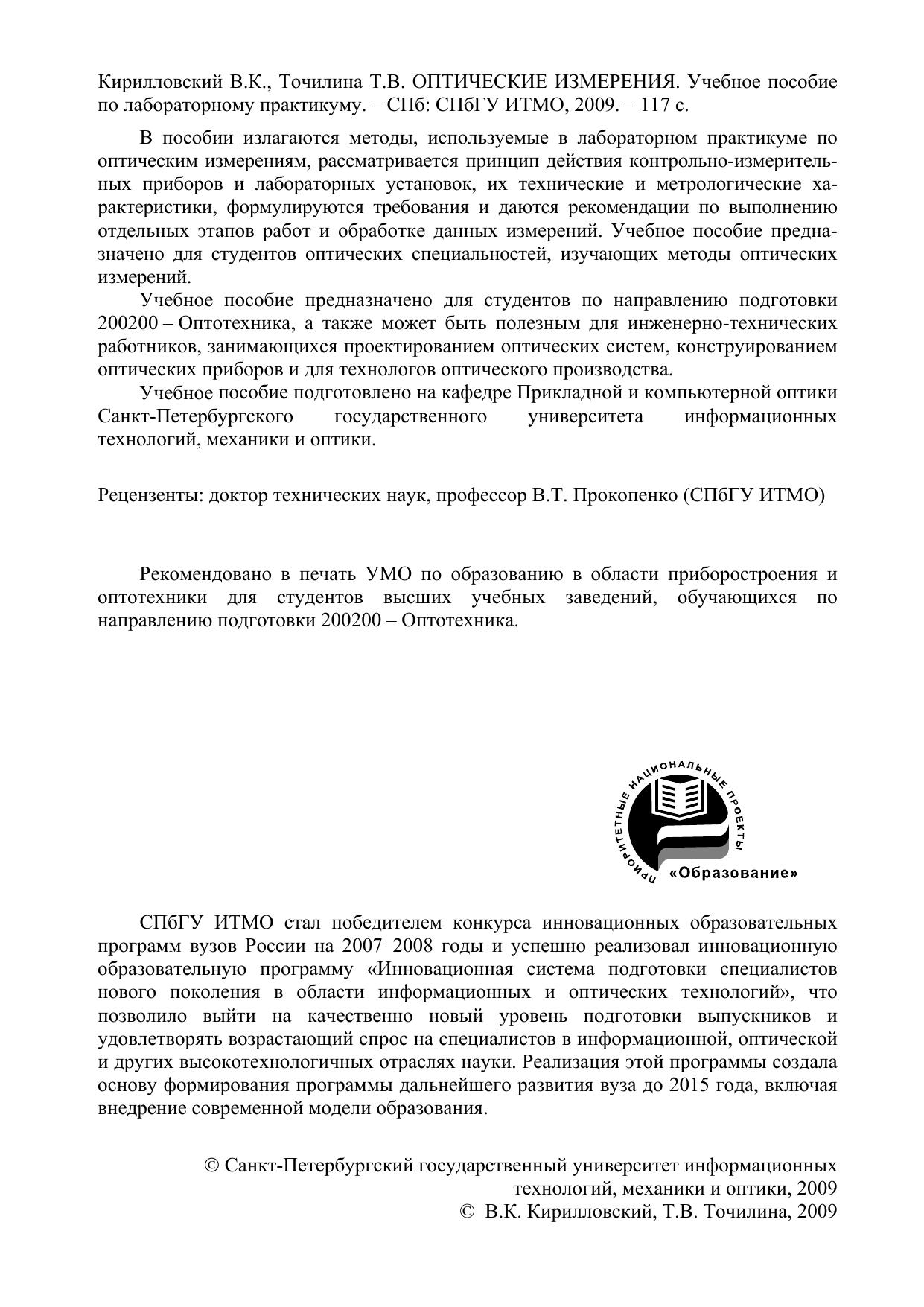 В пособии излагаются методы, используемые в лабораторном практикуме по оптическим измерениям, рассматривается принцип действия контрольно-измерительных приборов и лабораторных установок, их технические и метрологические характеристики, формулируются требования и даются рекомендации по выполнению отдельных этапов работ и обработке данных измерений. Учебное пособие предназначено для студентов оптических специальностей, изучающих методы оптическихизмерений. Учебное пособие предназначено для студентов по направлению подготовки 200200 – Оптотехника, а также может быть полезным для инженерно-технических работников, занимающихся проектированием оптических систем, конструированием оптических приборов и для технологов оптического производства.