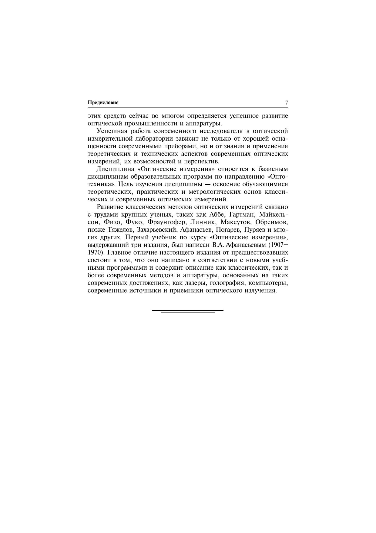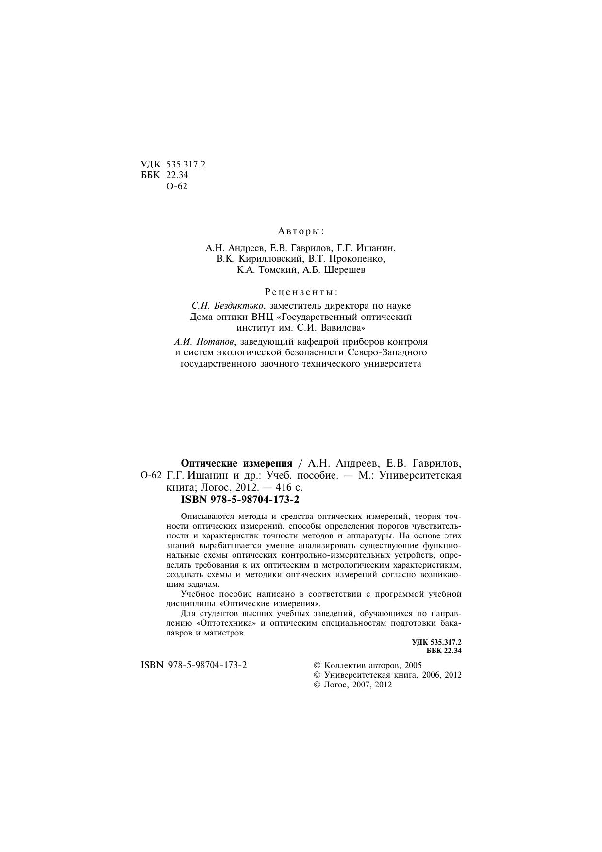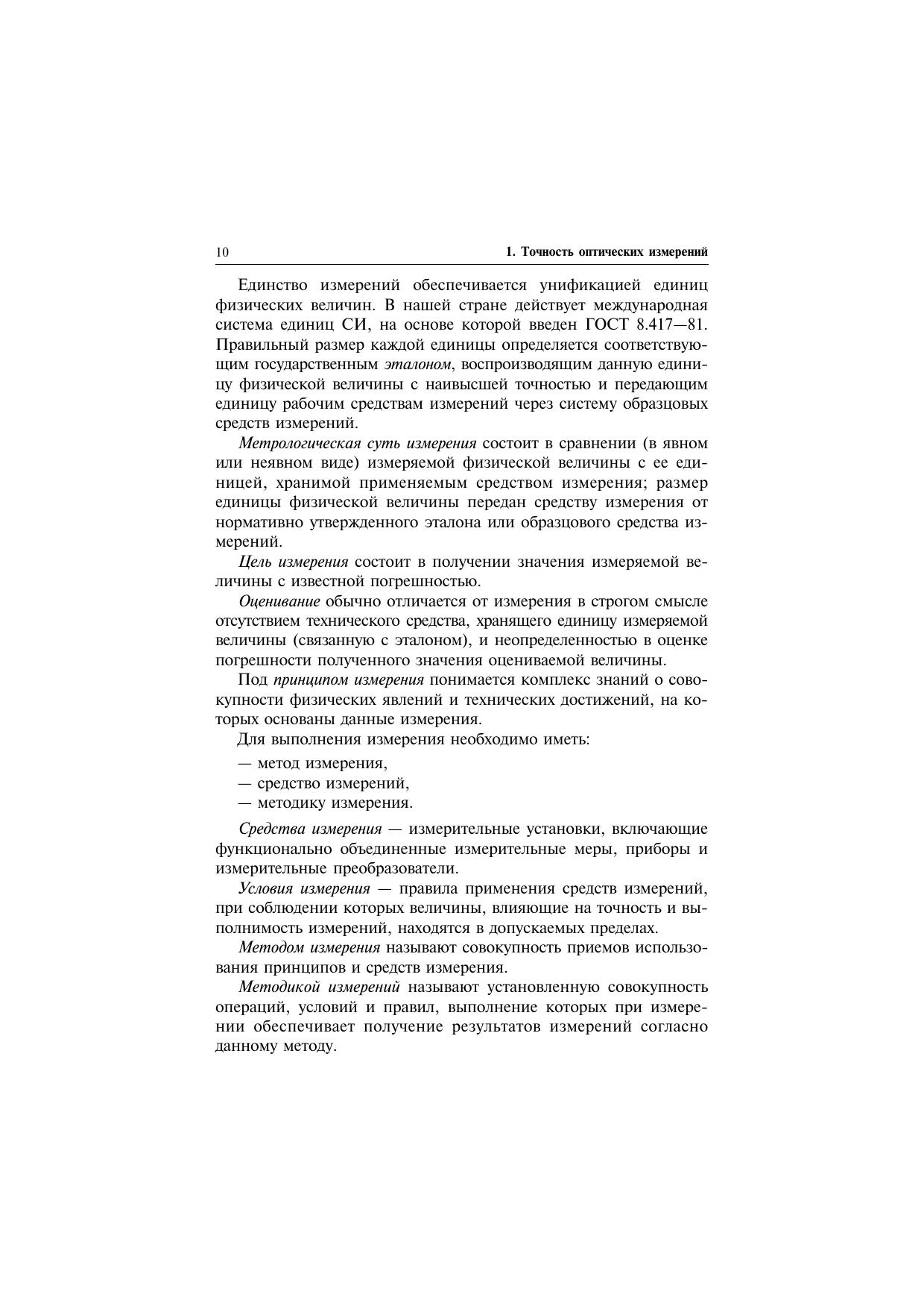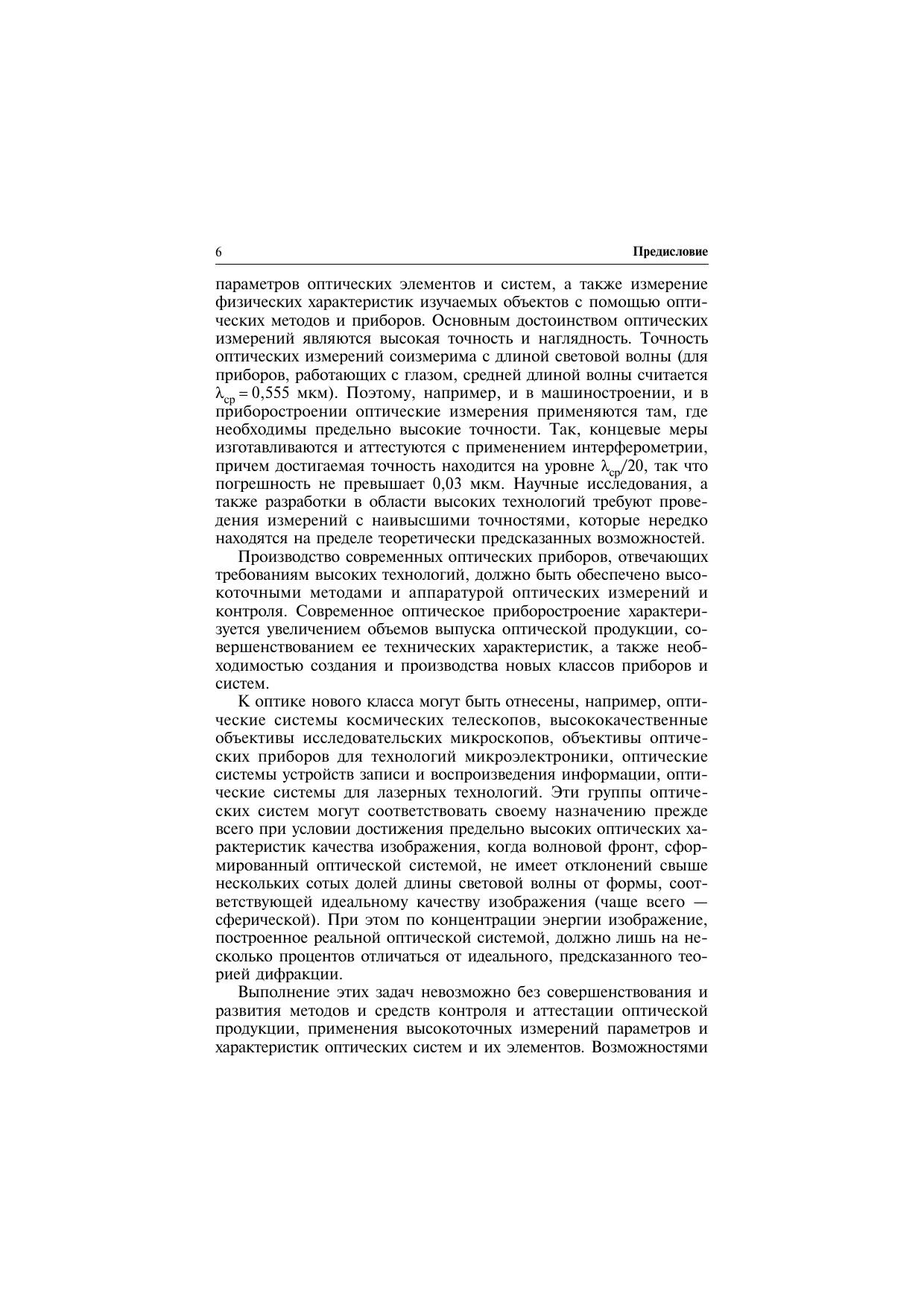 Описываются методы и средства оптических измерений, теория точности оптических измерений, способы определения порогов чувствительности и характеристик точности методов и аппаратуры. На основе этих знаний вырабатывается умение анализировать существующие функциональные схемы оптических контрольно-измерительных устройств, определять требования к их оптическим и метрологическим характеристикам, создавать схемы и методики оптических измерений согласно возникающим задачам. Учебное пособие написано в соответствии с программой учебной дисциплины «Оптические измерения». Для студентов высших учебных заведений, обучающихся по направлению «Оптотехника» и оптическим специальностям подготовки бакалавров и магистров.