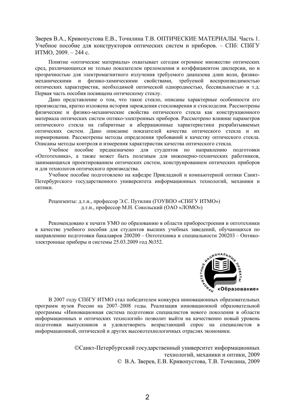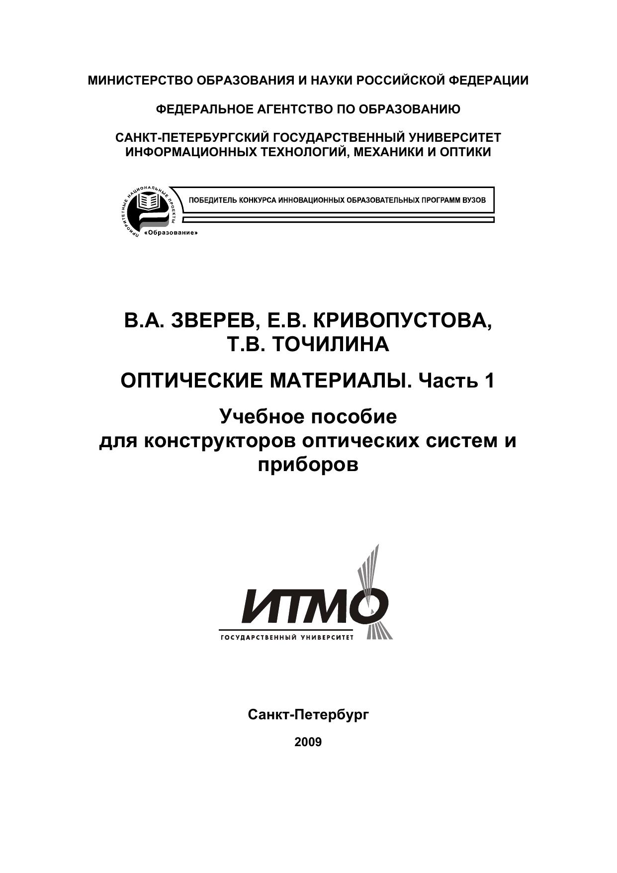 Понятие «оптические материалы» охватывает сегодня огромное множество оптических сред, различающихся не только показателем преломления и коэффициентом дисперсии, но и прозрачностью для электромагнитного излучения требуемого диапазона длин волн, физико-механическими и физико-химическими свойствами, требуемой воспроизводимостью оптических характеристик, необходимой оптической однородностью, бессвильностью и т.д. Первая часть пособия посвящена оптическому стеклу. Дано представление о том, что такое стекло, описаны характерные особенности его производства, кратко изложена история зарождения стекловарения и стеклоделия. Рассмотрены физические и физико-механические свойства оптического стекла как конструкционного материала оптических систем оптико-электронных приборов. Рассмотрено влияние параметров оптического стекла на габаритные и аберрационные характеристики разрабатываемых оптических систем. Дано описание показателей качества оптического стекла и их нормирования. Рассмотрены методы определения требований к качеству оптического стекла. Описаны методы контроля и измерения характеристик качества оптического стекла. Учебное пособие предназначено для студентов по направлению подготовки «Оптотехника», а также может быть полезным для инженерно-технических работников, занимающихся проектированием оптических систем, конструированием оптических приборов и для технологов оптического производства.