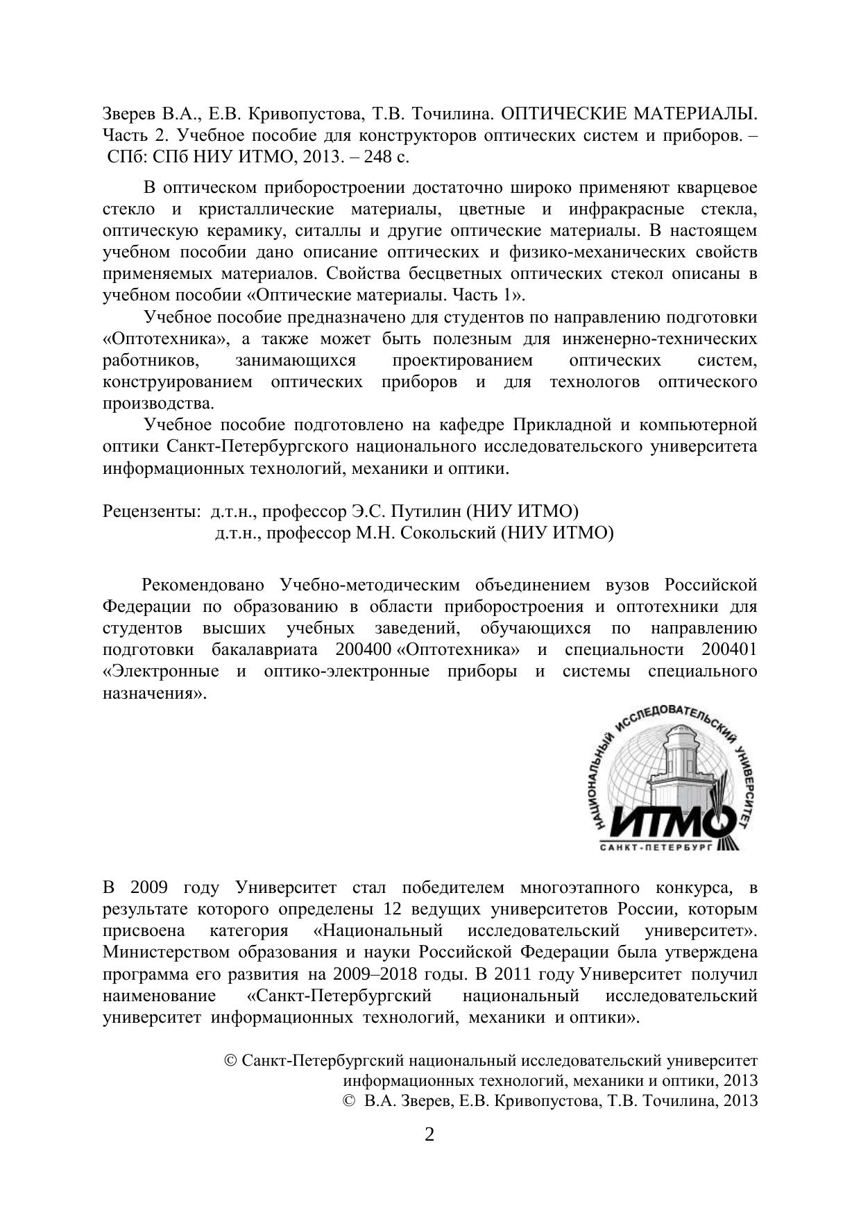 В оптическом приборостроении достаточно широко применяют кварцевое стекло и кристаллические материалы, цветные и инфракрасные стекла, оптическую керамику, ситаллы и другие оптические материалы. В настоящем учебном пособии дано описание оптических и физико-механических свойств применяемых материалов. Свойства бесцветных оптических стекол описаны в учебном пособии «Оптические материалы. Часть 1». Учебное пособие предназначено для студентов по направлению подготовки «Оптотехника», а также может быть полезным для инженерно-технических работников, занимающихся проектированием оптических систем, конструированием оптических приборов и для технологов оптического производства.Учебное пособие подготовлено на кафедре Прикладной и компьютерной оптики Санкт-Петербургского национального исследовательского университета информационных технологий, механики и оптики.