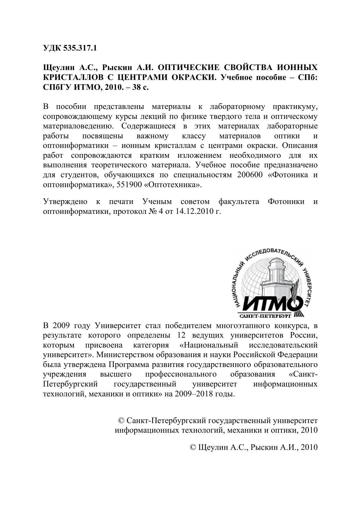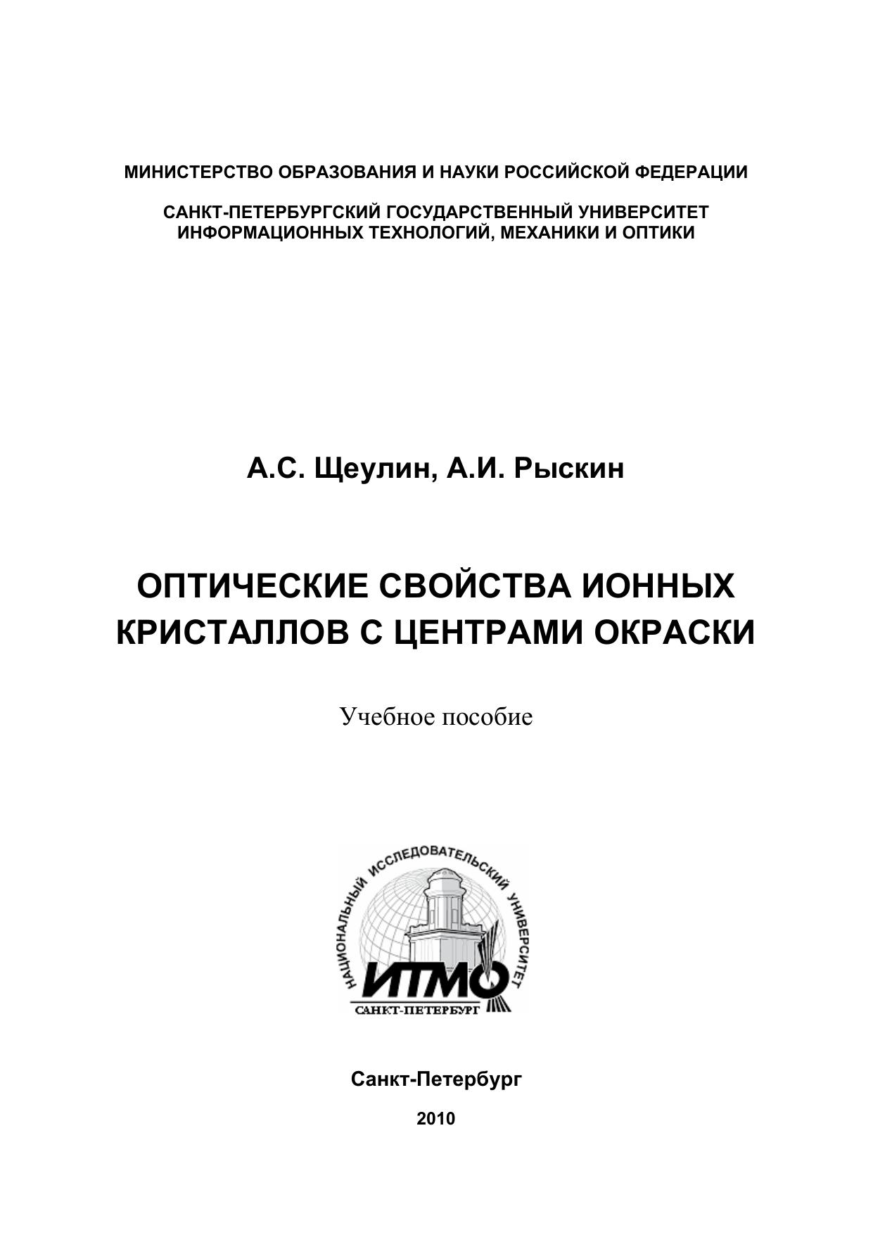 В пособии представлены материалы к лабораторному практикуму, сопровождающему курсы лекций по физике твердого тела и оптическому материаловедению. Содержащиеся в этих материалах лабораторные работы посвящены важному классу материалов оптики и оптоинформатики – ионным кристаллам с центрами окраски. Описания работ сопровождаются кратким изложением необходимого для их выполнения теоретического материала. Учебное пособие предназначено для студентов, обучающихся по специальностям 200600 «Фотоника и оптоинформатика», 551900 «Оптотехника».