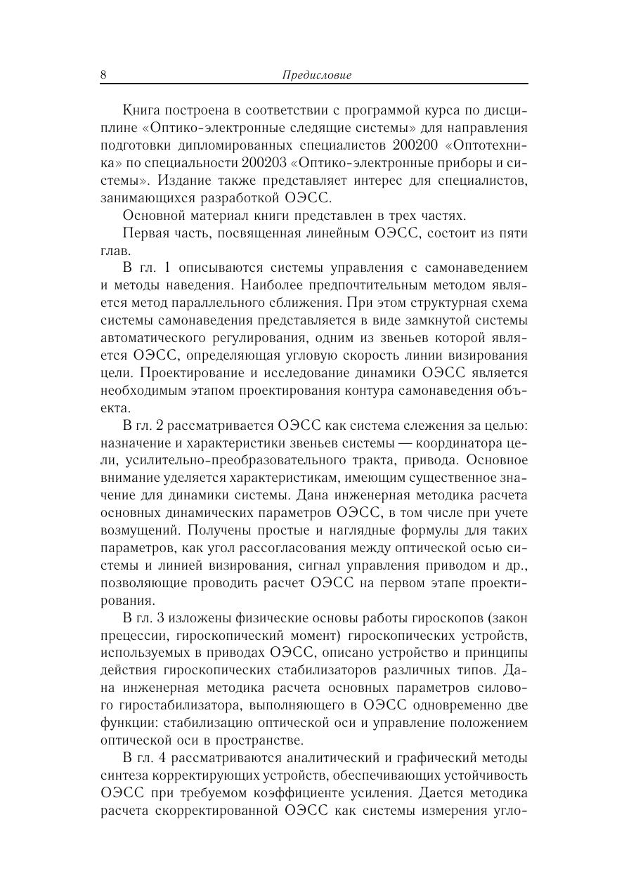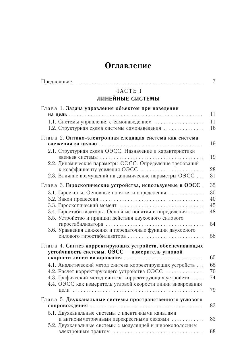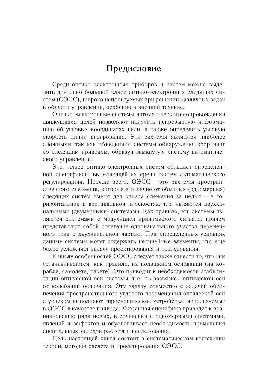 Изложены теория, методы расчета и проектирования оптикоэлектронных следящих линейных и нелинейных систем, широко используемых при решении различных задач в области управления, прежде всего в военной технике. Даны методы их анализа и синтеза, учитывающие специфику систем пространственного слежения с модуляцией. Особое внимание уделено получению инженерных зависимостей для параметров звеньев систем с точки зрения обеспечения оптимальности их характеристик. Для студентов высших учебных заведений, обучающихся по направлению «Оптотехника» и специальности «Оптико-электронные приборыи системы». Может быть полезна специалистам, занимающимся разработкой оптико-электронных следящих систем.