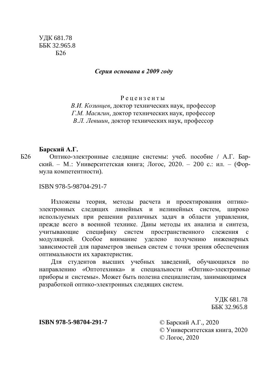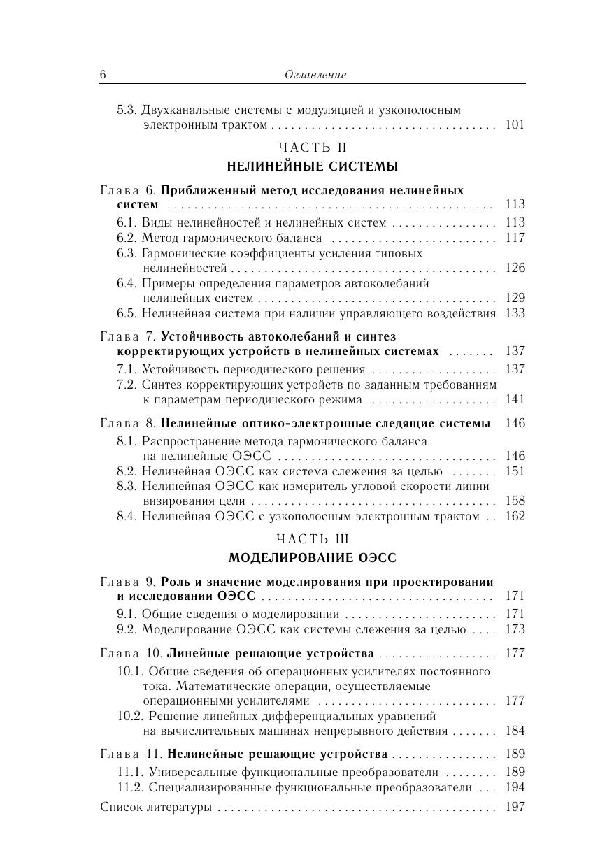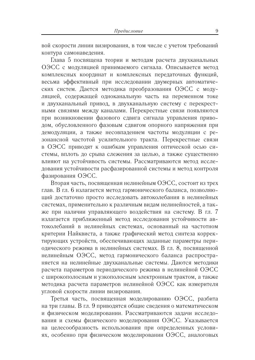 Изложены теория, методы расчета и проектирования оптикоэлектронных следящих линейных и нелинейных систем, широко используемых при решении различных задач в области управления, прежде всего в военной технике. Даны методы их анализа и синтеза, учитывающие специфику систем пространственного слежения с модуляцией. Особое внимание уделено получению инженерных зависимостей для параметров звеньев систем с точки зрения обеспечения оптимальности их характеристик. Для студентов высших учебных заведений, обучающихся по направлению «Оптотехника» и специальности «Оптико-электронные приборыи системы». Может быть полезна специалистам, занимающимся разработкой оптико-электронных следящих систем.
