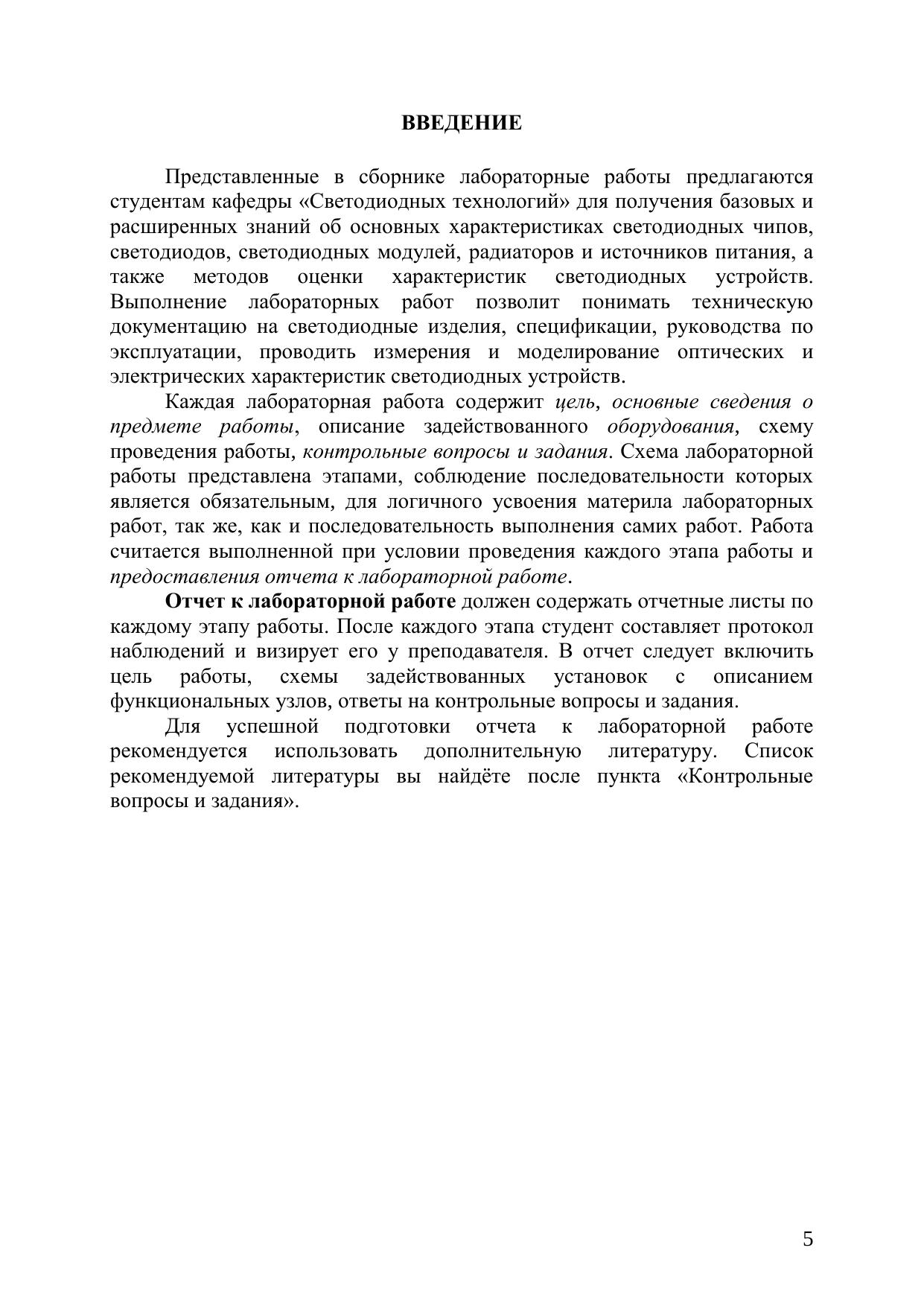 Представленные в сборнике лабораторные работы предлагаются студентам кафедры «Светодиодных технологий» для закрепления и применения знаний, полученных на лекциях, практических занятиях и во время самостоятельной работы, и расширения знаний о характеристиках светодиодных устройств, некоторых критических аспектах, учет которых необходим при разработке нового светодиодного изделия. В частности, освещены вопросы организации теплового режима, получения спектра излучения высокого качества, выбора источника питания. Проводится знакомство с возможностями программного пакета Zemax для расчёта различных оптических систем, в том числе, светодиодов. К каждой лабораторной работе сформулированы контрольные вопросы и задания. Пособие адресовано студентам, обучающимся по магистерской программе 200400.68 «Светодиодные технологии» направления подготовки 200400 «Оптотехника». Лабораторный практикум подготовлен на кафедре «Светодиодных технологий».