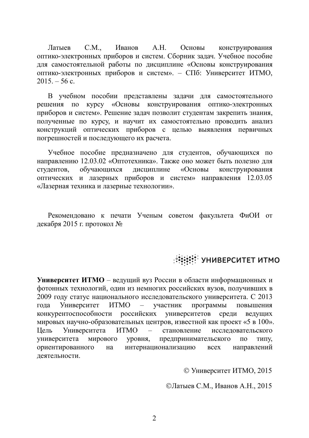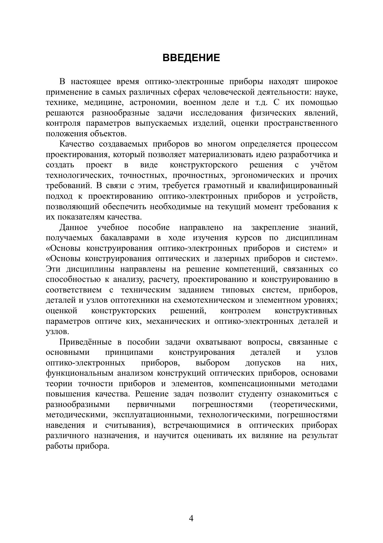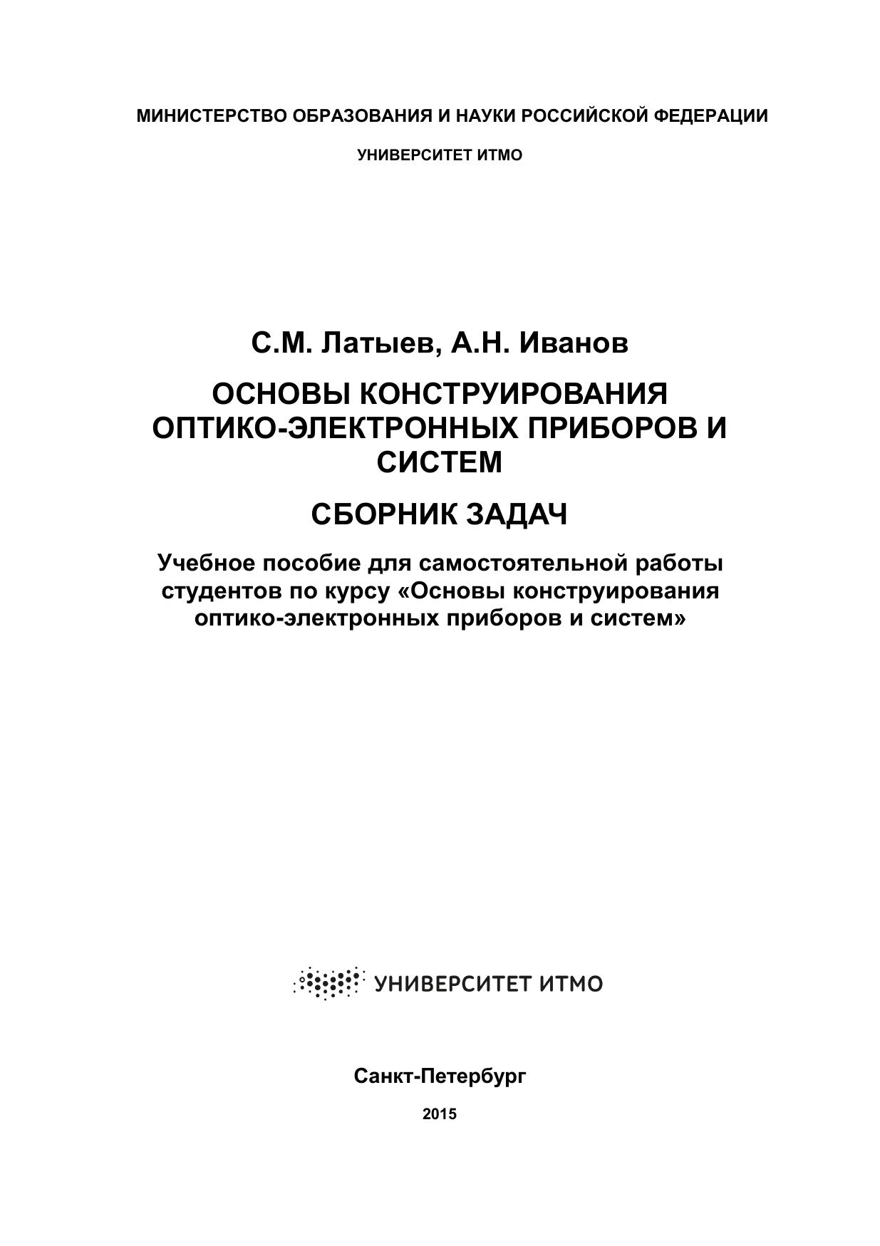 В учебном пособии представлены задачи для самостоятельного решения по курсу «Основы конструирования оптико-электронных приборов и систем». Решение задач позволит студентам закрепить знания, полученные по курсу, и научит их самостоятельно проводить анализ конструкций оптических приборов с целью выявления первичных погрешностей и последующего их расчета. Учебное пособие предназначено для студентов, обучающихся по направлению 12.03.02 «Оптотехника». Также оно может быть полезно для студентов, обучающихся дисциплине «Основы конструирования оптических и лазерных приборов и систем» направления 12.03.05 «Лазерная техника и лазерные технологии».