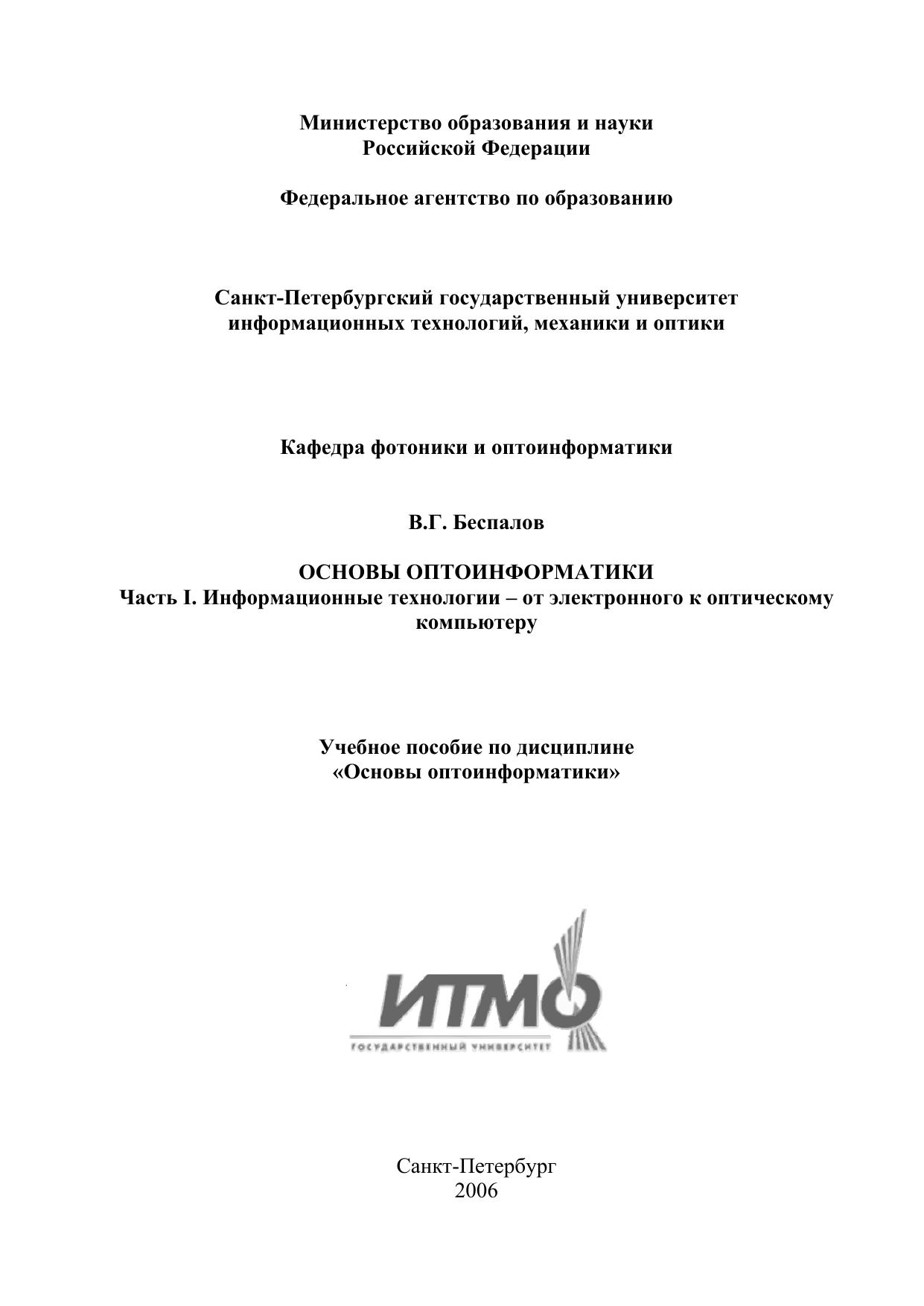 Основы оптоинформатики. Часть I. Информационные технологии – от электронного к оптическому компьютеру