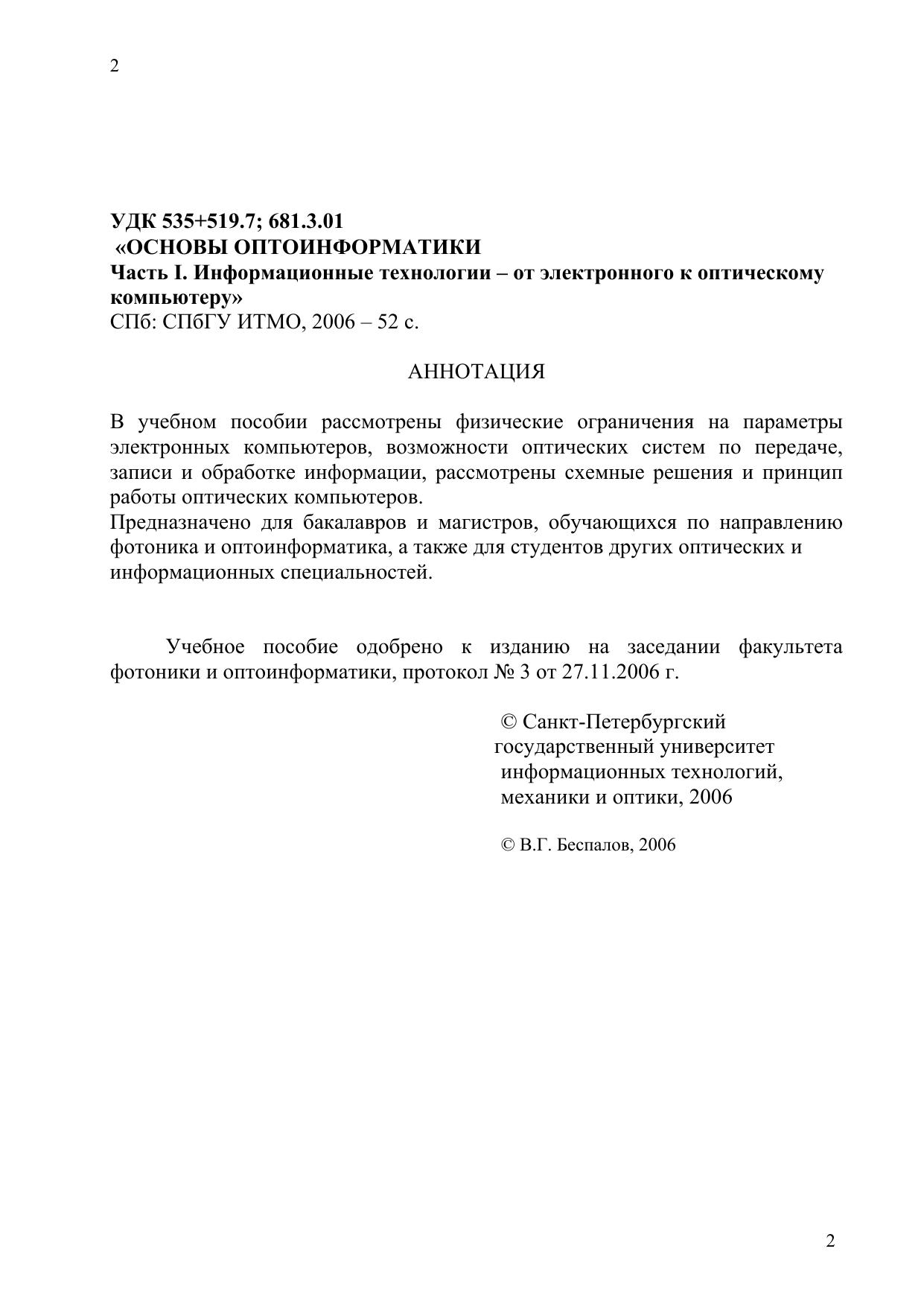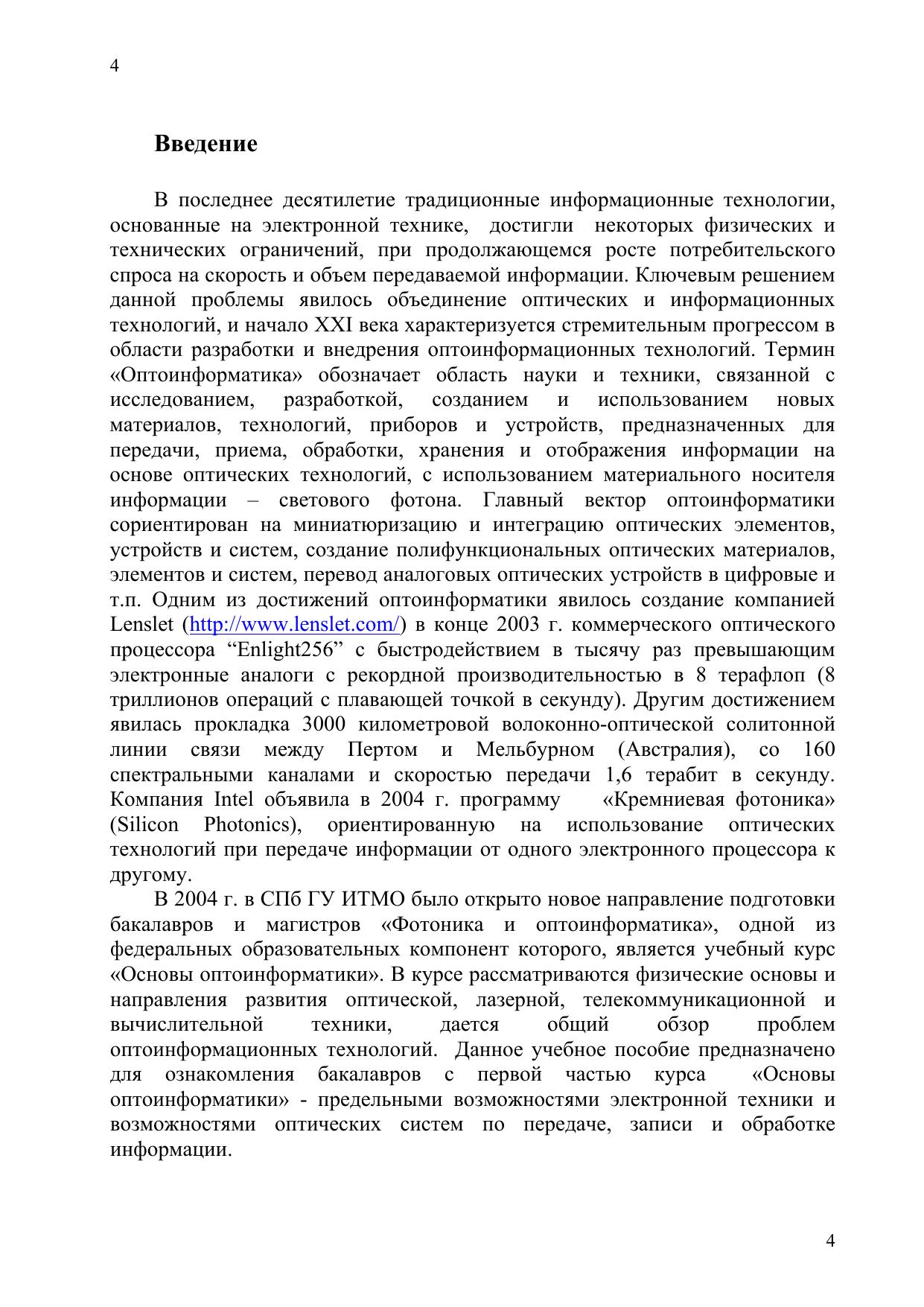 В учебном пособии рассмотрены физические ограничения на параметры электронных компьютеров, возможности оптических систем по передаче, записи и обработке информации, рассмотрены схемные решения и принцип работы оптических компьютеров. Предназначено для бакалавров и магистров, обучающихся по направлению фотоника и оптоинформатика, а также для студентов других оптических и информационных специальностей.