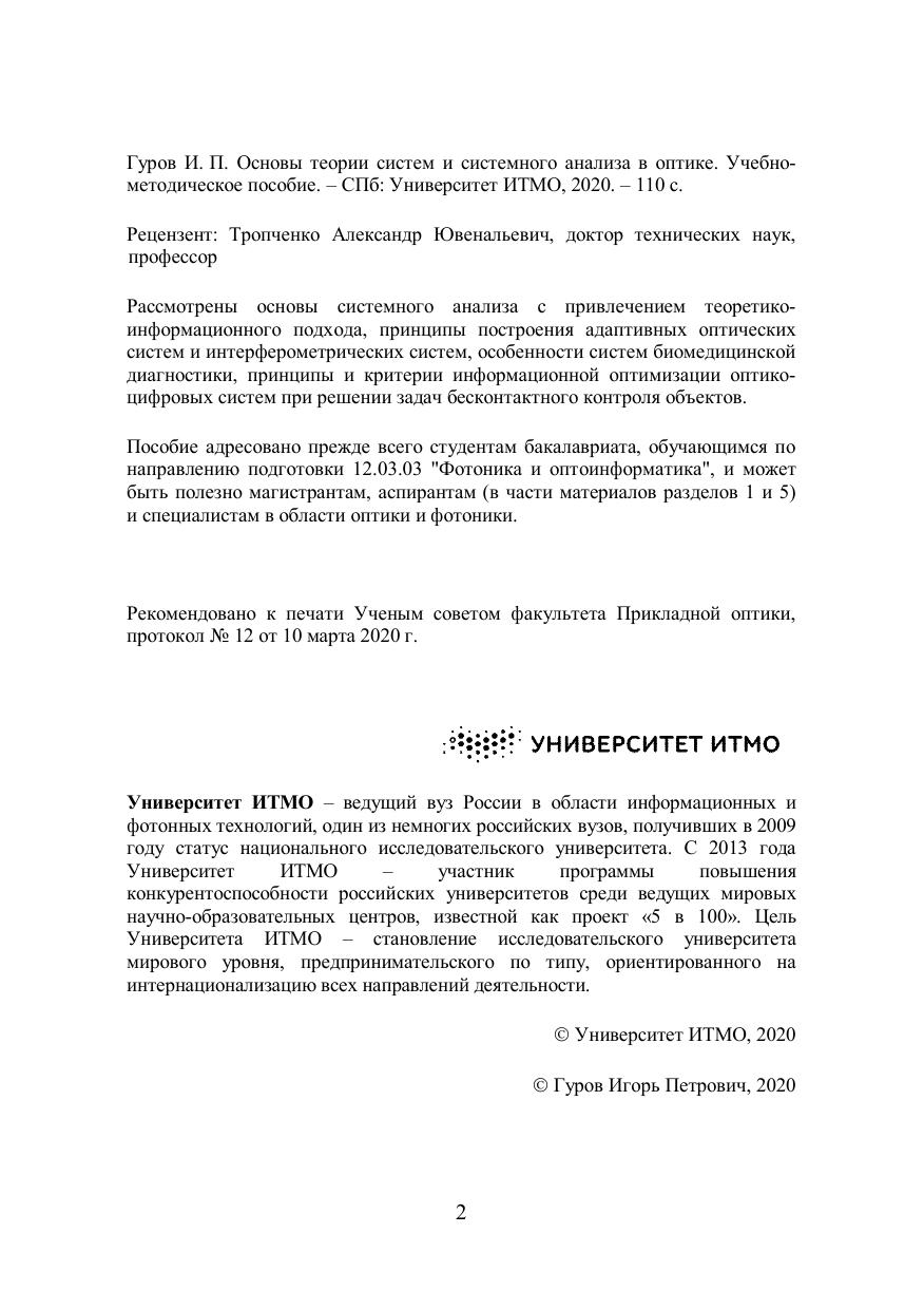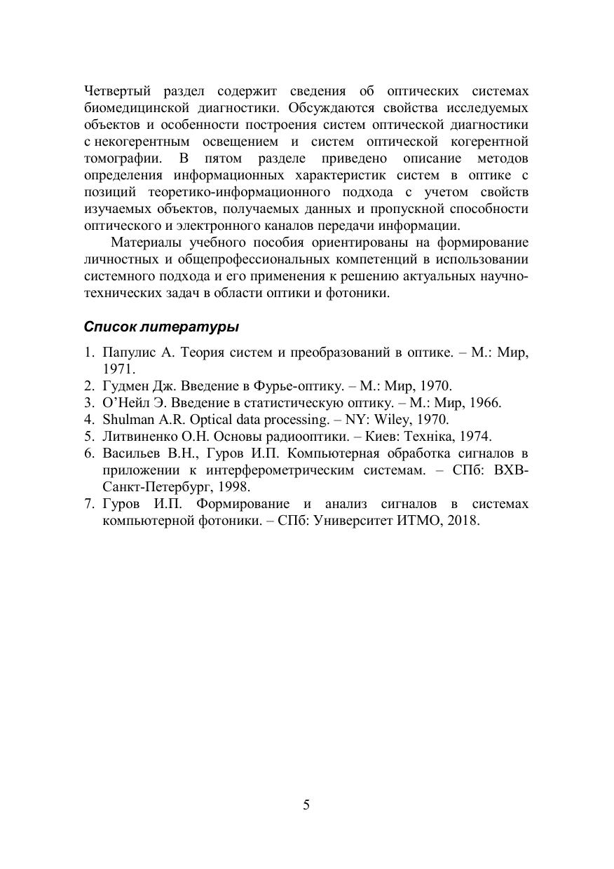 Рассмотрены основы системного анализа с привлечением теоретико-информационного подхода, принципы построения адаптивных оптических систем и интерферометрических систем, особенности систем биомедицинской диагностики, принципы и критерии информационной оптимизации оптико-цифровых систем при решении задач бесконтактного контроля объектов. Пособие адресовано прежде всего студентам бакалавриата, обучающимся по направлению подготовки 12.03.03 "Фотоника и оптоинформатика", и может быть полезно магистрантам, аспирантам (в части материалов разделов 1 и 5) и специалистам в области оптики и фотоники.