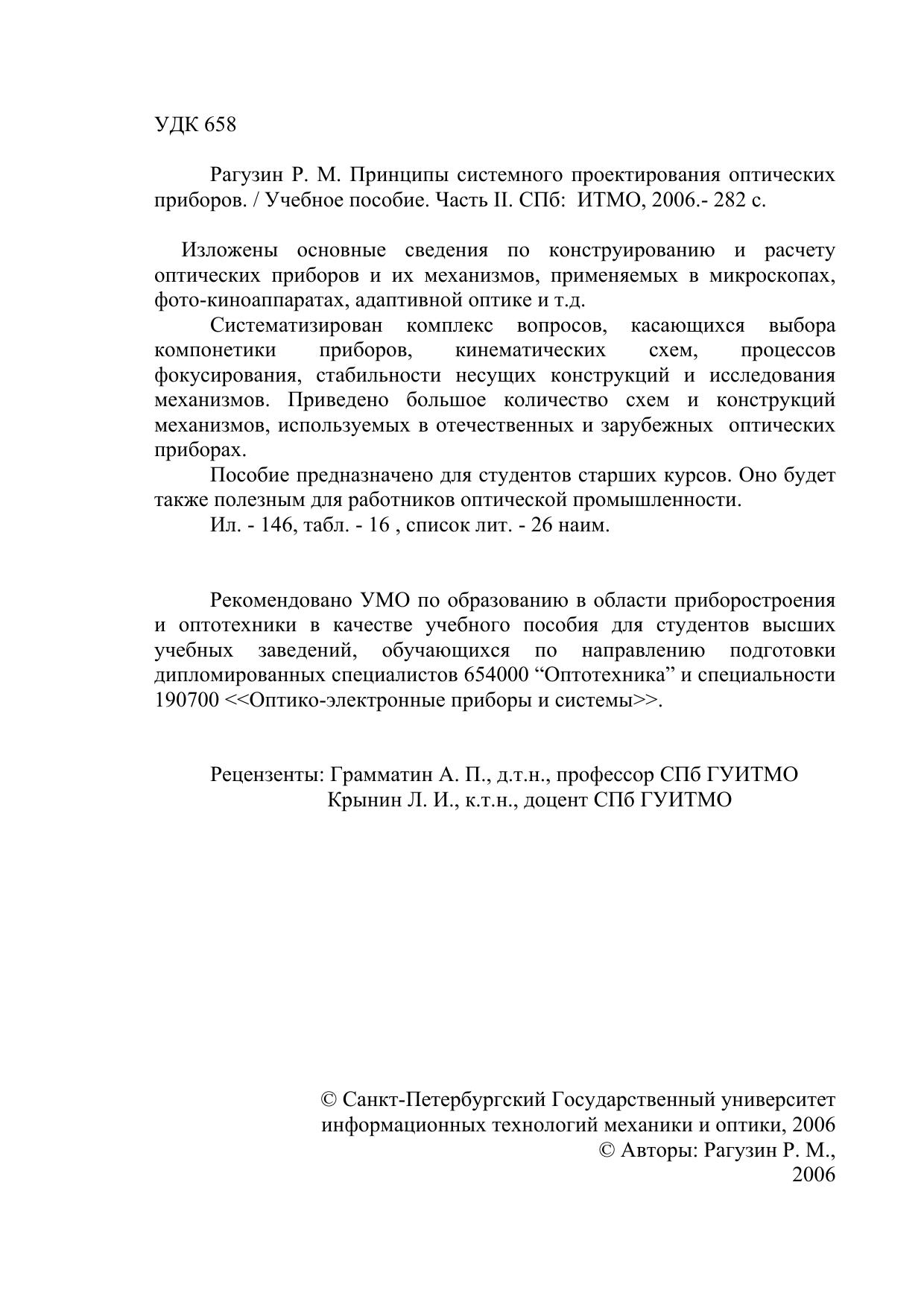 Изложены основные сведения по конструированию и расчету оптических приборов и их механизмов, применяемых в микроскопах, фото- иноаппаратах, адаптивной оптике и т.д. Систематизирован комплекс вопросов, касающихся выборакомпонетики приборов, кинематических схем, процессов фокусирования, стабильности несущих конструкций и исследования механизмов. Приведено большое количество схем и конструкций механизмов, используемых в отечественных и зарубежных оптических приборах. Пособие предназначено для студентов старших курсов. Оно будет также для работников оптической промышленности.