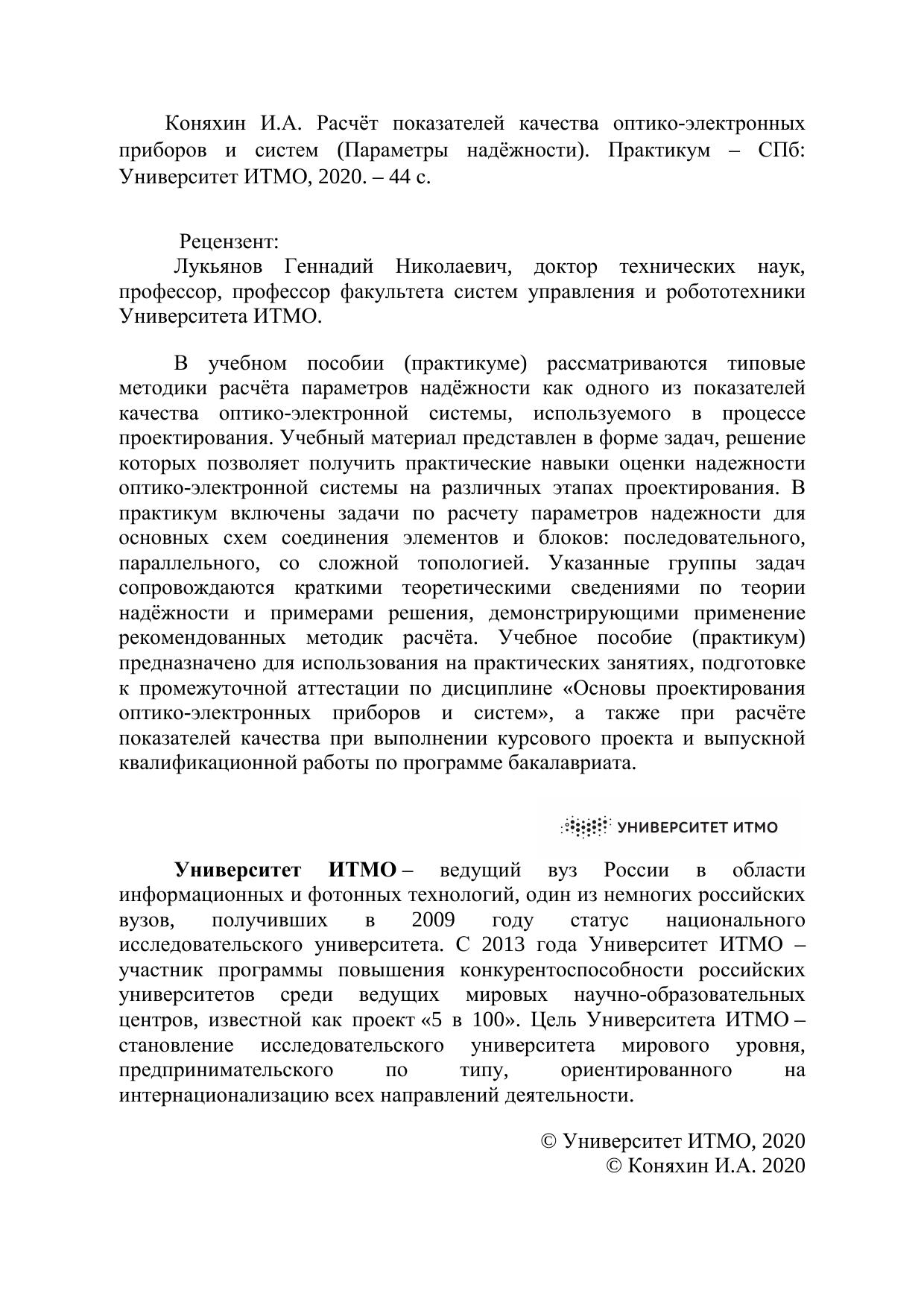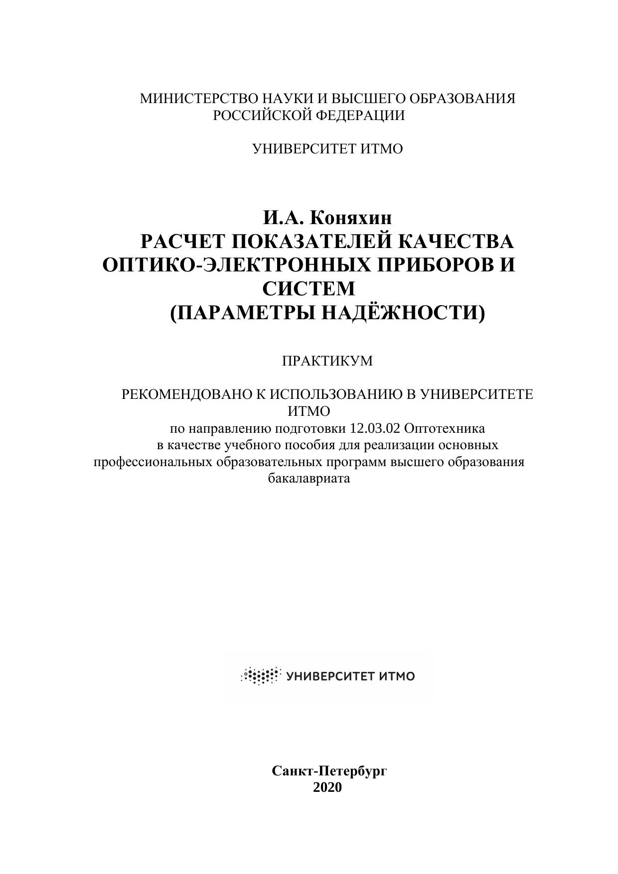 В учебном пособии (практикуме) рассматриваются типовые методики расчёта параметров надёжности как одного из показателей качества оптико-электронной системы, используемого в процессе проектирования. Учебный материал представлен в форме задач, решение которых позволяет получить практические навыки оценки надежности оптико-электронной системы на различных этапах проектирования. В практикум включены задачи по расчету параметров надежности для основных схем соединения элементов и блоков: последовательного, параллельного, со сложной топологией. Указанные группы задач сопровождаются краткими теоретическими сведениями по теории надёжности и примерами решения, демонстрирующими применение рекомендованных методик расчёта. Учебное пособие (практикум) предназначено для использования на практических занятиях, подготовке к промежуточной аттестации по дисциплине «Основы проектирования оптико-электронных приборов и систем», а также при расчёте показателей качества при выполнении курсового проекта и выпускной квалификационной работы по программе бакалавриата.