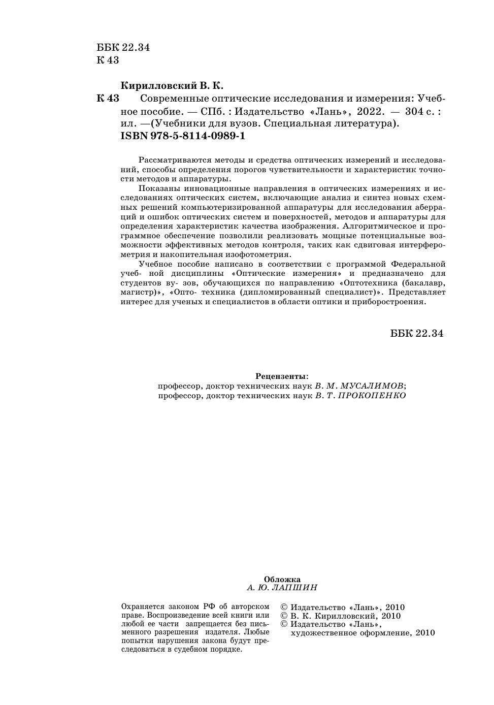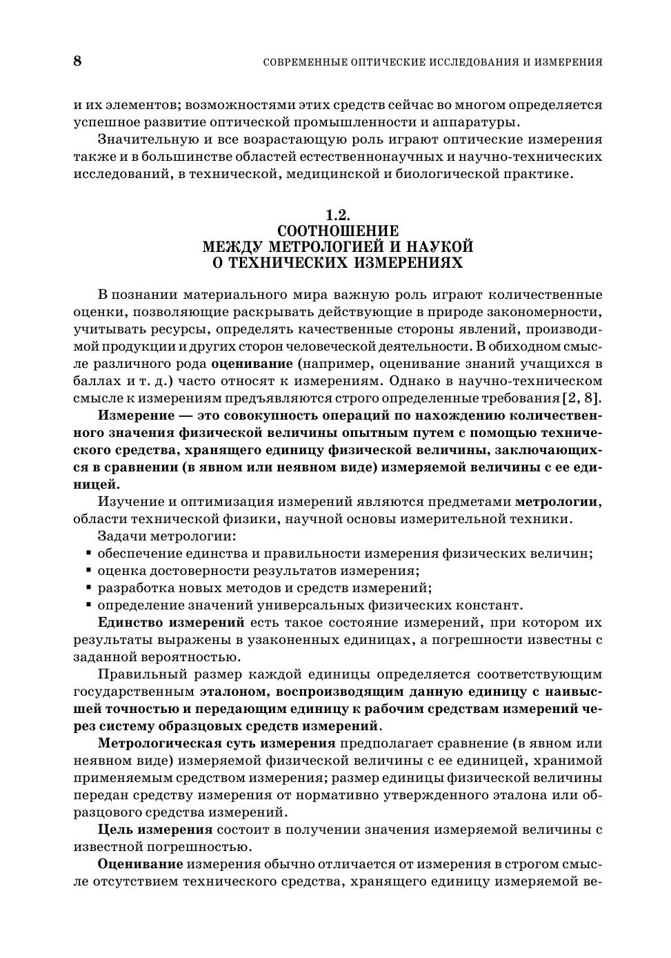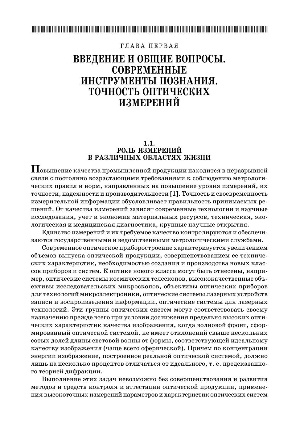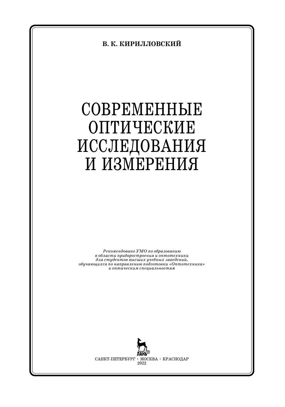 Рассматриваются методы и средства оптических измерений и исследований, способы определения порогов чувствительности и характеристик точности методов и аппаратуры. Показаны инновационные направления в оптических измерениях и исследованиях оптических систем, включающие анализ и синтез новых схемных решений компьютеризированной аппаратуры для исследования аберраций и ошибок оптических систем и поверхностей, методов и аппаратуры для определения характеристик качества изображения. Алгоритмическое и программное обеспечение позволили реализовать мощные потенциальные возможности эффективных методов контроля, таких как сдвиговая интерферометрия и накопительная изофотометрия. Учебное пособие написано в соответствии с программой Федеральной учебной дисциплины «Оптические измерения» и предназначено для студентов вузов, обучающихся по направлению «Оптотехника (бакалавр, магистр)», «Оптотехника (дипломированный специалист)». Представляет интерес для ученых и специалистов в области оптики и приборостроения.