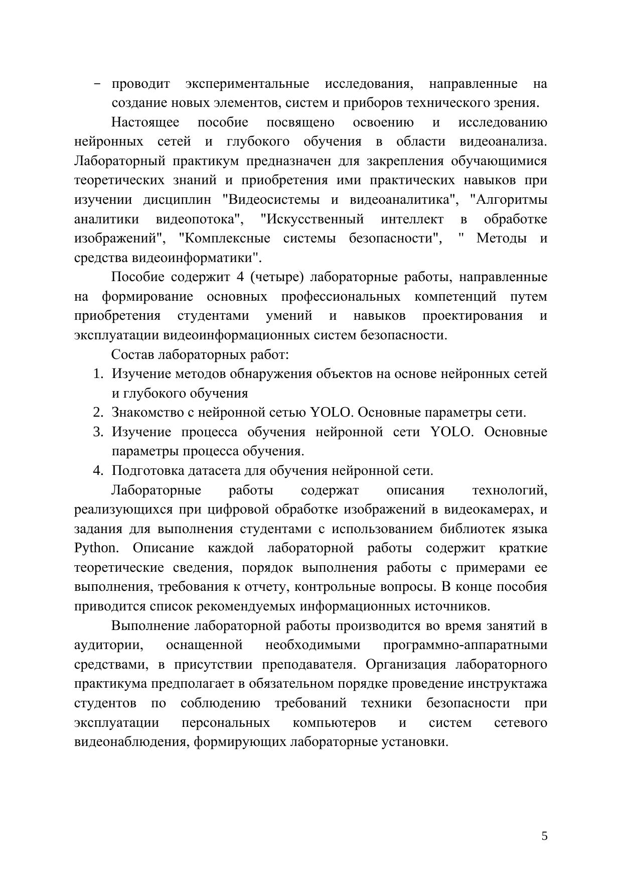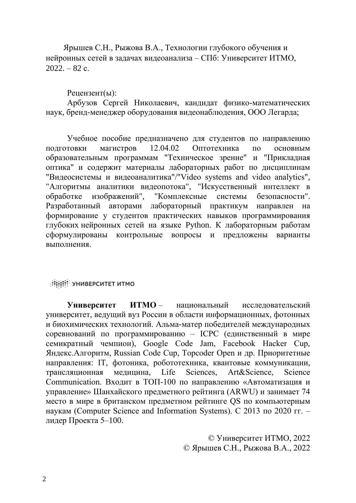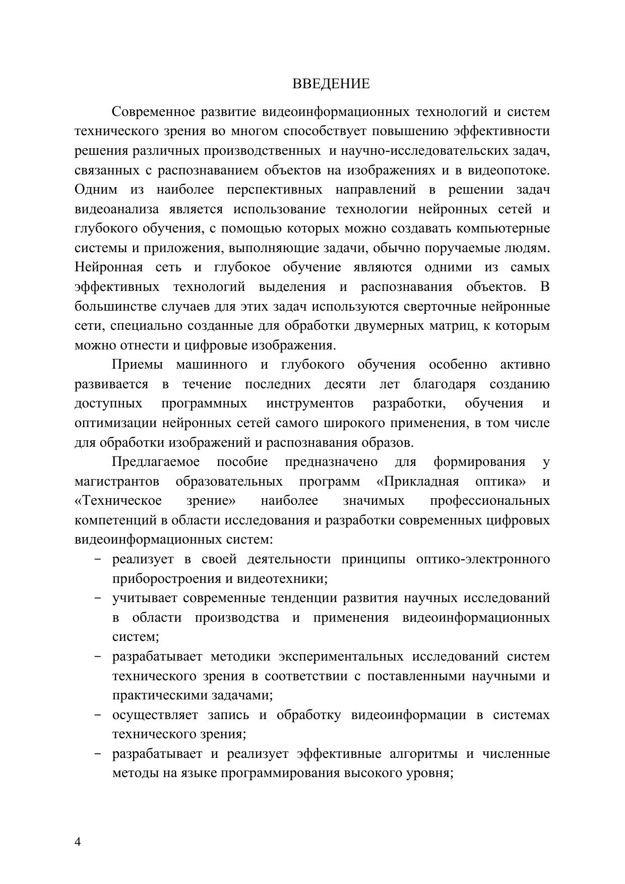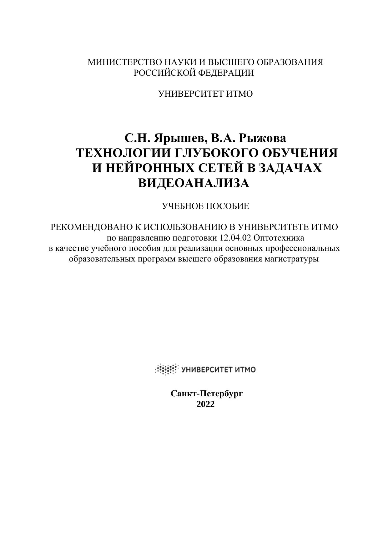 Учебное пособие предназначено для студентов по направлению подготовки магистров 12.04.02 Оптотехника по основным образовательным программам "Техническое зрение" и "Прикладная оптика" и содержит материалы лабораторных работ по дисциплинам "Видеосистемы и видеоаналитика"/"Video systems and video analytics", "Алгоритмы аналитики видеопотока", "Искусственный интеллект в обработке изображений", "Комплексные системы безопасности". Разработанный авторами лабораторный практикум направлен на формирование у студентов практических навыков программирования глубоких нейронных сетей на языке Python. К лабораторным работам сформулированы контрольные вопросы и предложены варианты выполнения.