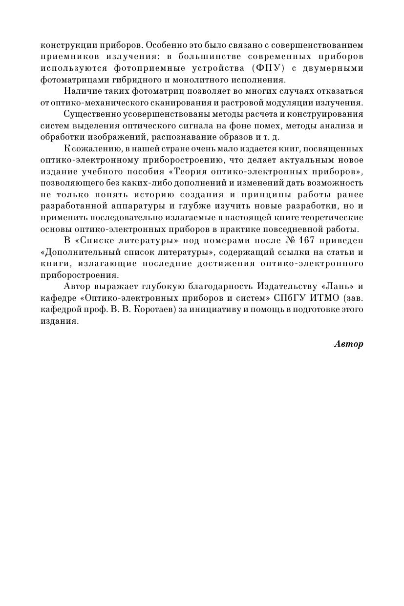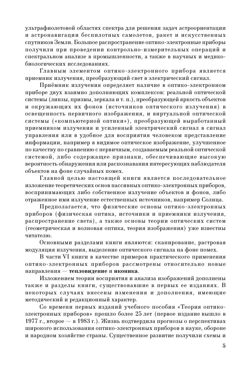 Главной целью учебного пособия является последовательное изложение теоретических основ пассивных оптико-электронных приборов, т. е. приборов, воспринимающих либо собственное излучение объектов и фонов, либо отраженное ими излучение естественных источников. Основными разделами книги являются сканирование, растровая модуляция излучения, выделение оптического сигнала на фоне случайных помех. Рассмотрены вопросы восприятия и анализа изображений. Отдельный раздел посвящен тепловидению и иконике. Учебное пособие предназначено для студентов технических вузов.