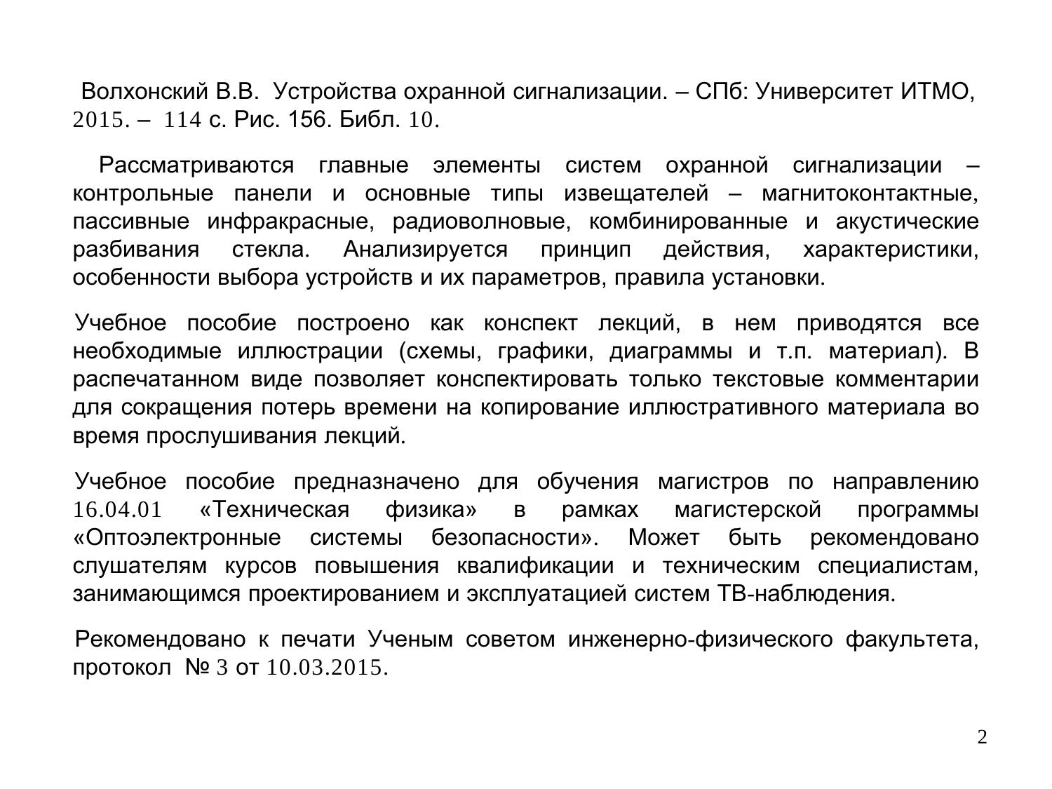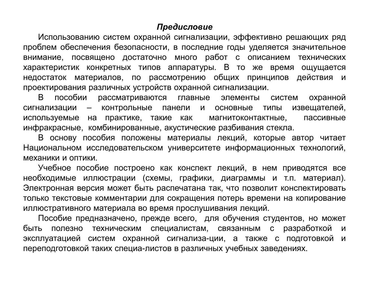 Рассматриваются главные элементы систем охранной сигнализации – контрольные панели и основные типы извещателей – магнитоконтактные, пассивные инфракрасные, радиоволновые, комбинированные и акустические разбивания стекла. Анализируется принцип действия, характеристики, особенности выбора устройств и их параметров, правила установки. Учебное пособие построено как конспект лекций, в нем приводятся все необходимые иллюстрации (схемы, графики, диаграммы и т.п. материал). В распечатанном виде позволяет конспектировать только текстовые комментарии для сокращения потерь времени на копирование иллюстративного материала во время прослушивания лекций. Учебное пособие предназначено для обучения магистров по направлению 16.04.01 «Техническая физика» в рамках магистерской программы «Оптоэлектронные системы безопасности». Может быть рекомендовано слушателям курсов повышения квалификации и техническим специалистам, занимающимся проектированием и эксплуатацией систем ТВ-наблюдения.