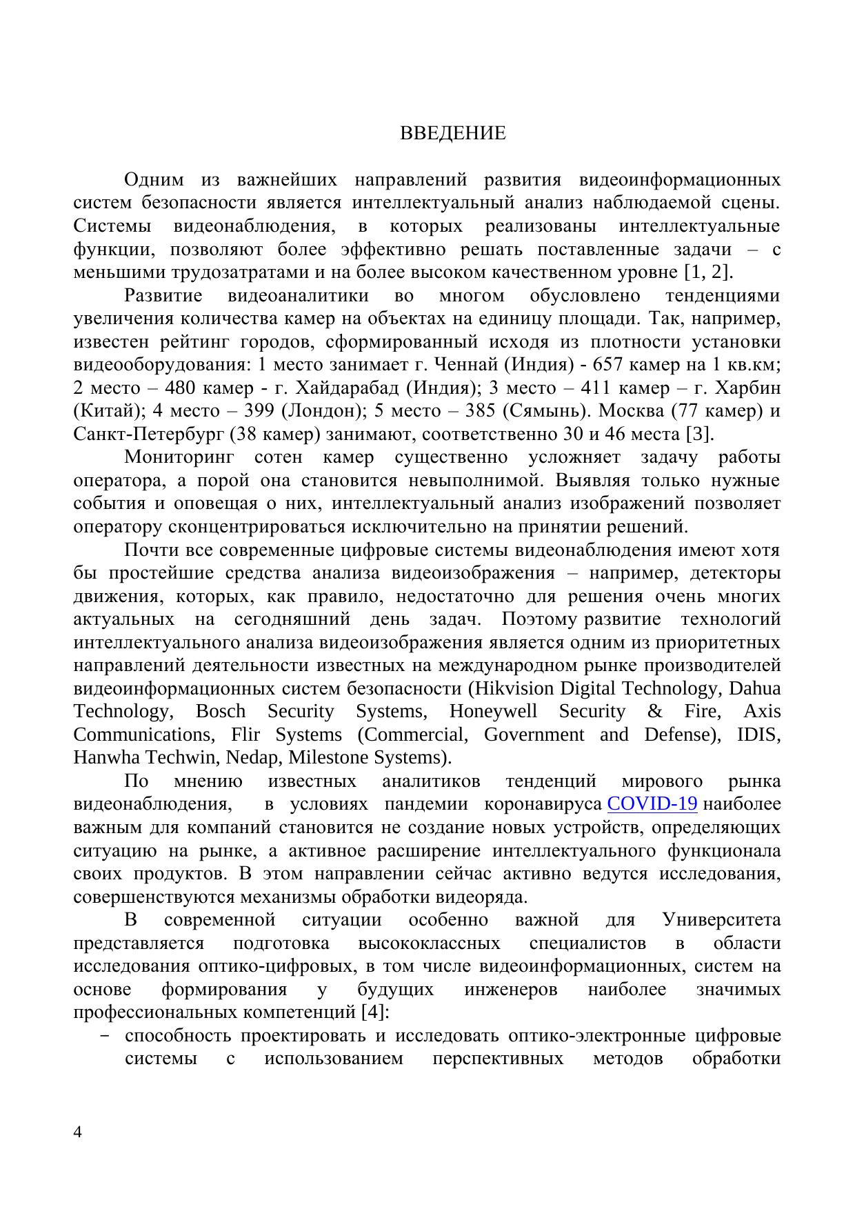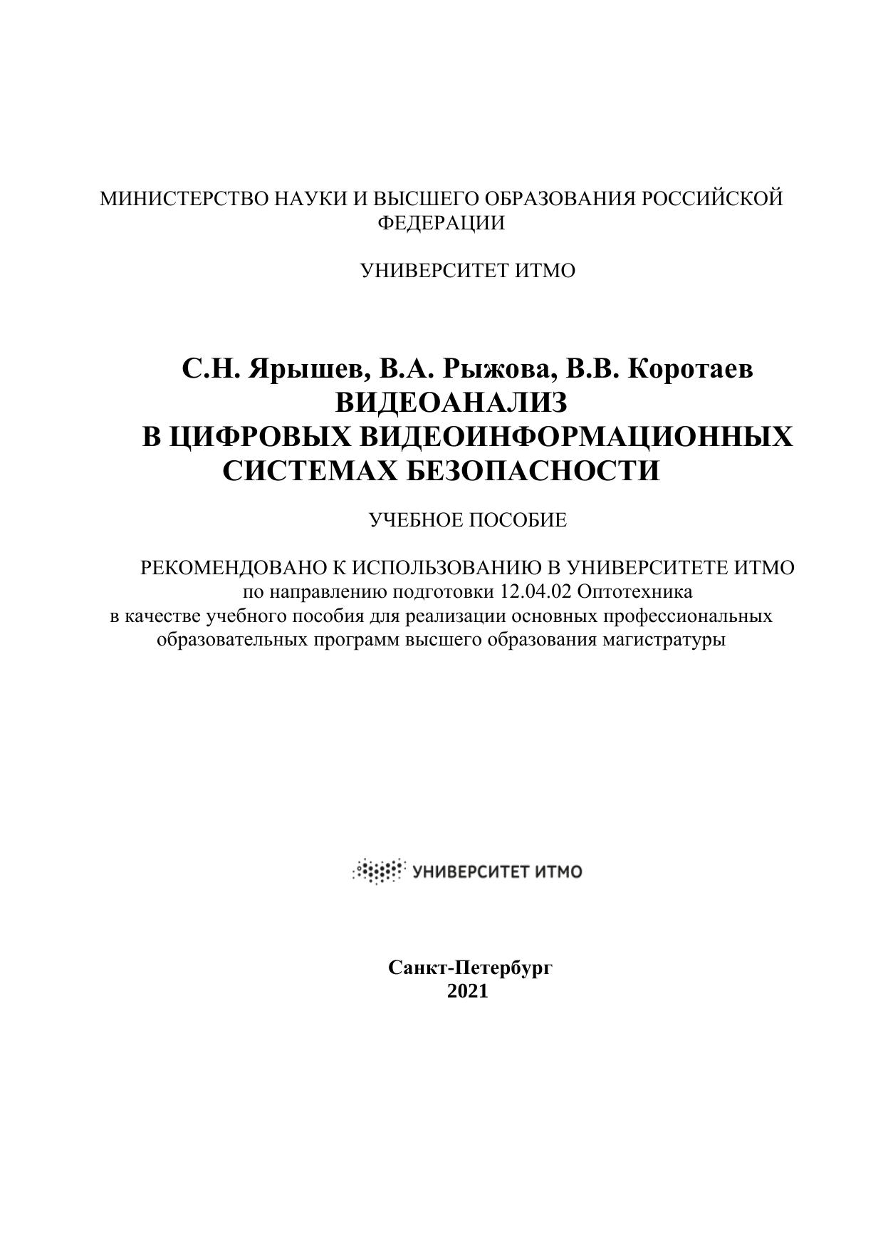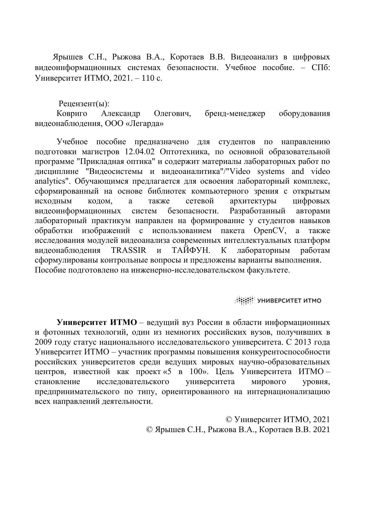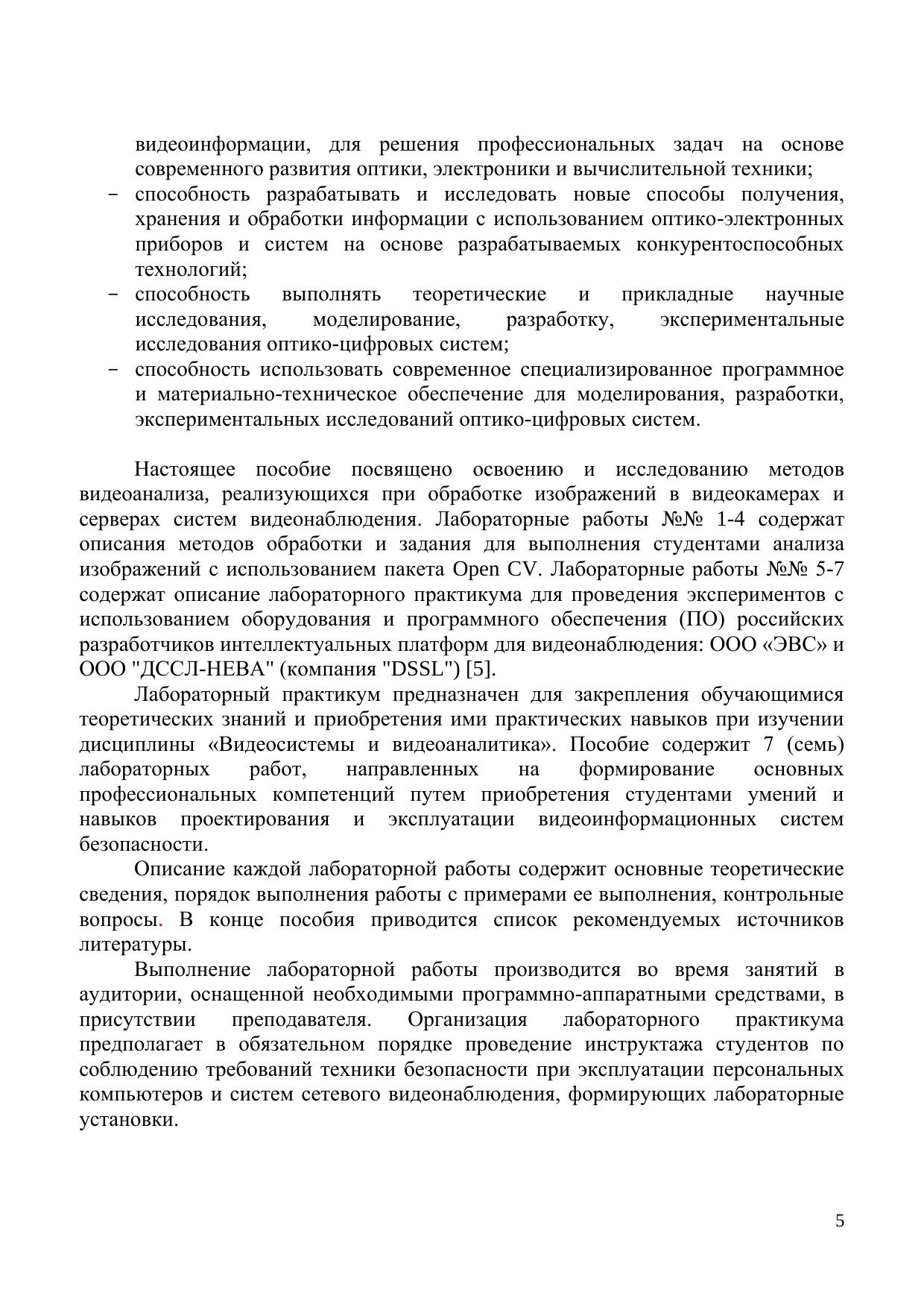 Учебное пособие предназначено для студентов по направлению подготовки магистров 12.04.02 Оптотехника, по основной образовательной программе "Прикладная оптика" и содержит материалы лабораторных работ по дисциплине "Видеосистемы и видеоаналитика"/"Video systems and video analytics". Обучающимся предлагается для освоения лабораторный комплекс, сформированный на основе библиотек компьютерного зрения с открытым исходным кодом, а также сетевой архитектуры цифровых видеоинформационных систем безопасности. Разработанный авторами лабораторный практикум направлен на формирование у студентов навыков обработки изображений с использованием пакета OpenCV, а также исследования модулей видеоанализа современных интеллектуальных платформ видеонаблюдения TRASSIR и ТАЙФУН. К лабораторным работам сформулированы контрольные вопросы и предложены варианты выполнения. Пособие подготовлено на инженерно-исследовательском факультете.