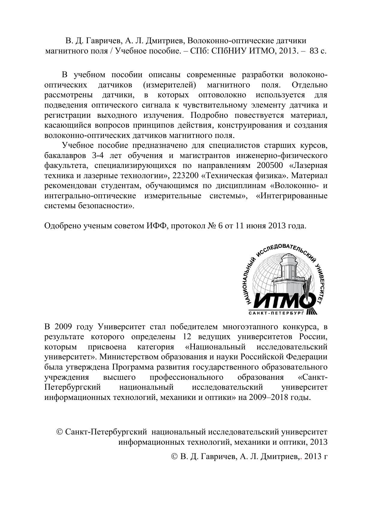 В учебном пособии описаны современные разработки волоконо-оптических датчиков (измерителей) магнитного поля. Отдельно рассмотрены датчики, в которых оптоволокно используется для подведения оптического сигнала к чувствительному элементу датчика и регистрации выходного излучения. Подробно повествуется материал, касающийся вопросов принципов действия, конструирования и создания волоконно-оптических датчиков магнитного поля. Учебное пособие предназначено для специалистов старших курсов, бакалавров 3-4 лет обучения и магистрантов инженерно-физического факультета, специализирующихся по направлениям 200500 «Лазерная техника и лазерные технологии», 223200 «Техническая физика». Материалрекомендован студентам, обучающимся по дисциплинам «Волоконно- и интегрально-оптические измерительные системы», «Интегрированные системы безопасности».