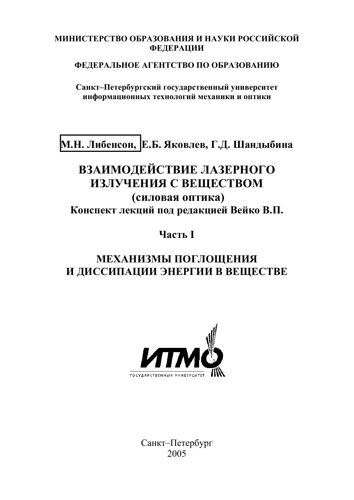 Взаимодействие лазерного излучения с веществом (силовая оптика). Конспект лекций. Часть I. Механизмы поглощения и диссипации энергии в веществе