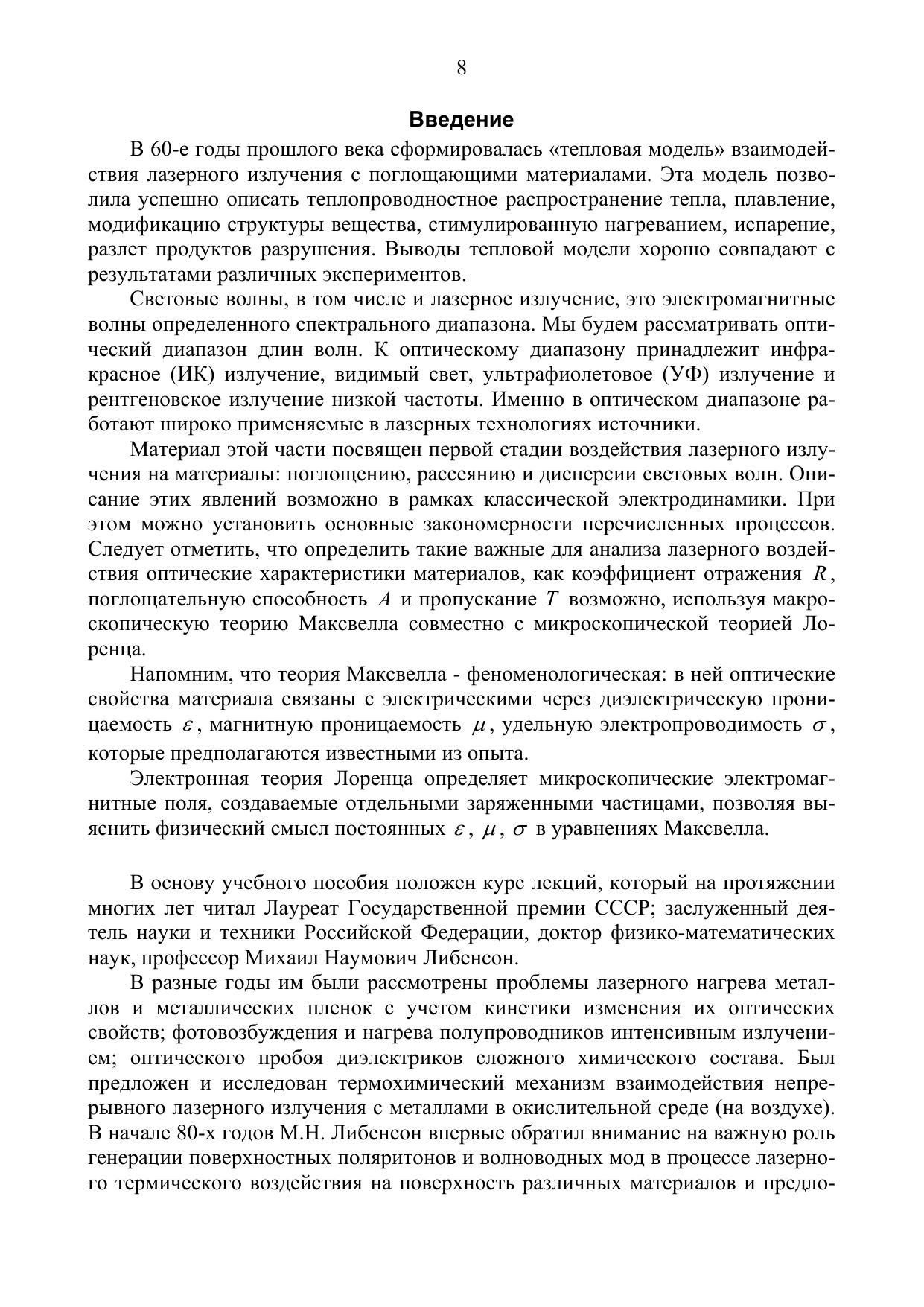 Конспект курса лекций предназначен для самостоятельной работы студентов специальности 072300 «Лазерная техника и лазерные технологии». Часть I конспекта лекций посвящена описанию первой стадии воздействия лазерного излучения на материалы: поглощению, рассеянию и дисперсии световых волн.