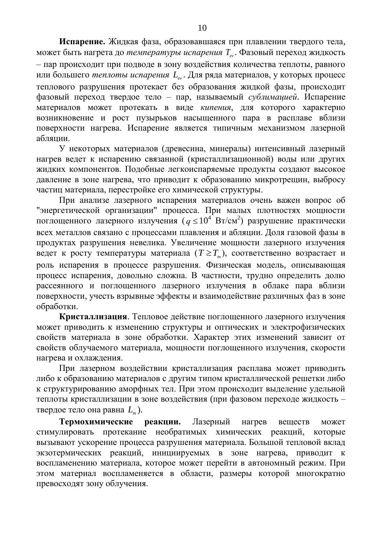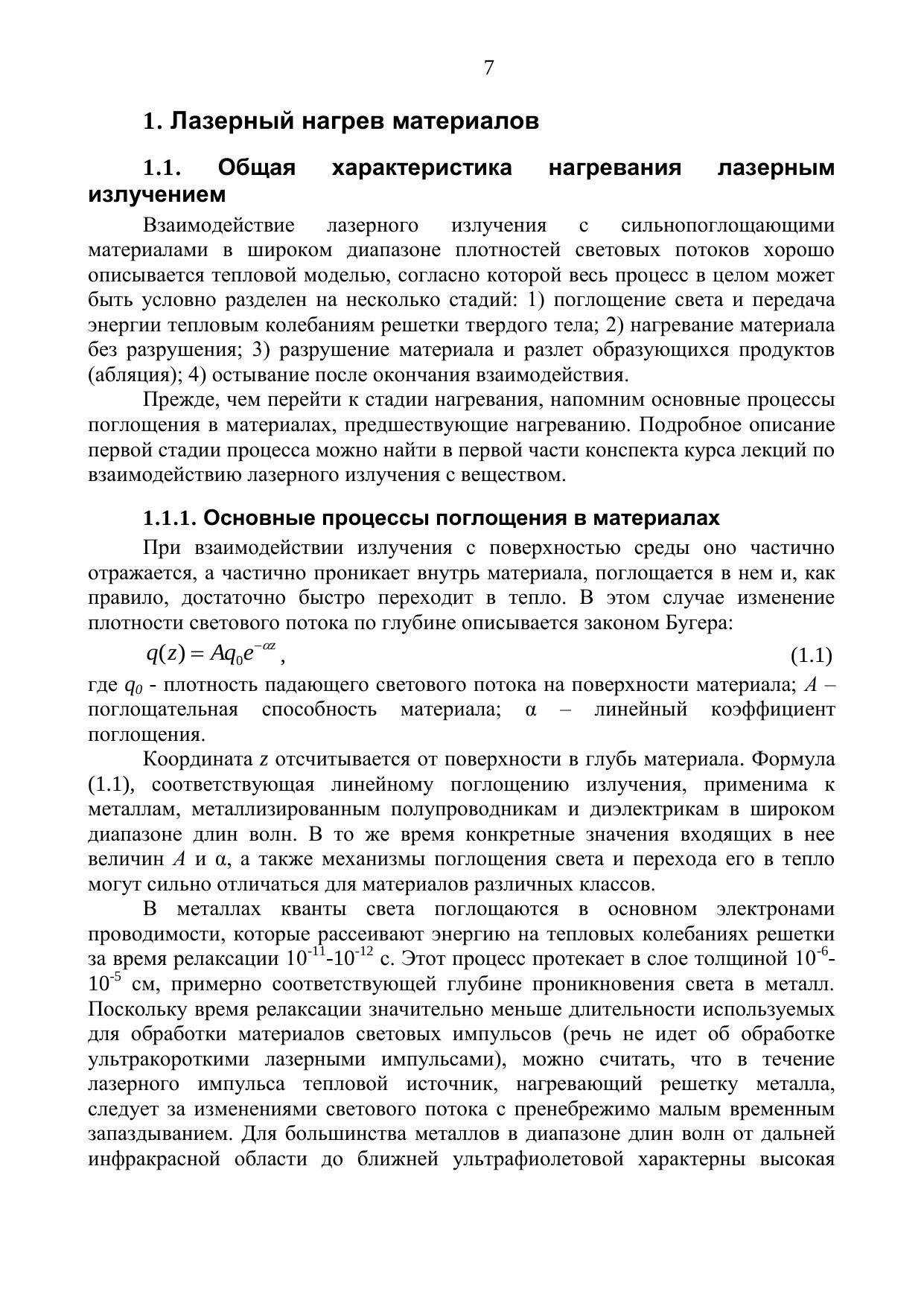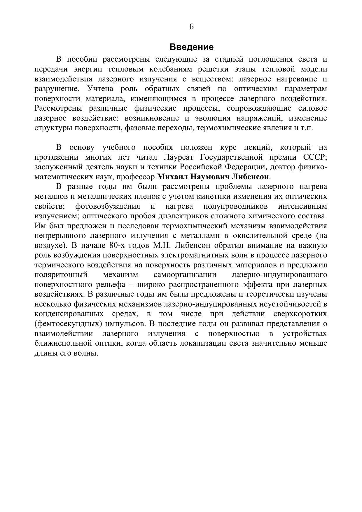 В пособии изложены физические основы нагревания и разрушения металлов, полупроводников и диэлектривов под действием лазерного излучения. Рассмотрены линейные и нелинейные режимы лазерного нагрва, а также особенности воздействия сверхкоротких импульсов на материалы. Учебное пособие предназначено для самостоятельной работы студентов высших учебных заведений, обучающихся по специальности 200201 «Лазерная техника и лазерные технологии», по направлениям подготовки бакалавров 200500 «Лазерная техника и лазерные технологии» и 223200, 140400 «Техническая физика». Материал конспекта будет также полезен для самостоятельной работы магистров и аспирантов, интересующихся нелинейными процессами и вопросами самомодификации поверхности.