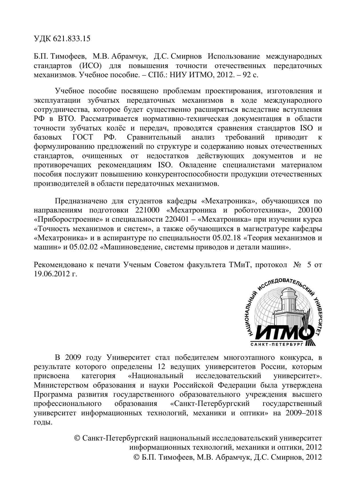 Учебное пособие посвящено проблемам проектирования, изготовления и эксплуатации зубчатых передаточных механизмов в ходе международного сотрудничества, которое будет существенно расширяться вследствие вступления РФ в ВТО. Рассматривается нормативно-техническая документация в области точности зубчатых колёс и передач, проводятся сравнения стандартов ISOи базовых ГОСТ РФ. Сравнительный анализ требований приводит к формулированию предложений по структуре и содержанию новых отечественных стандартов, очищенных от недостатков действующих документов и не противоречащих рекомендациям ISO. Овладение специалистами материалом пособия послужит повышению конкурентоспособности продукции отечественных производителей в области передаточных механизмов. Предназначено для студентов кафедры "Мехатроника", обучающихся по направлениям подготовки 221000 "Мехатроника и робототехника", 200100 "Приборостроение" и специальности 220401 - "Мехатроника" при изучении курса "Точность механизмов и систем", а также обучающихся в магистратуре кафедры "Мехатроника" и в аспирантуре по специальности 05.02.18 "Теория механизмов и машин" и 05.02.02 "Машиноведение, системы приводов и детали машин".