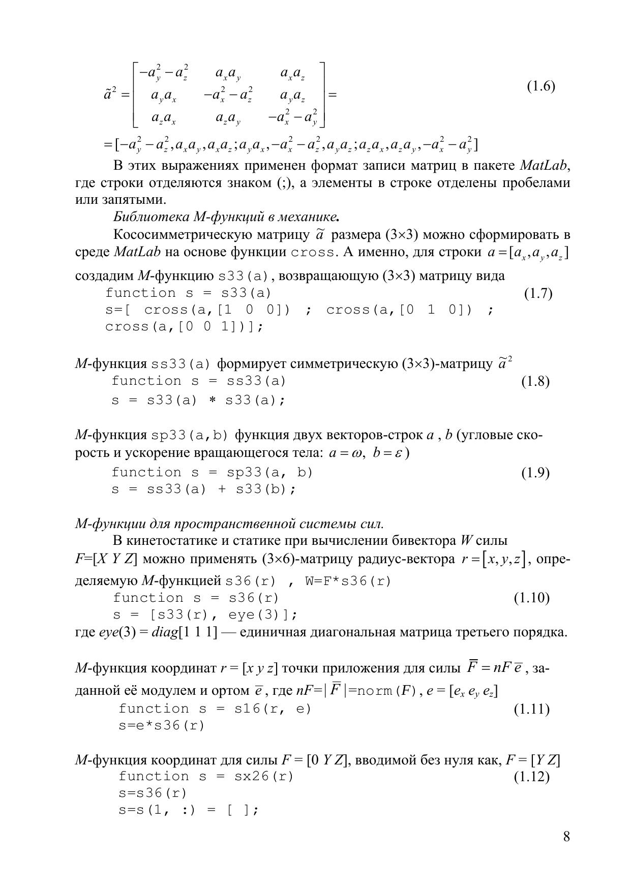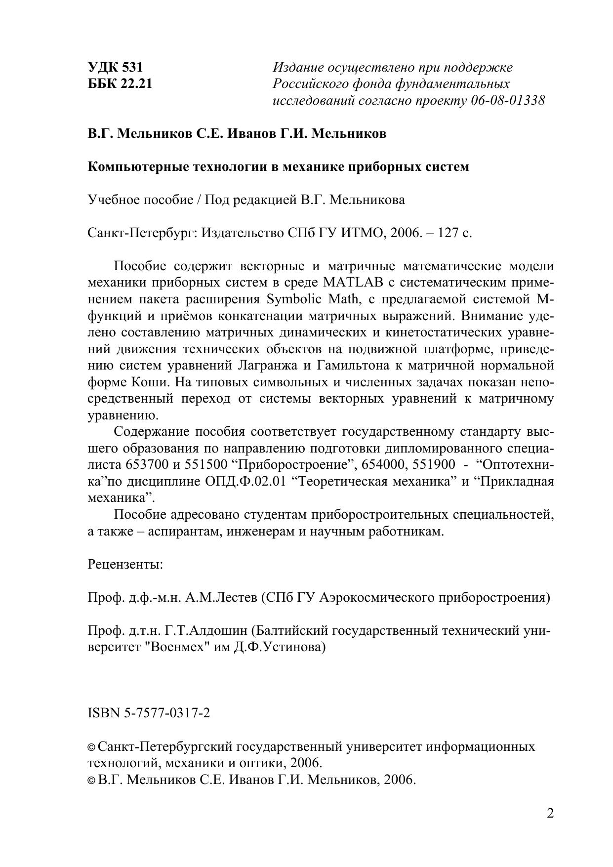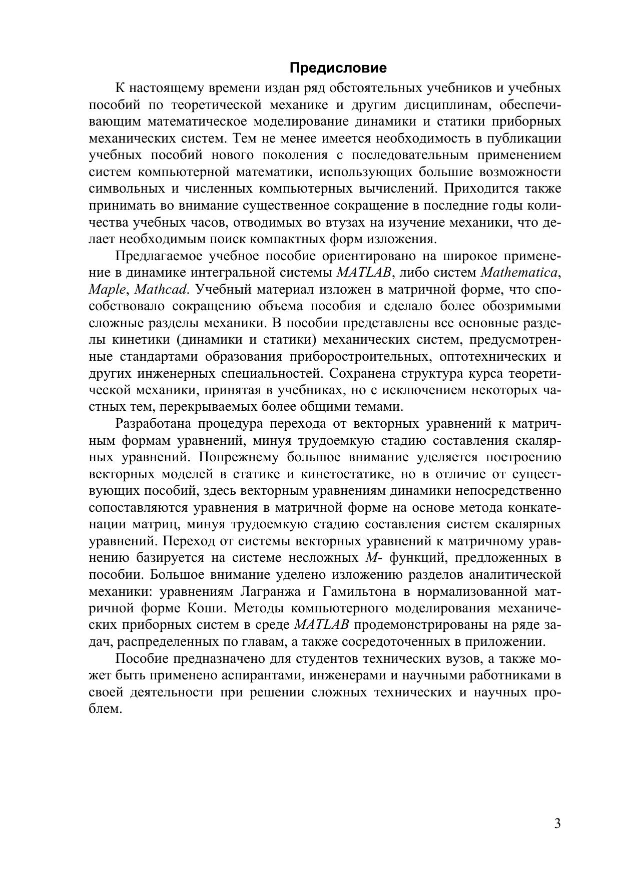 Пособие содержит векторные и матричные математические модели механики приборных систем в среде MATLAB с систематическим применением пакета расширения Symbolic Math, с предлагаемой системой М-функций и приёмов конкатенации матричных выражений. Внимание уделено составлению матричных динамических и кинетостатических уравнений движения технических объектов на подвижной платформе, приведению систем уравнений Лагранжа и Гамильтона к матричной нормальной форме Коши. На типовых символьных и численных задачах показан непосредственный переход от системы векторных уравнений к матричному уравнению.