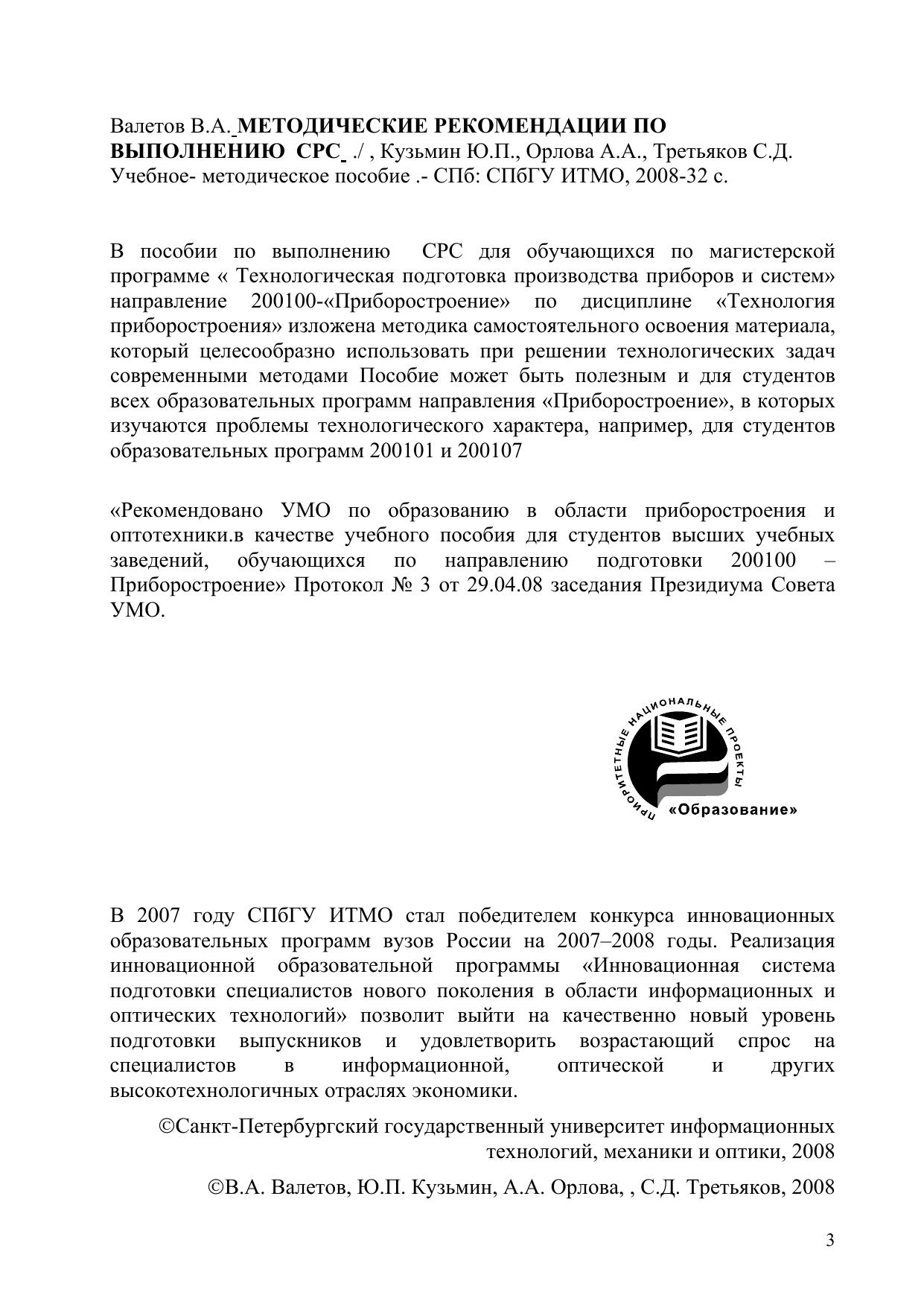 В пособии по выполнению СРС для обучающихся по магистерской программе « Технологическая подготовка производства приборов и систем» направление 200100 - «Приборостроение» по дисциплине «Технология приборостроения» изложена методика самостоятельного освоения материала, который целесообразно использовать при решении технологических задач современными методами Пособие может быть полезным и для студентов всех образовательных программ направления «Приборостроение», в которых изучаются проблемы технологического характера, например, для студентов образовательных программ 200101 и 200107.