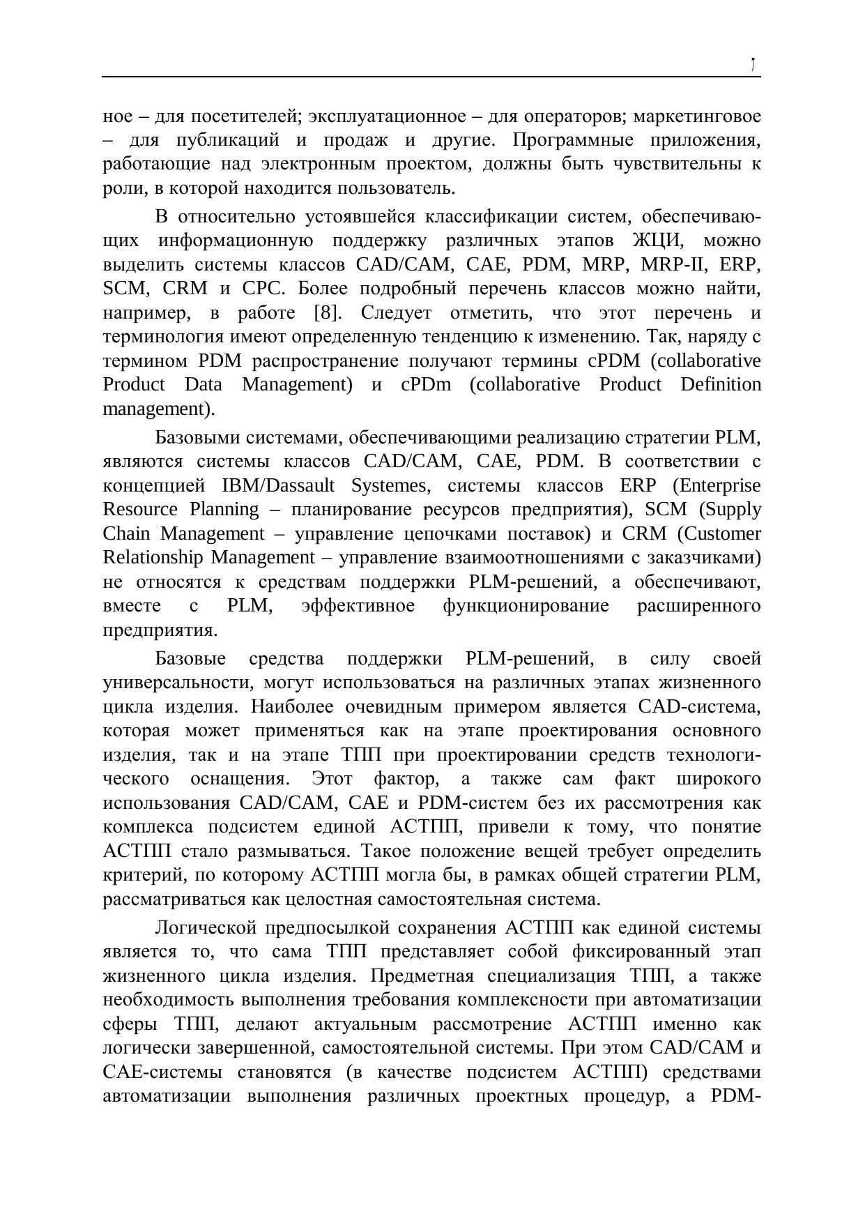 В данном учебном пособии рассматриваются методологические основы построения автоматизированных систем технологической подготовки производства (АСТПП) в приборостроении. Формулируются основные принципы построения архитектуры АСТПП с учетом тенденций развития современного промышленного производства и новых информационных технологий, предназначенных для его автоматизации. Рассматриваются организационные аспекты создания АСТПП с учетом использования принципов реинжиниринга бизнес-процессов. Даются рекомендации по использованию графического языка UML для визуального моделирования предметной области и бизнес-процессов ТИП. Рассматривается методика организации единого информационного пространства ТИП на базе построения моделей UML и их последующей реализации средствами PDM-системы. Приводятся схемы ведения конструкторских и технологических проектов средствами PDM-системы в едином информационном пространстве ТИП.