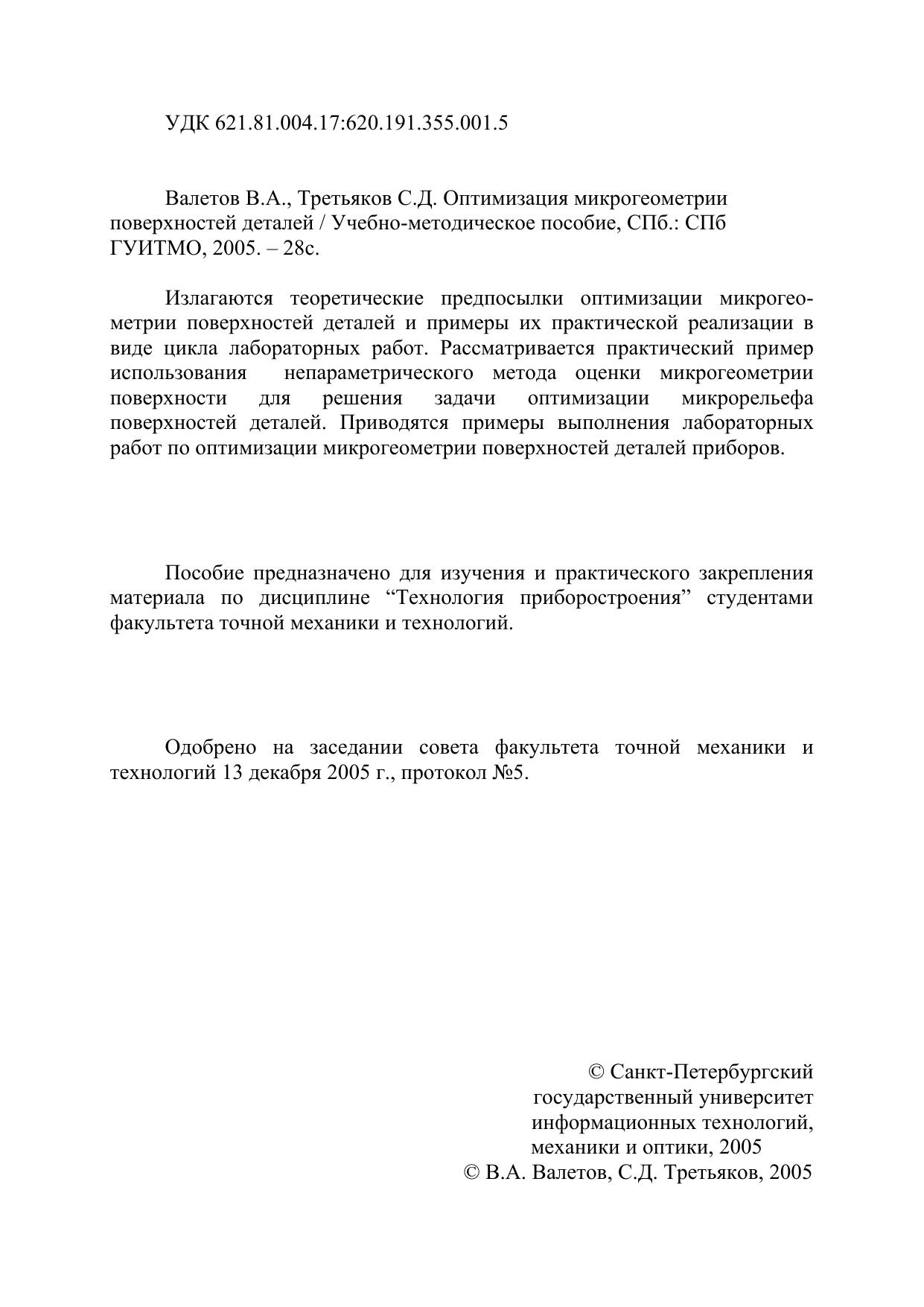 Излагаются теоретические предпосылки оптимизации микрогеометрии поверхностей деталей и примеры их практической реализации в виде цикла лабораторных работ. Рассматривается практический пример использования непараметрического метода оценки микрогеометрии поверхности для решения задачи оптимизации микрорельефа поверхностей деталей. Приводятся примеры выполнения лабораторных работ по оптимизации микрогеометрии поверхностей деталей приборов.Пособие предназначено для изучения и практического закрепления материала по дисциплине "Технология приборостроения" студентами факультета точной механики и технологий.