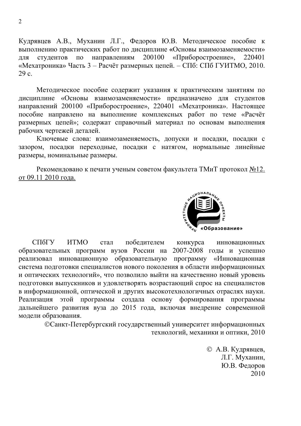 Методическое пособие содержит указания к практическим занятиям по дисциплине «Основы взаимозаменяемости» предназначено для студентов направлений 200100 «Приборостроение», 220401 «Мехатроника». Настоящее пособие направлено на выполнение комплексных работ по теме «Расчёт размерных цепей»; содержат справочный материал по основам выполнения рабочих чертежей деталей.