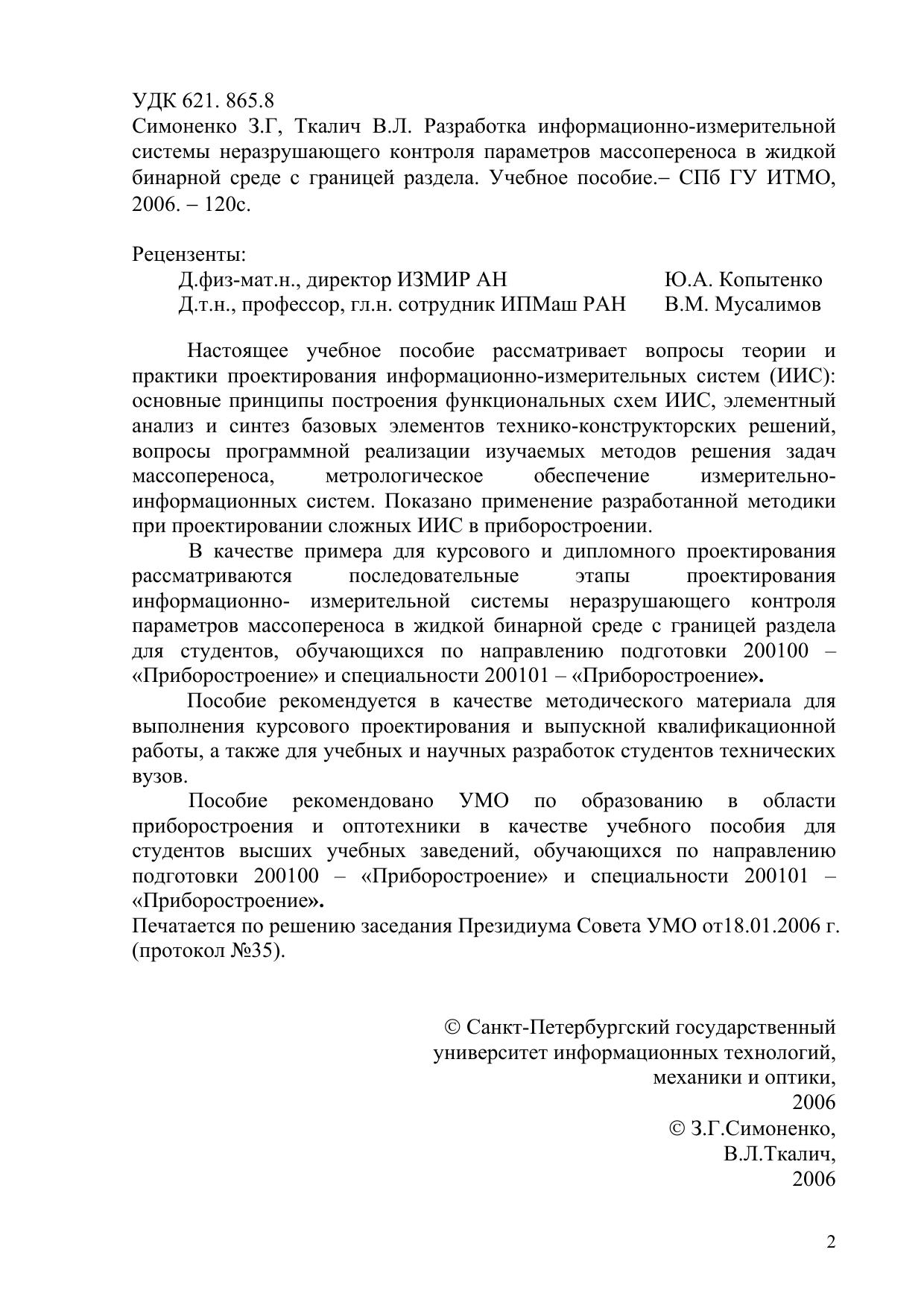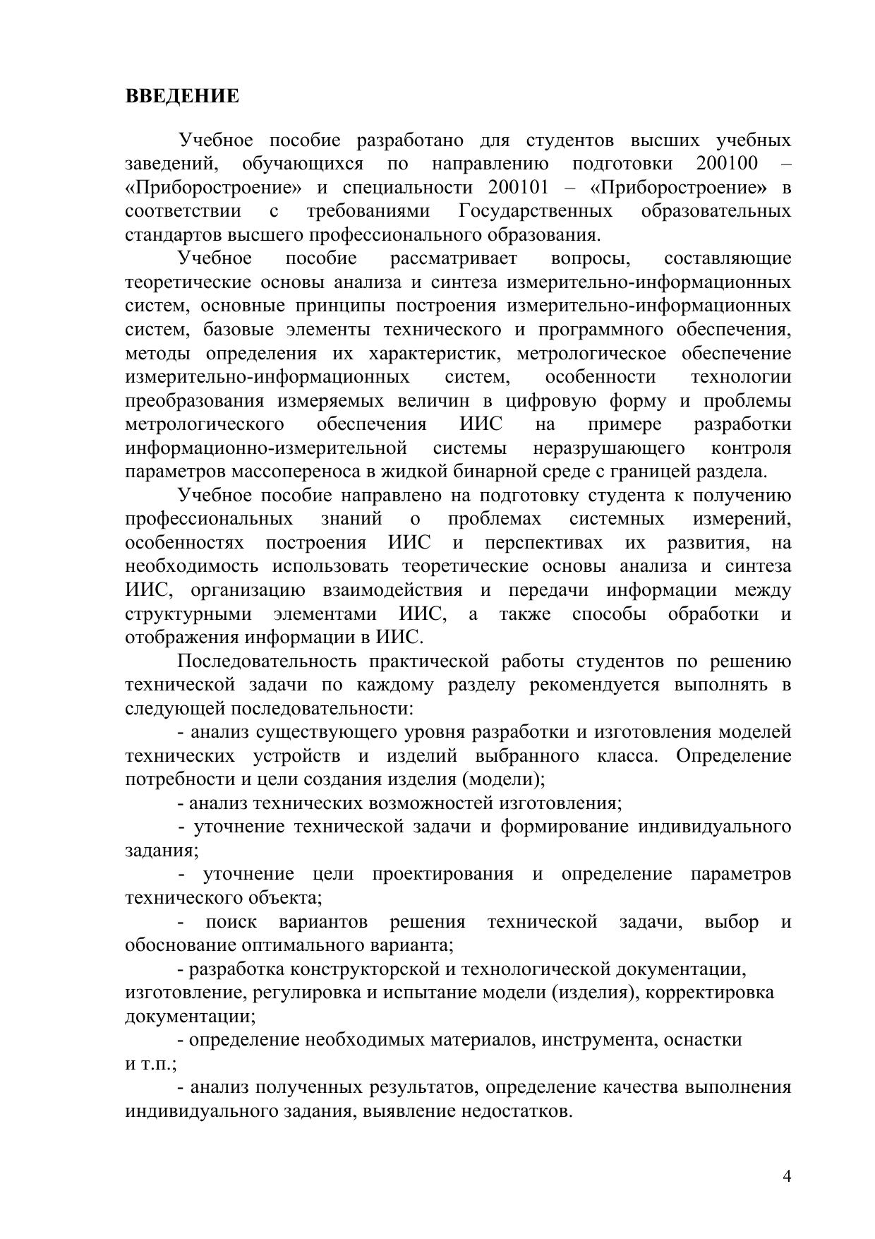 Настоящее учебное пособие рассматривает вопросы теории и практики проектирования информационно-измерительных систем (ИИС): основные принципы построения функциональных схем ИИС, элементный анализ и синтез базовых элементов технико-конструкторских решений, вопросы программной реализации изучаемых методов решения задач массопереноса, метрологическое обеспечение измерительно-информационных систем. Показано применение разработанной методикипри проектировании сложных ИИС в приборостроении. В качестве примера для курсового и дипломного проектирования рассматриваются последовательные этапы проектирования информационно- измерительной системы неразрушающего контроля параметров массопереноса в жидкой бинарной среде с границей раздела для студентов, обучающихся по направлению подготовки 200100 – «Приборостроение» и специальности 200101 – «Приборостроение». Пособие рекомендуется в качестве методического материала для выполнения курсового проектирования и выпускной квалификационной работы, а также для учебных и научных разработок студентов технических вузов.