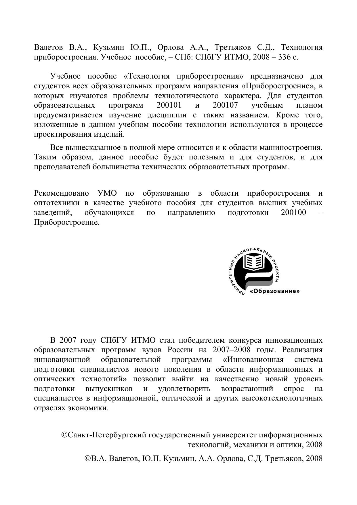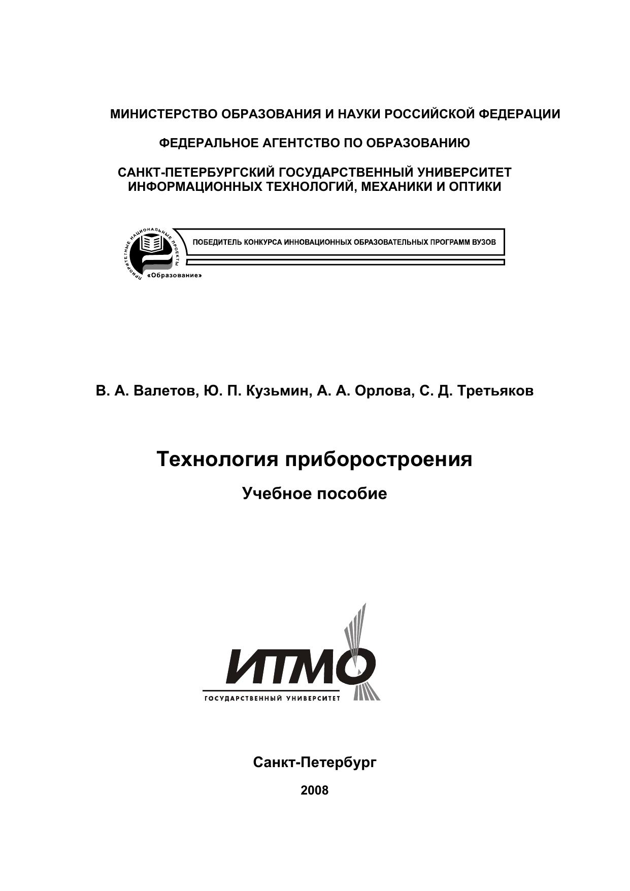 Учебное пособие «Технология приборостроения» предназначено для студентов всех образовательных программ направления «Приборостроение», в которых изучаются проблемы технологического характера. Для студентов образовательных программ 200101 и 200107 учебным планом предусматривается изучение дисциплин с таким названием. Кроме того, изложенные в данном учебном пособии технологии используются в процессе проектирования изделий.