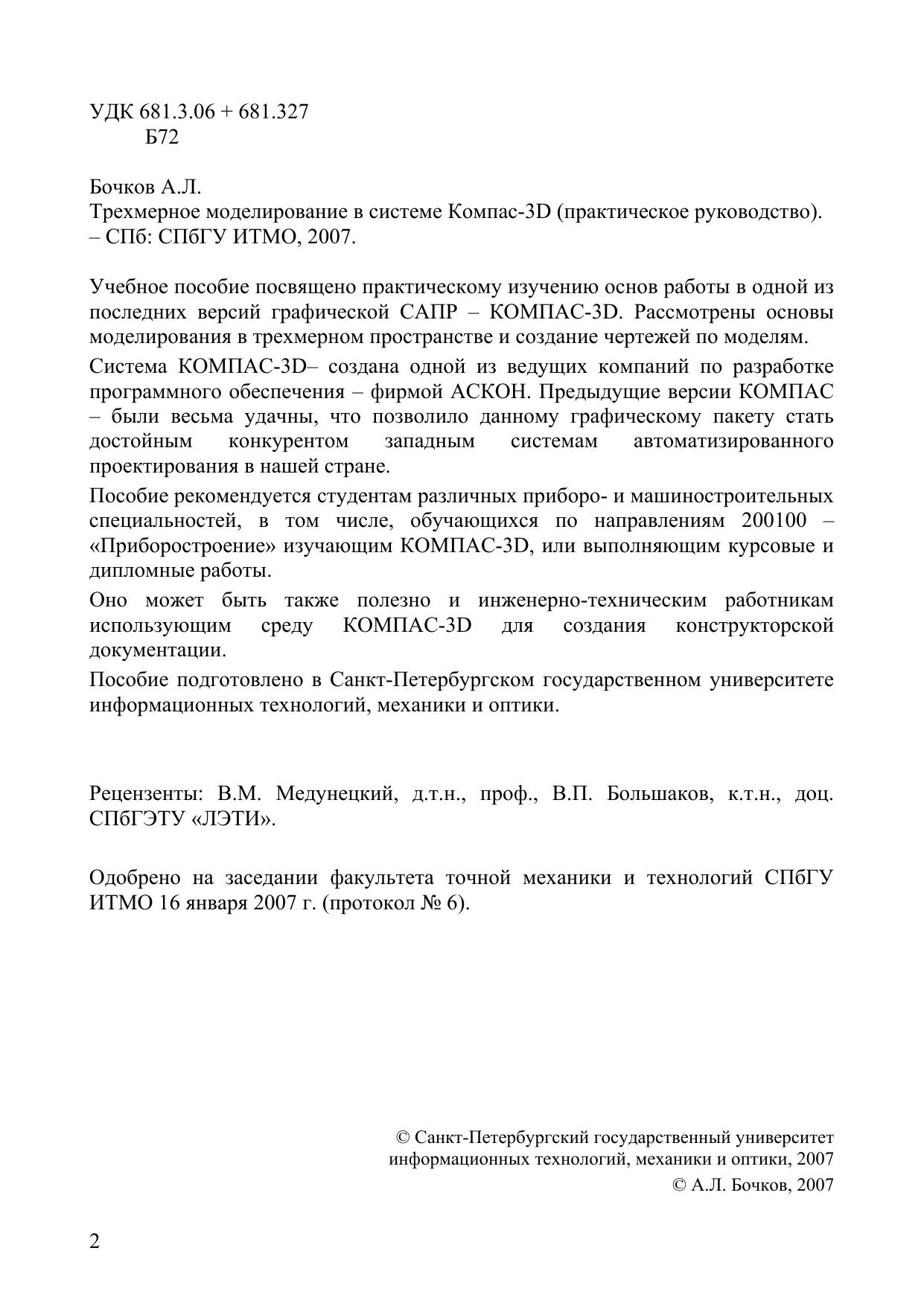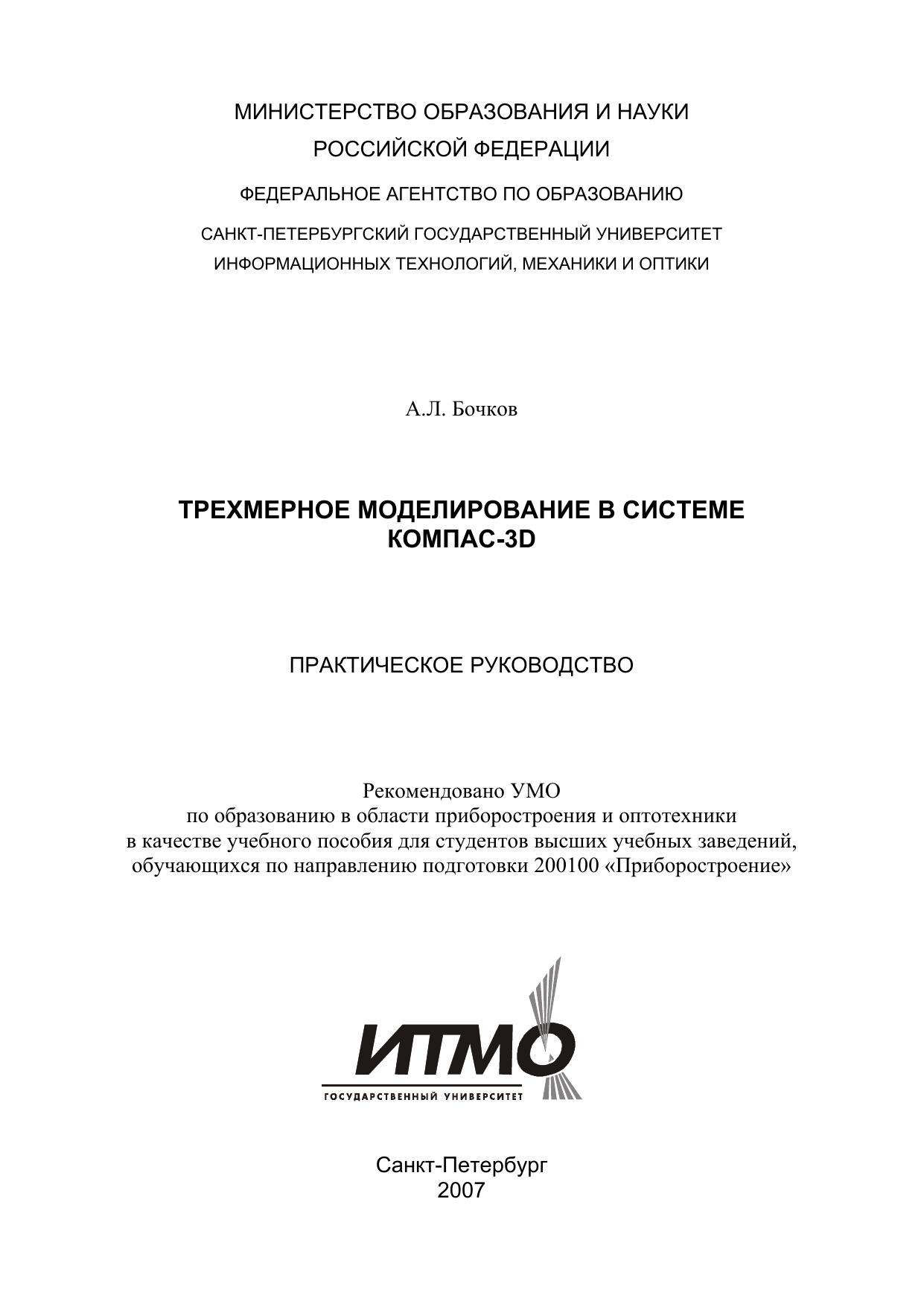 Учебное пособие посвящено практическому изучению основ работы в одной из последних версий графической САПР – КОМПАС-3D. Рассмотрены основы моделирования в трехмерном пространстве и создание чертежей по моделям. Система КОМПАС-3D– создана одной из ведущих компаний по разработке программного обеспечения – фирмой АСКОН. Предыдущие версии КОМПАС– были весьма удачны, что позволило данному графическому пакету стать достойным конкурентом западным системам автоматизированного проектирования в нашей стране. Пособие рекомендуется студентам различных приборо- и машиностроительных специальностей, в том числе, обучающихся по направлениям 200100 – «Приборостроение» изучающим КОМПАС-3D, или выполняющим курсовые и дипломные работы. Оно может быть также полезно и инженерно-техническим работникам использующим среду КОМПАС-3D для создания конструкторской документации.