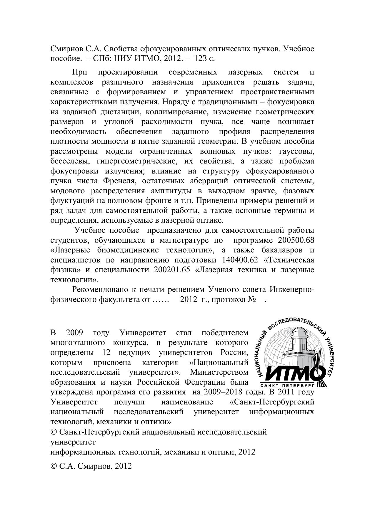 При проектировании современных лазерных систем и комплексов различного назначения приходится решать задачи, связанные с формированием и управлением пространственными характеристиками излучения. Наряду с традиционными – фокусировка на заданной дистанции, коллимирование, изменение геометрических размеров и угловой расходимости пучка, все чаще возникает необходимость обеспечения заданного профиля распределения плотности мощности в пятне заданной геометрии. В учебном пособии рассмотрены модели ограниченных волновых пучков: гауссовы, бесселевы, гипергеометрические, их свойства, а также проблема фокусировки излучения влияние на структуру сфокусированного пучка числа Френеля, остаточных аберраций оптической системы, модового распределения амплитуды в выходном зрачке, фазовых флуктуаций на волновом фронте и т.п. Приведены примеры решений и ряд задач для самостоятельной работы, а также основные термины иопределения, используемые в лазерной оптике. Учебное пособие предназначено для самостоятельной работы студентов, обучающихся в магистратуре по программе 200500.68 «Лазерные биомедицинские технологии», а также бакалавров и специалистов по направлению подготовки 140400.62 «Техническая физика» и специальности 200201.65 «Лазерная техника и лазерные технологии».