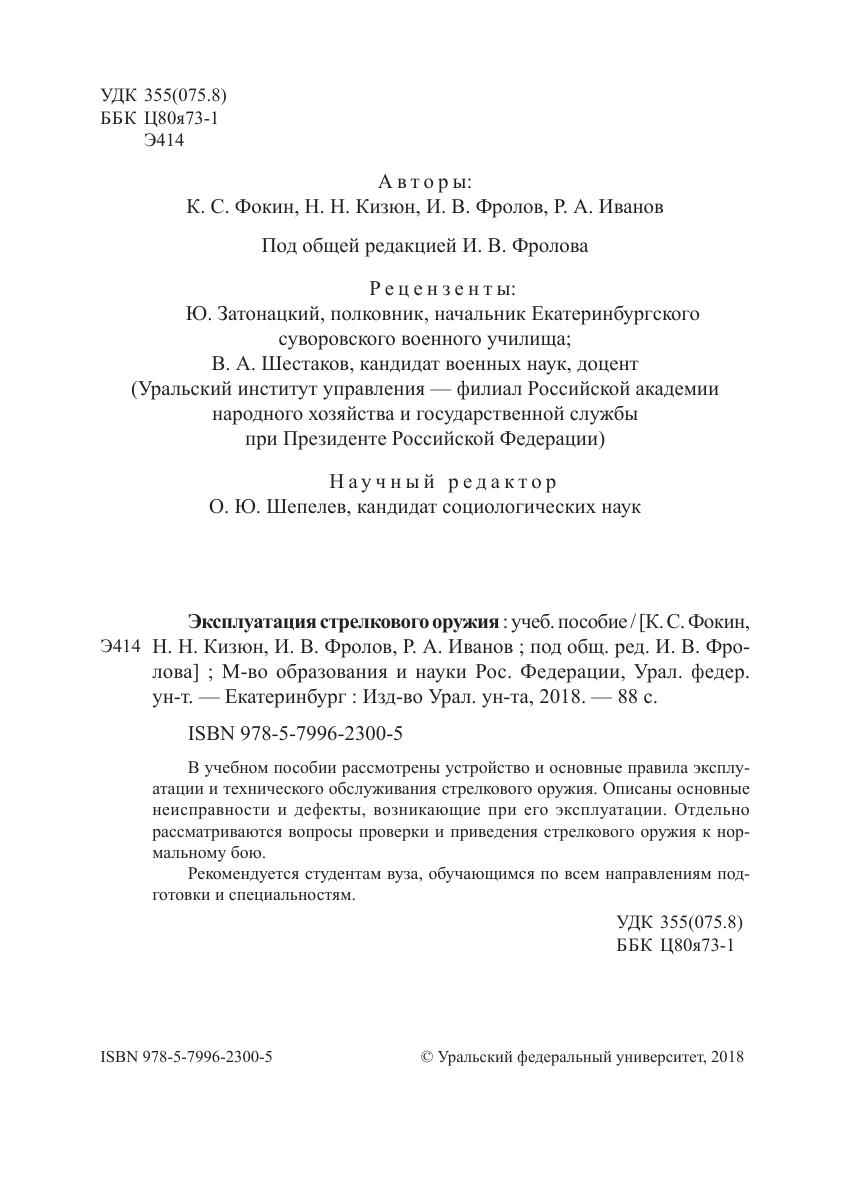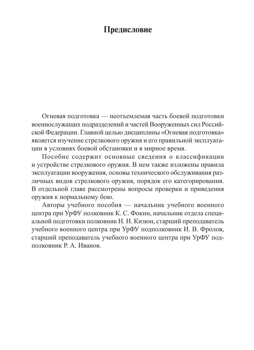 В учебном пособии рассмотрены устройство и основные правила эксплуатации и технического обслуживания стрелкового оружия. Описаны основные неисправности и дефекты, возникающие при его эксплуатации. Отдельно рассматриваются вопросы проверки и приведения стрелкового оружия к нормальному бою. Рекомендуется студентам вуза, обучающимся по всем направлениям подготовки и специальностям.